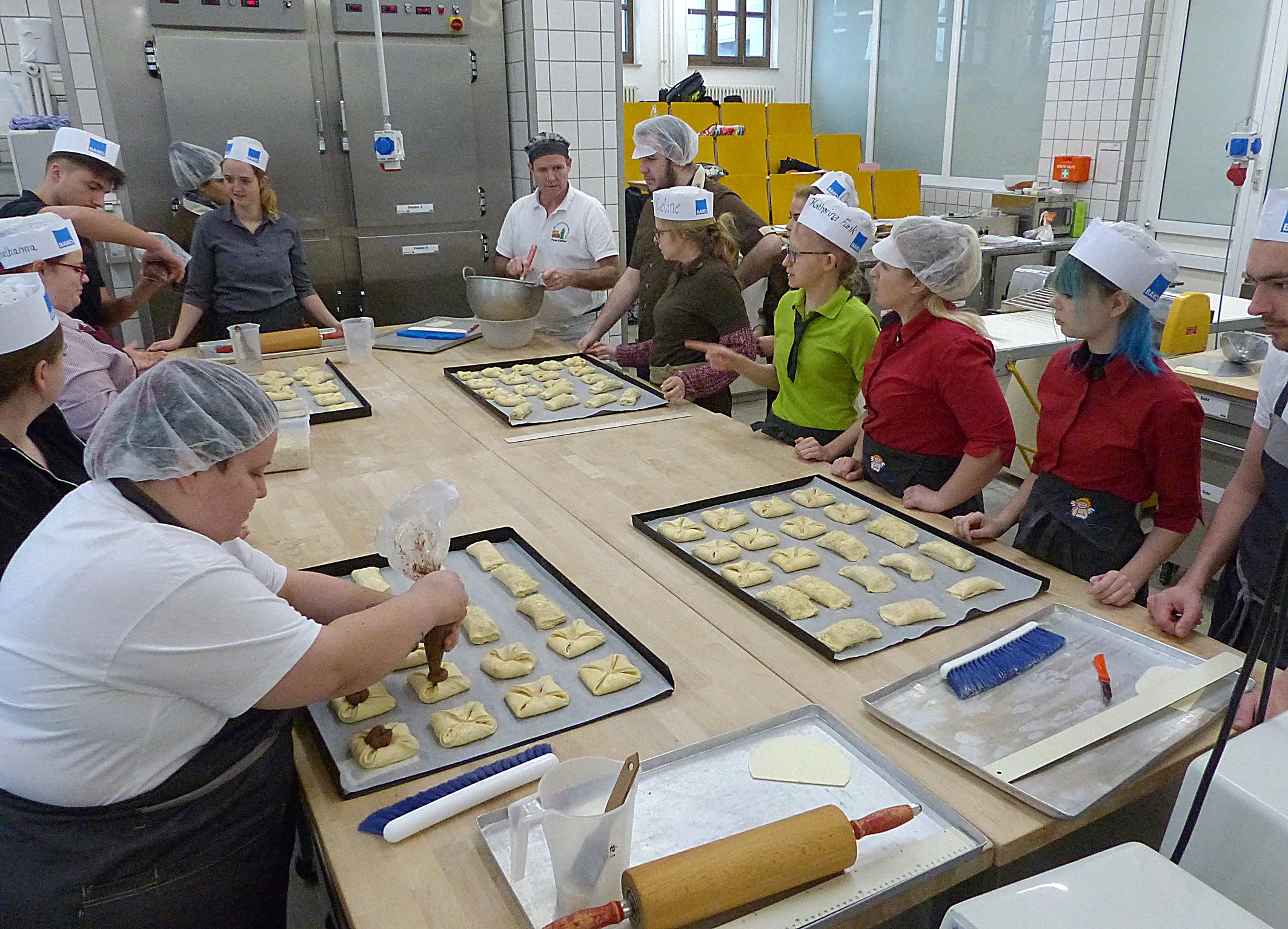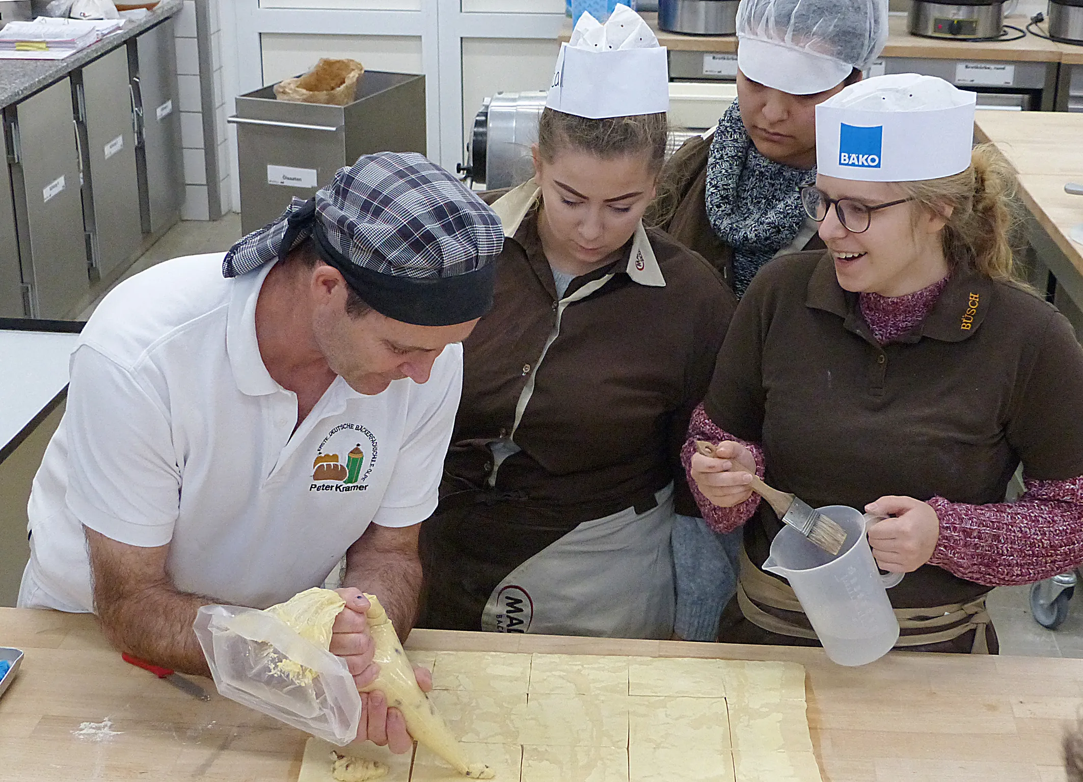 Zur gleichen Zeit im Hör- und Werksaal von Konditormeister und Betriebswirt des Handwerks Peter Kramer. Angehende Bäckereifachverkäufer(innen) werden hier geschult und auch hier sind junge Leute jeder Herkunft im Kurs. „Handwerk muss was Besonderes bieten“, erklärt ihnen Peter Kramer sein Credo und vermittelt Warenkunde und Handhabung. „Sie müssen das, was sie verkaufen, durch und durch kennen und wissen, wie es produziert wird.“ So entstehen an diesem Morgen Lebkuchen mit Bratapfelfüllung und Plunderteilchen mit köstlichem Inhalt und verführerischer Optik. „Wir machen nicht 08/15, sondern was Tolles“, gibt der Konditormeister die Parole aus.
