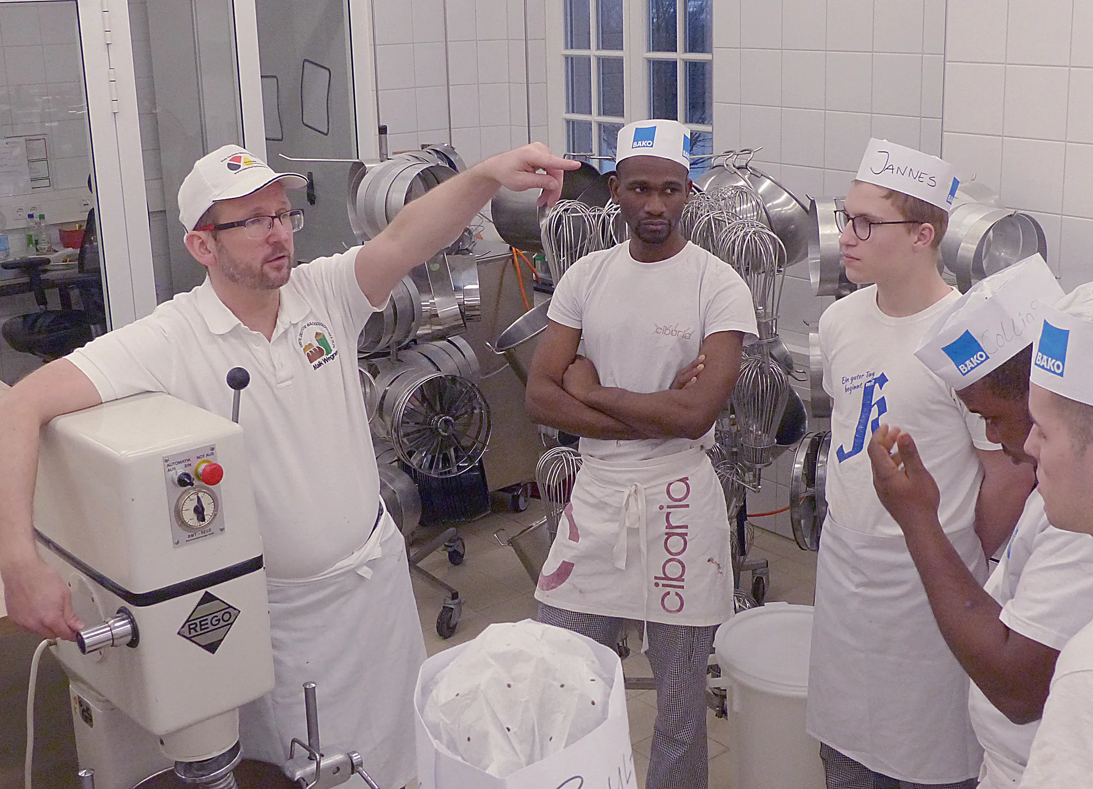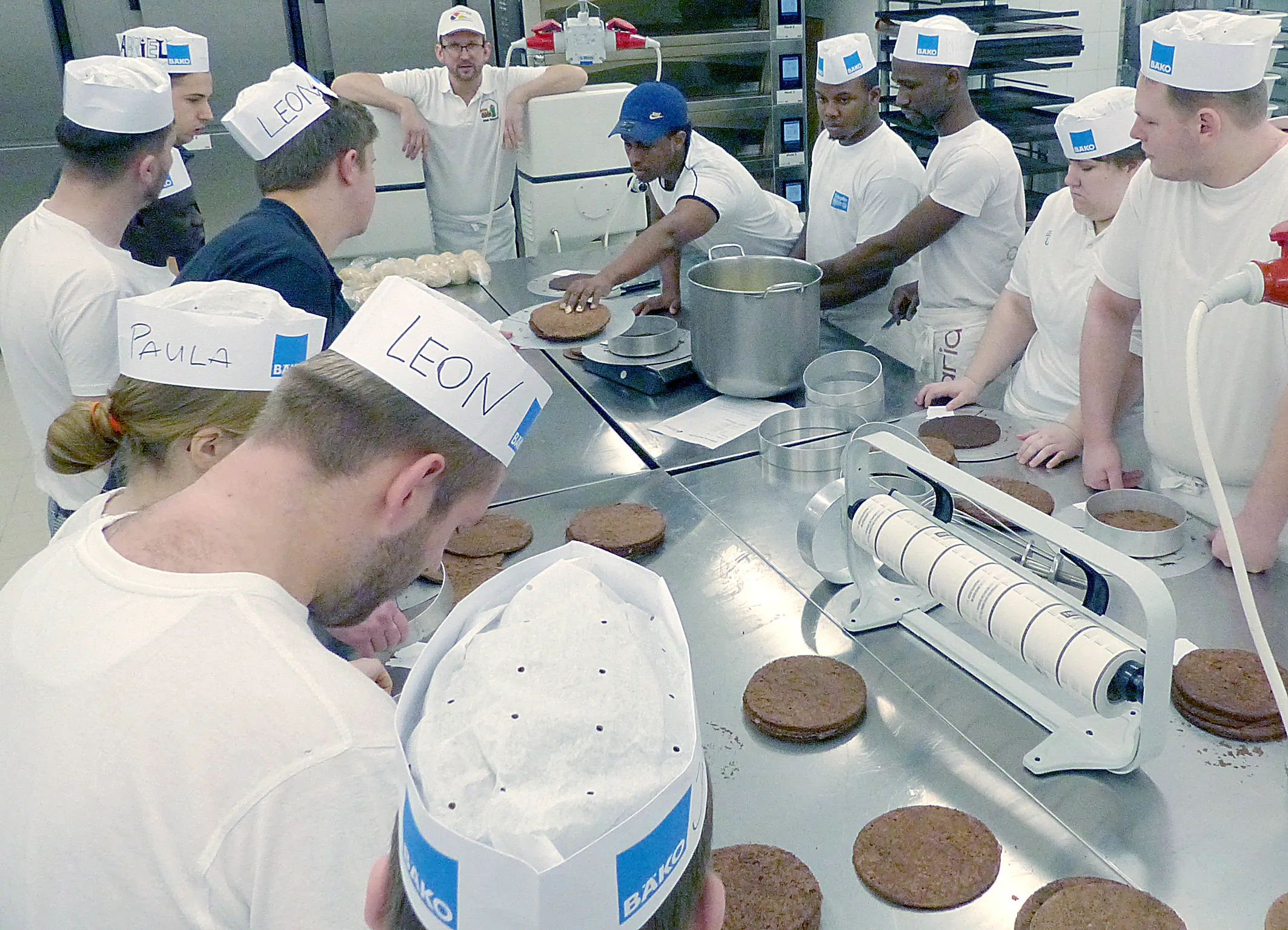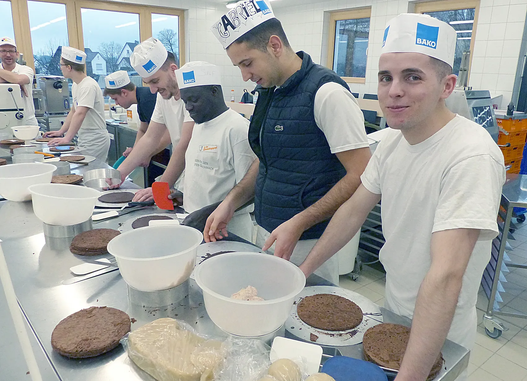 Deutsches Brot in all‘ seiner geschmacklichen Vielfalt ist seit 2014 von der UNESCO als immaterielles Kulturgut eingetragen worden. Dass aber hinter dem national beheimateten Lebensmittel Macher aus aller Herren Länder stehen, erkennt man, wenn man in einen Lehrgang hineinschnuppert. Wir sind in der „ÜBL“ mit Bäckerlehrlingen des dritten Ausbildungsjahres aus dem Münsterland. Hier unterichtet ein Bäckermeister und Brotsommelier. Er hat sich mit seinen Schülerinnen und Schülern eine Buttercremetorte mit einer Glühweinnote und Marzipanüberzug vorgenommen. Auch dies ist eine typisch deutsche Tortenkreation, doch die jungen Damen und Herren, die am großen Werktisch versammelt sind, vereinen in sich noch deutlich mehr als „nur“ Europa. Auf ihren Bäckermützen stehen jeweils die Vornamen und da finden sich Mohamed und Salif neben Bledar und Paula und gleich zwei Leons, um nur einige Beispiele zu nennen. Jeder arbeitet mit jedem, alle sind ein Team. Es bietet sich ein schönes Bild in einer angenehmen, kollegial-menschlichen Arbeitsatmosphäre.