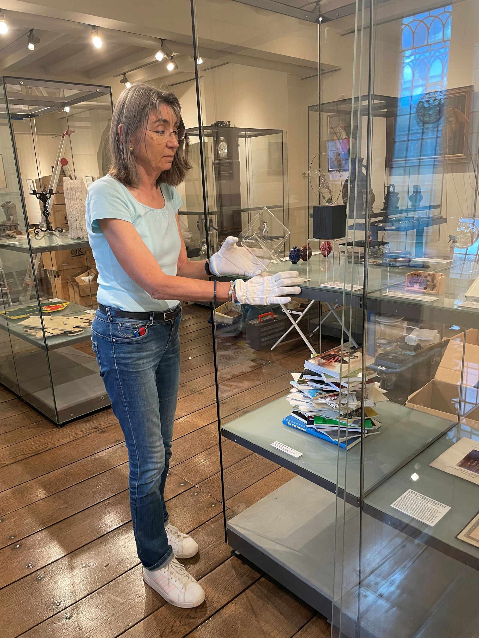 Es folgt der Blick auf die Kernaufgaben eines Museums ─ sammeln, bewahren, ausstellen und vermitteln. Gezeigt werden Neuerwerbungen aus einzelnen Perioden, historische Bestandsbücher und ein Reliefblock aus dem jüngst restaurierten spätgotischen Herscheider Altar neben einem Foto seines ruinösen Zustandes von 1908. Zwei Monitore lassen vergangene Ausstellungen wiederauferstehen und präsentieren die Arbeit der Museumspädagogik. Komplettiert werden sie durch museumspädagogisches Material, Ergebnisse einiger Ferienprojekte mit Kindern, Publikationen zu früheren Ausstellungen und ein paar an sie erinnernde Objekte. Die meisten Exponate stammen aus den Depots der Museen und dem Kreisarchiv des Märkischen Kreises mit der landeskundlichen Bibliothek.