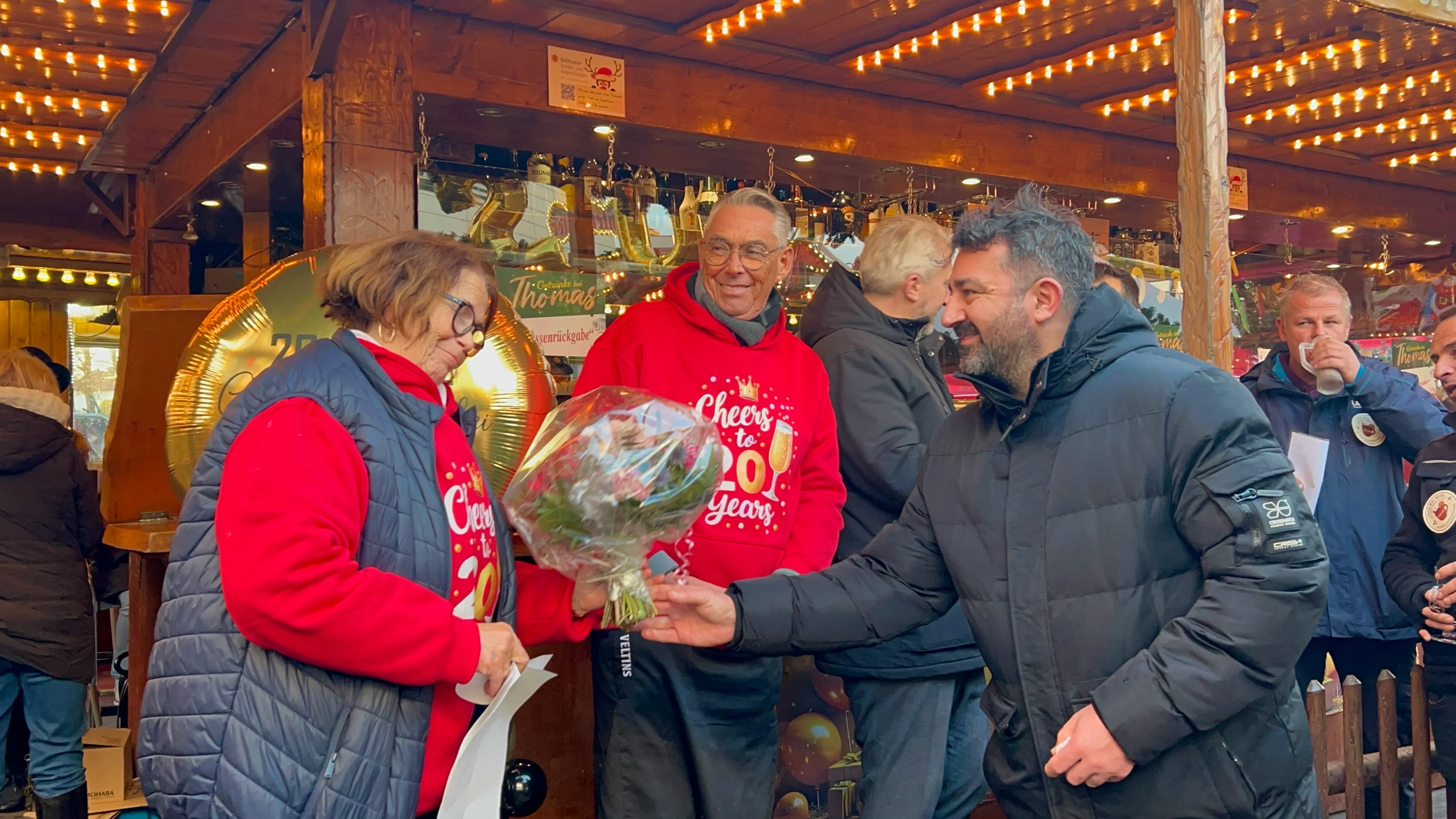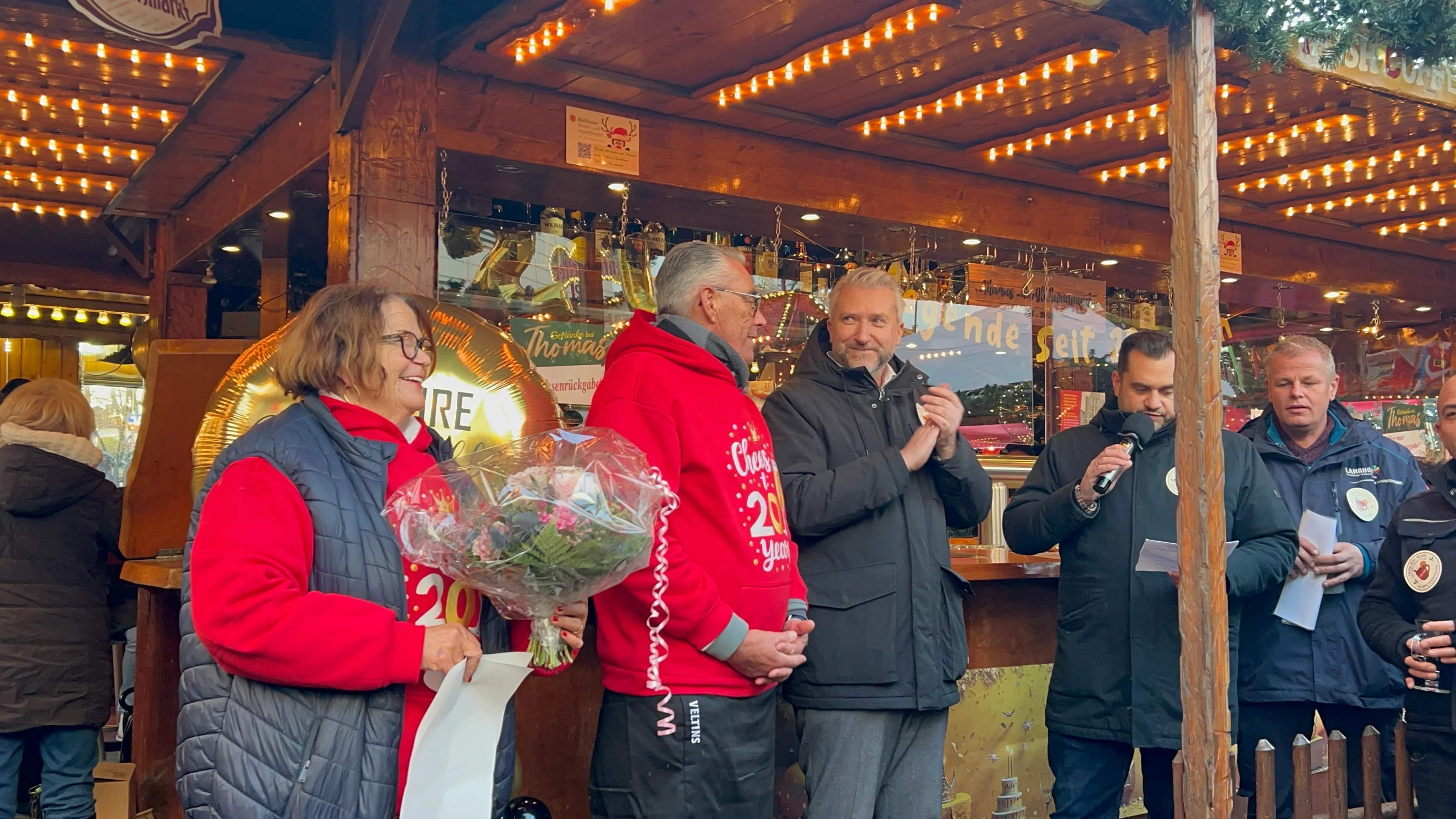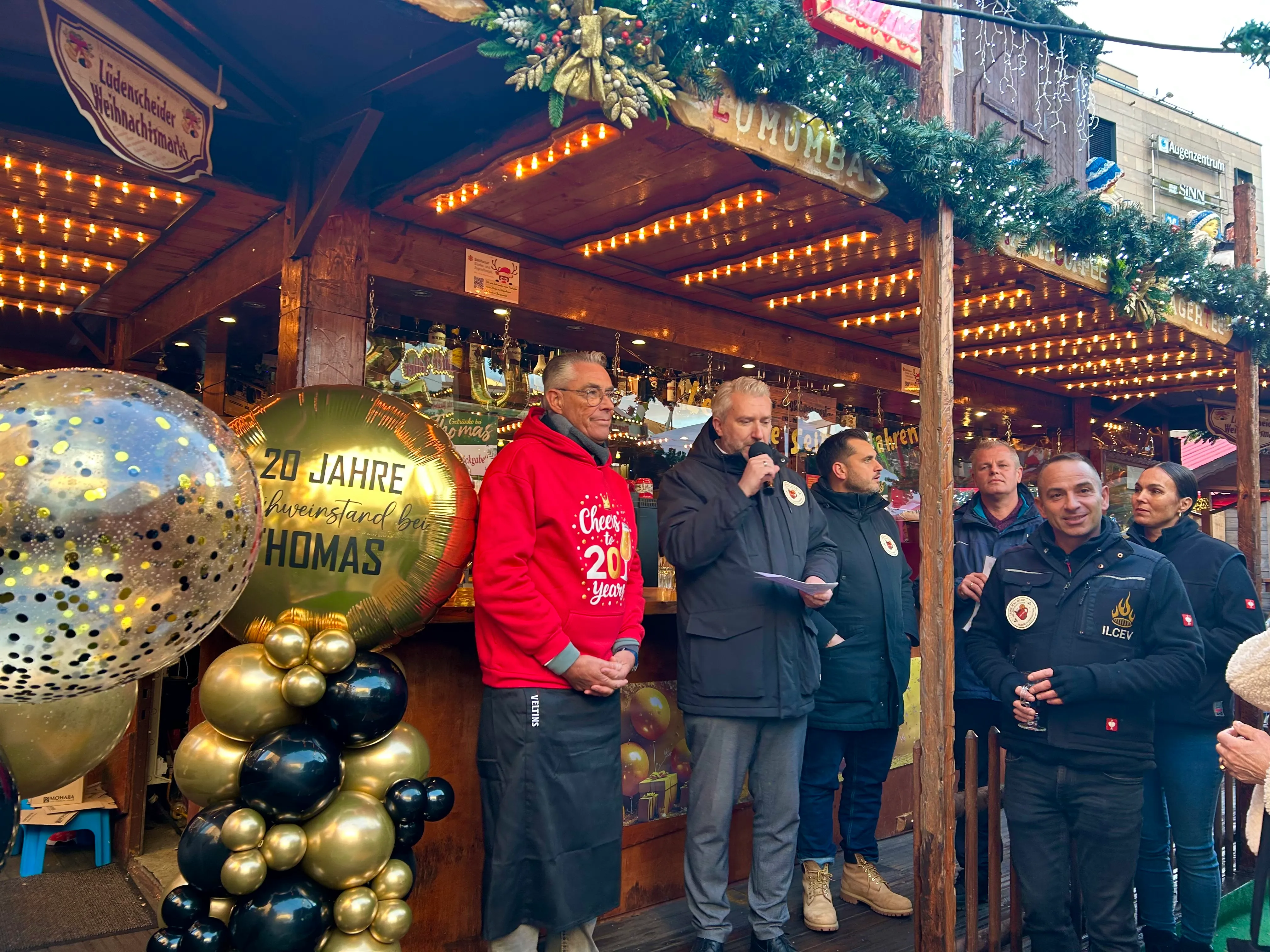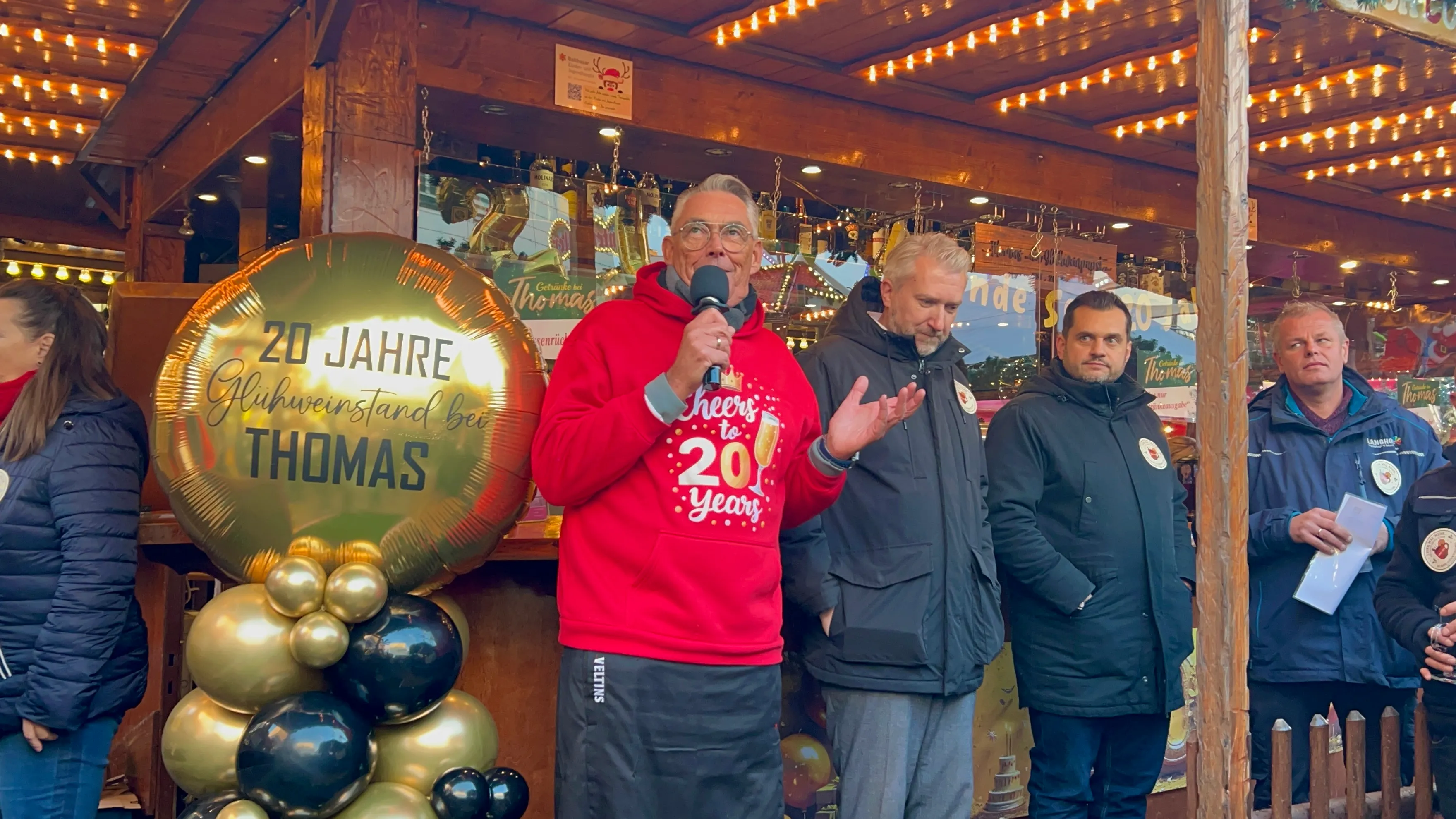 Abschließend ergriff Standbesitzer Thomas Jacobs selbst das Wort und drückte seine Dankbarkeit über sein 20-jähriges Jubiläum aus. Er erinnerte an die Anfänge des Weihnachtsmarktes zurück. Über seinen Stand sagte er fröhlich: „Hier fangen Weihnachtsfeiern an, und hier hören sie auch manchmal auf. Wir haben hier Gemütlichkeit geschaffen.“