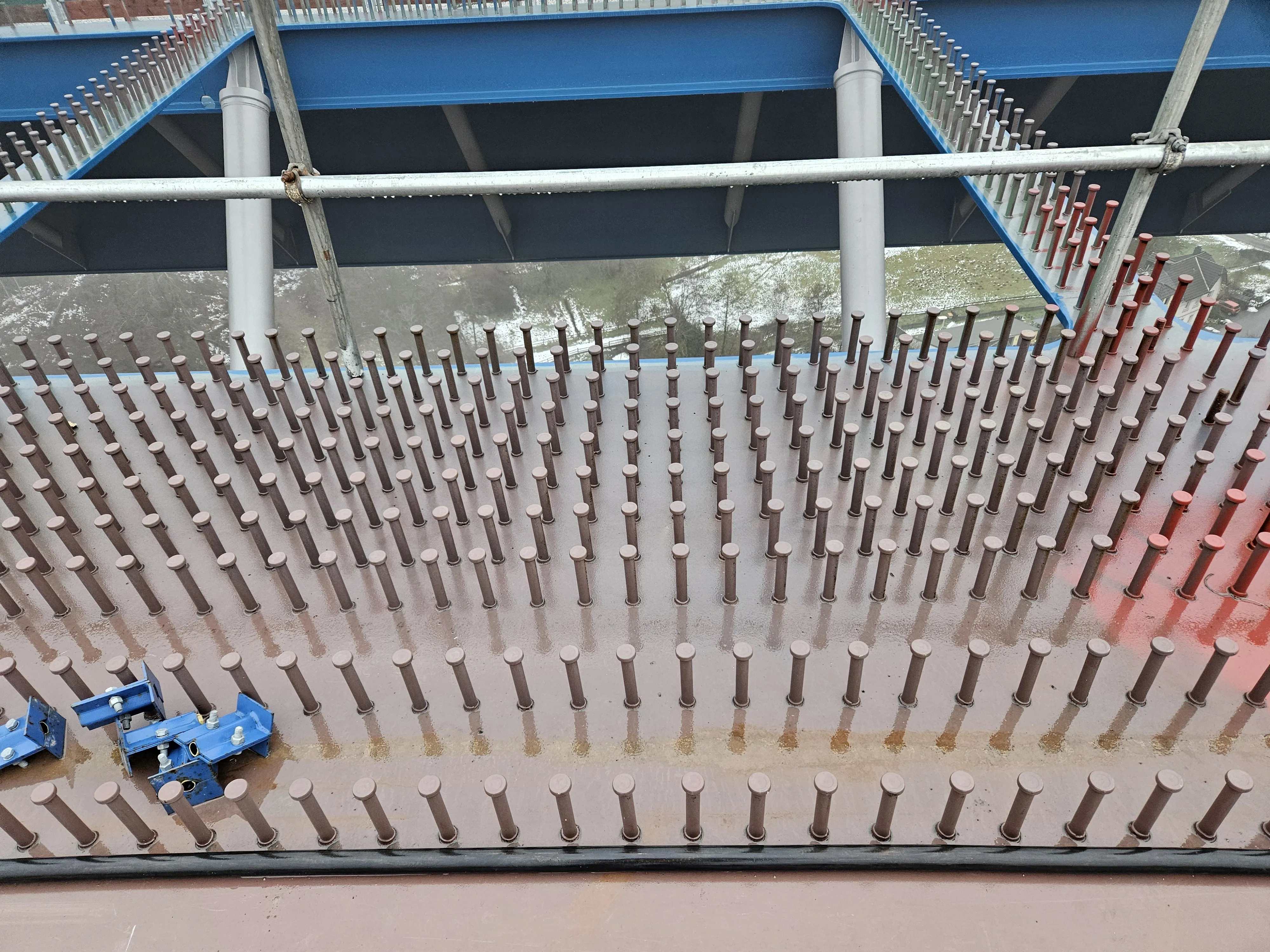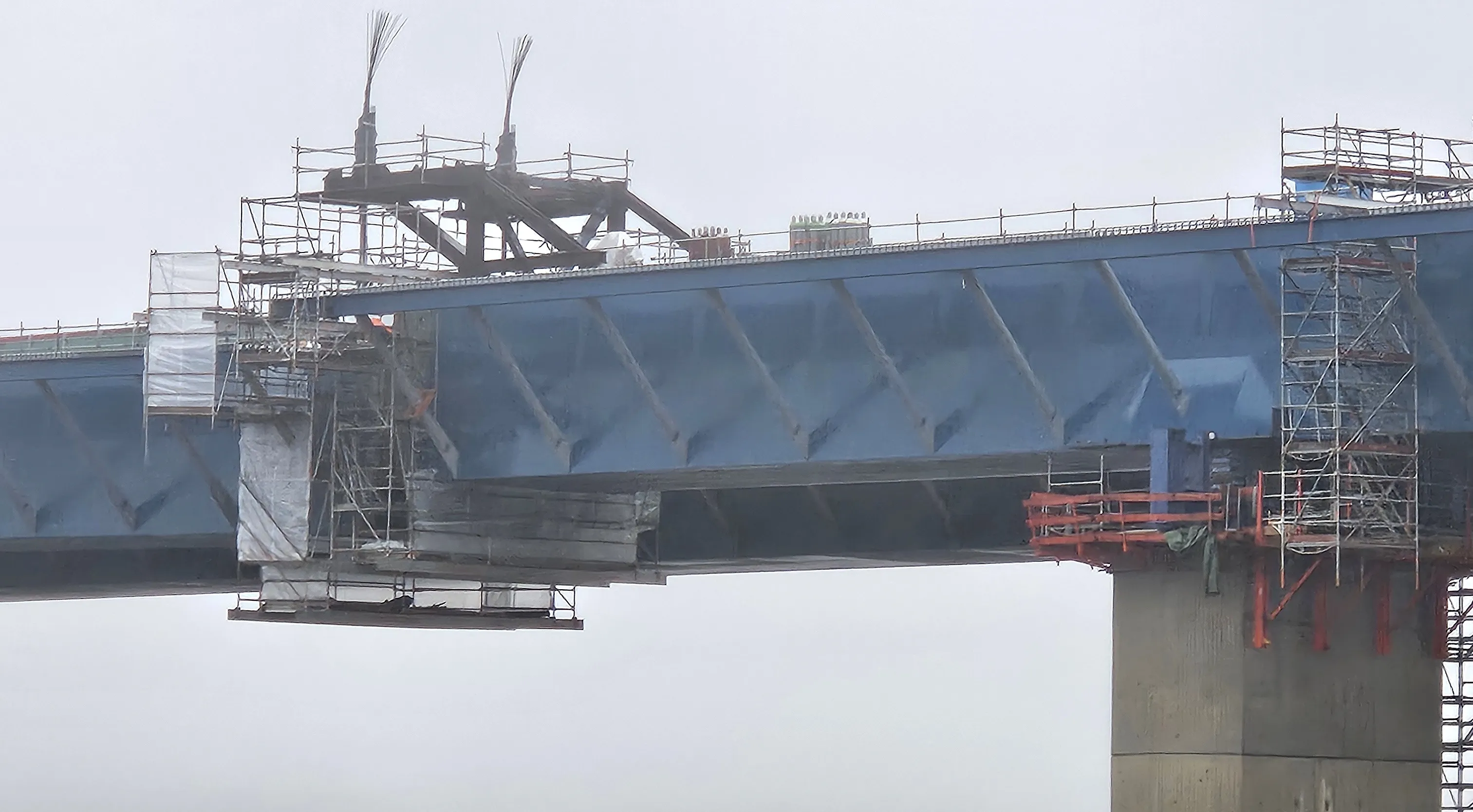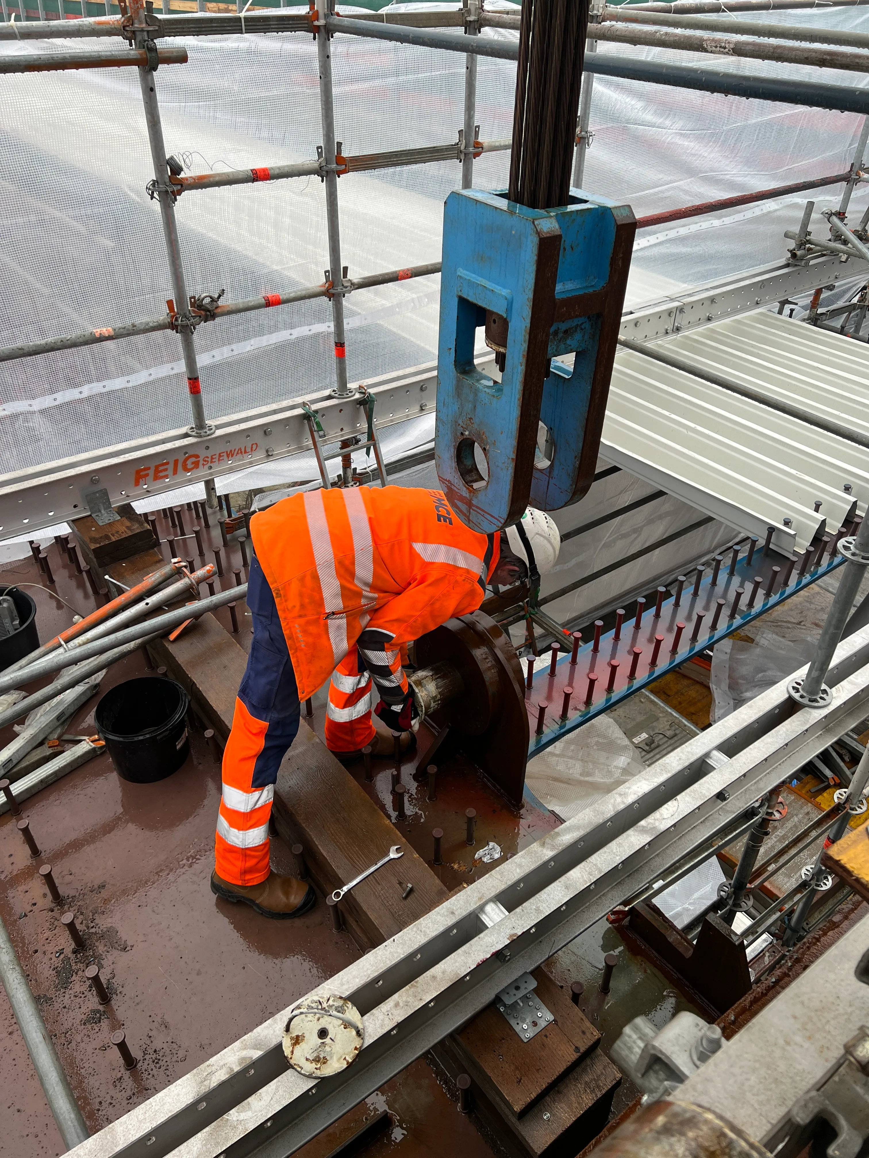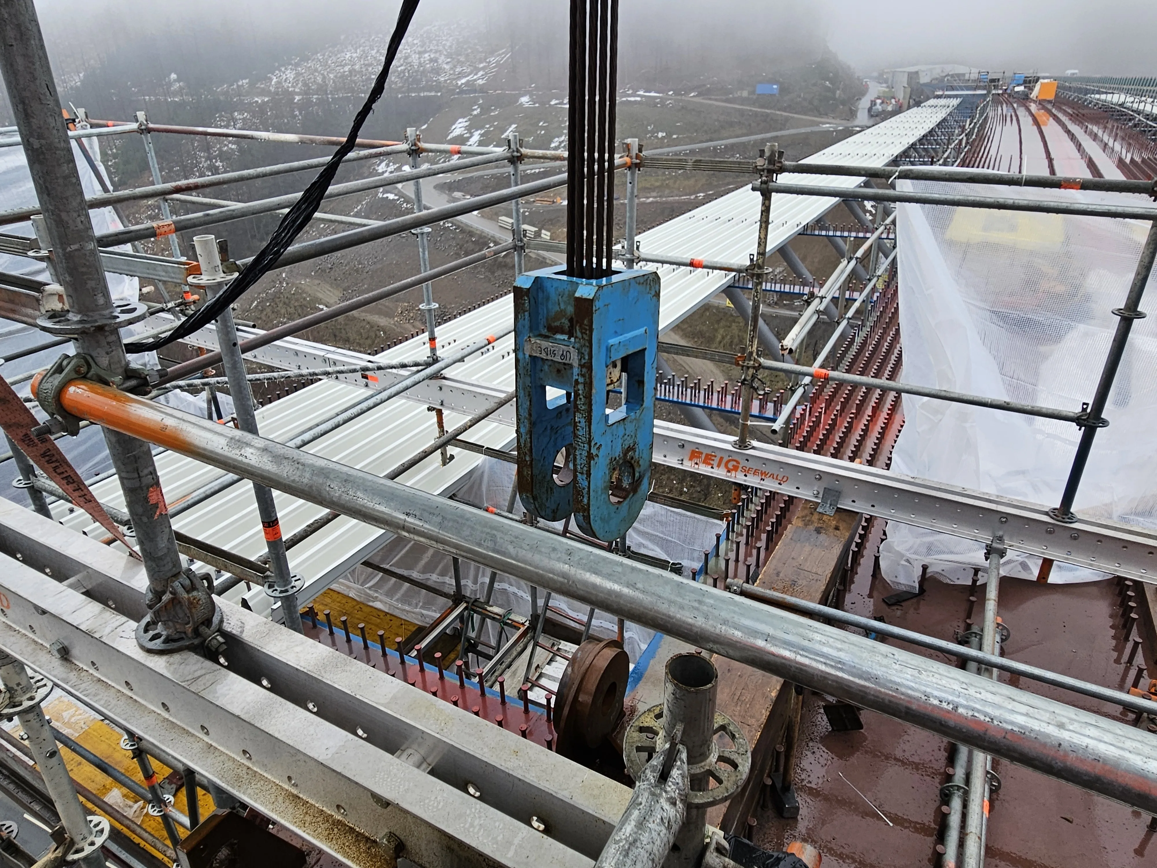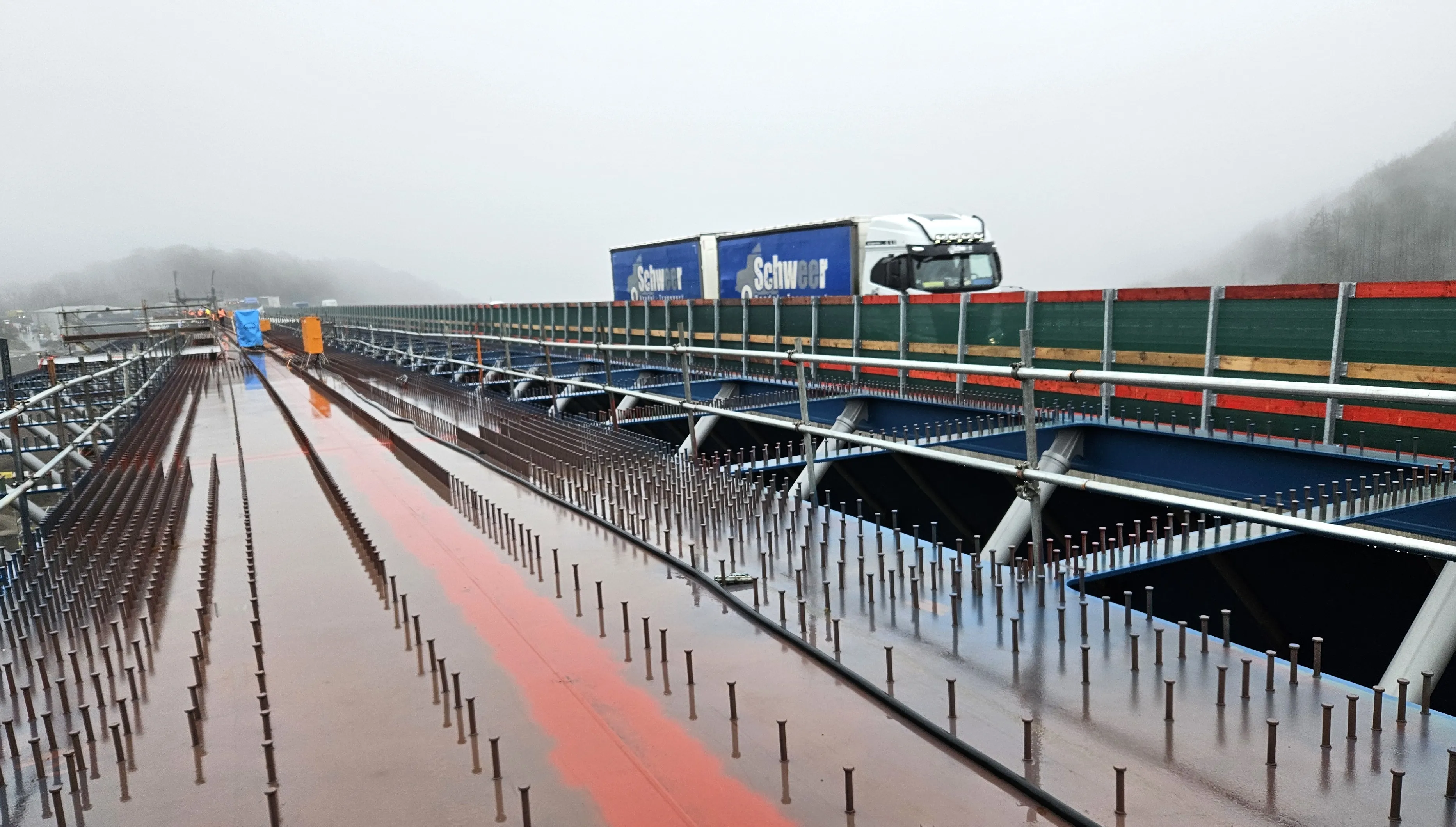 Im Laufe des Nachmittags sollten die beiden Brückenhälften mit Schraubverbindungen gesichert werden, bevor in den nächsten Tagen dann die finalen Schweißarbeiten beginnen. Ebenso wie beim ersten Teilbauwerk werden anschließend wieder zwei Schalwagen installiert, mit denen die Betonfahrbahn gegossen wird. Für die Schalwagen werden die bereits eingesetzten Module genutzt, müssen aber in einem aufwendigen Prozess für das zweite Teilbauwerk individuell angepasst werden.