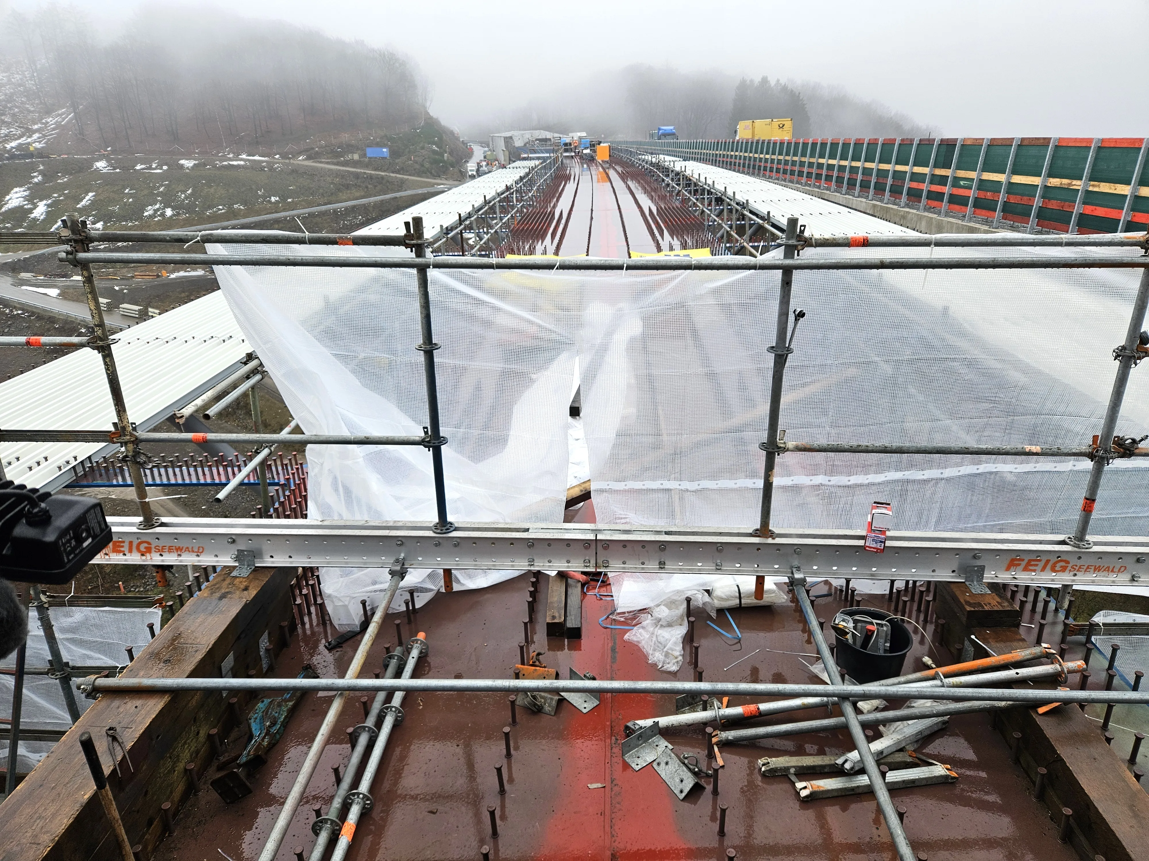 Mancher Lkw-Fahrer hupt zum Gruß, wenn er die Stelle passiert. Die Fahrer sind froh über das Tempo, dass beim Neubau der Brücke angeschlagen wird. Seither herrschen für das Team der Arbeitsgemeinschaft aus Habau, MCE und Bickhardt Bau völlig neue Arbeitsbedingungen. Bis zum 22. Dezember konnten die Brückenbau-Experten in nahezu absoluter Stille arbeiten. „Jetzt tragen sie wegen des Dauerlärms einen speziellen Hörschutz“, berichtete Susanne Schlenga, Kommunikationsfachfrau in der Hagener Außenstelle Autobahn GmbH des Bundes. In ihrer Mitteilung liest sich die Erfolgsmeldung zum Lückenschluss wie folgt: „Gerade einmal drei Wochen nachdem das erste Teilbauwerk der A45-Talbrücke Rahmede in Rekordzeit für den Verkehr freigegeben worden ist, feiert das Rahmedetal bei Lüdenscheid die zweite (Stahl-)Hochzeit.“ Allerdings mit weitaus weniger Prominenz als beim Lückenschluss im Februar 2025.