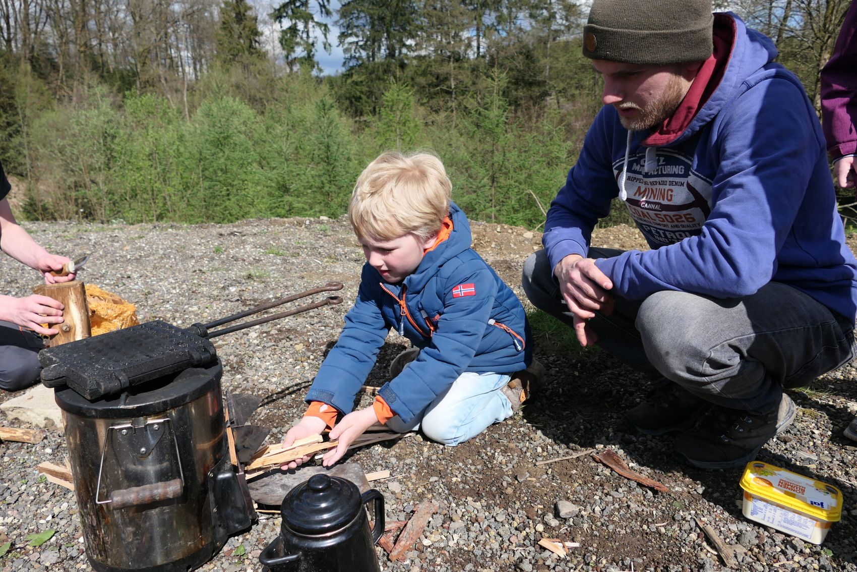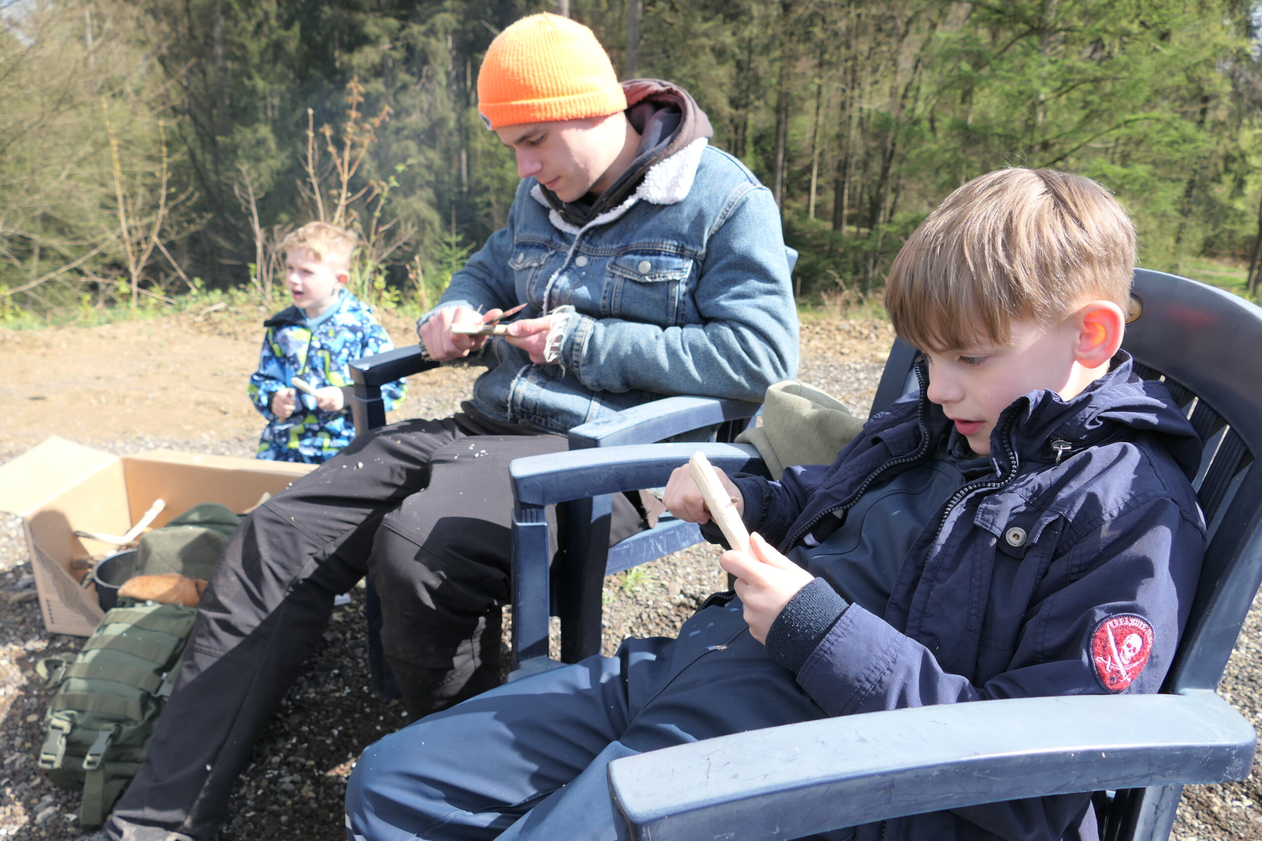 „Besonders gern arbeiten die Kinder hier bei uns mit richtigem Werkzeug“, sagt der Erzieher. So können sie mit richtigen Messern Flöten aus Holz schneiden, das Brennholz für unser Lagerfeuer oder für den Ofen muss zerkleinert und unser Lager im Wald muss noch fertig errichtet werden.