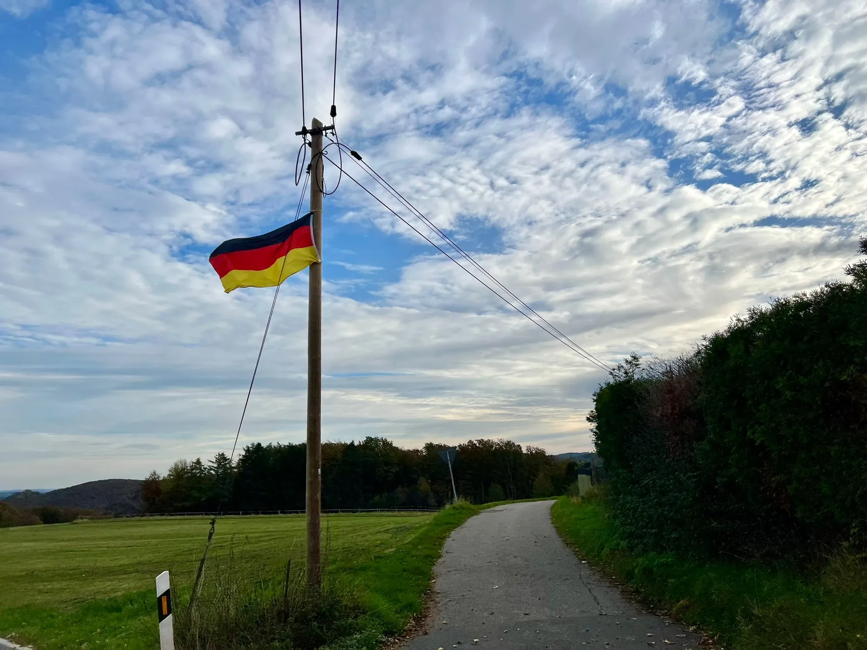 In der Nacht zu Samstag ist es passiert. Im gesamten Gemeindegebiet wurden Deutschlandflaggen aufgehangen. Wie viele es genau sind? Das ist noch nicht bekannt. Aber mehr als 40. Teilweise hängen sie so hoch, dass sie mit der Hand nicht einfach zu entfernen sind. Eine Leiter wäre erforderlich. Sogar am Funkturm im Wald weht eine. Darunter ein Schild in schwarz-rot-goldener Schrift "National Stolz Ist kein Verbrechen". Am Samstagmorgen herrschte Verwirrung. Bürgermeisterin Birgit Tupat hatte die Fahnen gesehen und auch das Ordnungsamt. Aber was dahinter steckt, das haben Recherchen von LokalDirekt ergeben.
