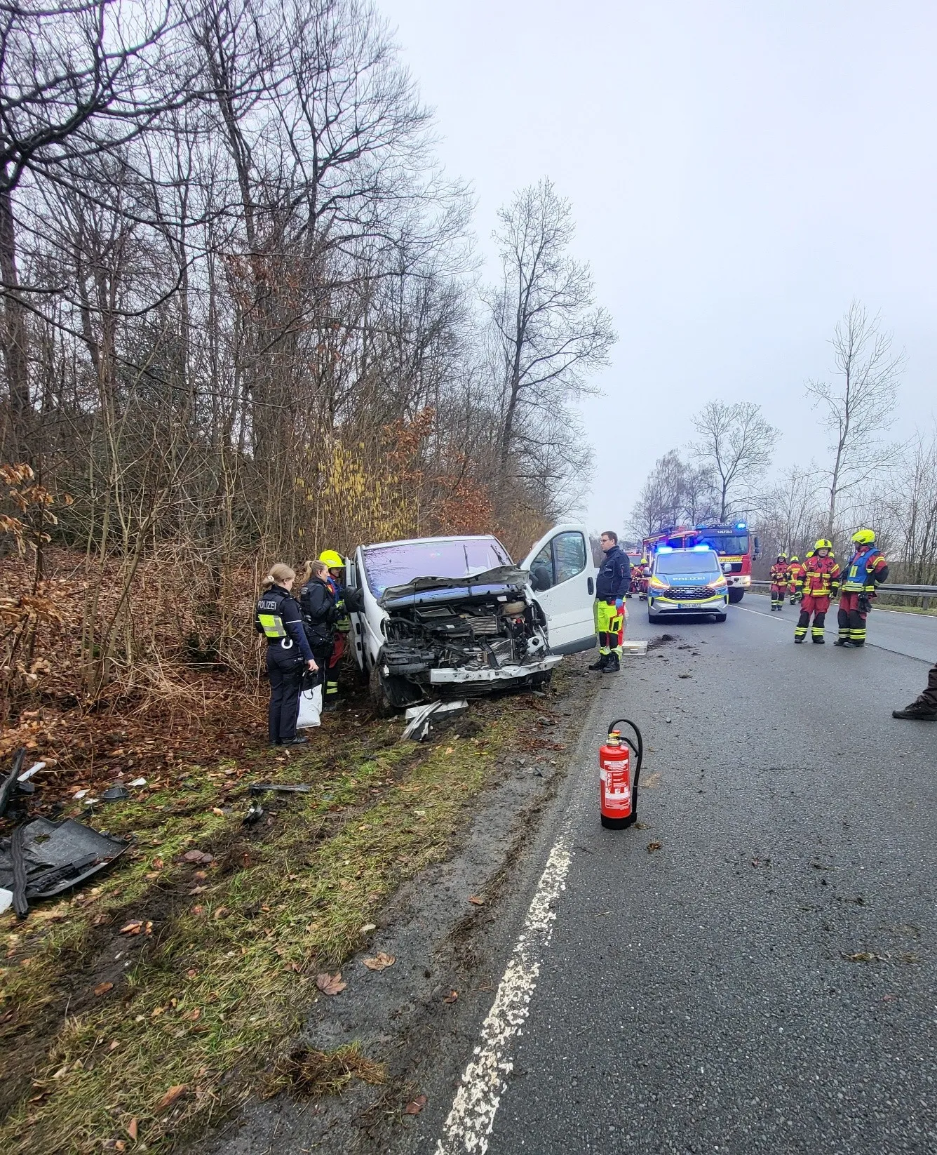 Auf der Bundesstraße 237 im Bereich Varmert kam es um 14.09 Uhr zu einem Verkehrsunfall. Ein Kleintransporter war von Rönsahl kommend mit den Reifen in den Straßenrandbereich geraten. Daraufhin verlor die Fahrerin die Kontrolle über das Fahrzeug und schleuderte über die Straße in die gegenüberliegende Böschung. Die Fahrerin und ihr siebenjähriger Sohn erlitten leichte Verletzungen. Da die Fahrerin schwanger ist, wurden sie und das Kind auf dem Beifahrersitz durch den Rettungsdienst ins Krankenhaus transportiert, um genauere Untersuchungen vorzunehmen, wie Feuerwehr-Pressesprecher Christian Schwanke mittteilte.