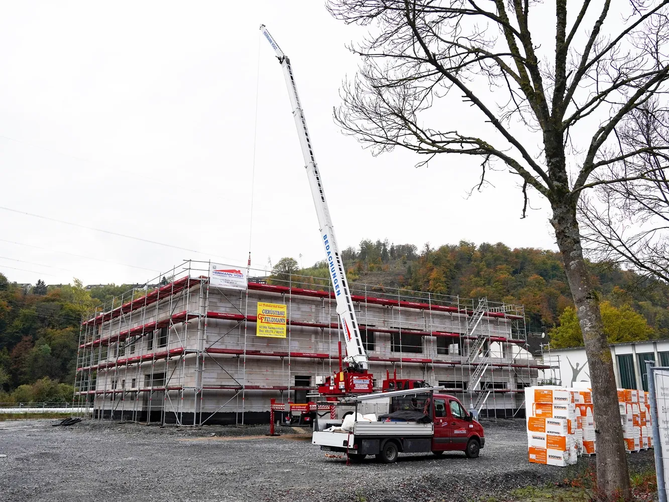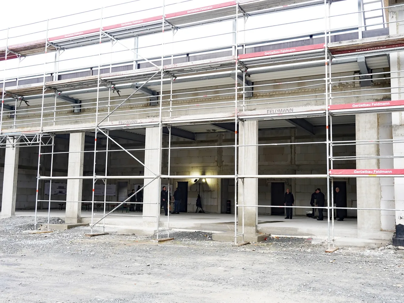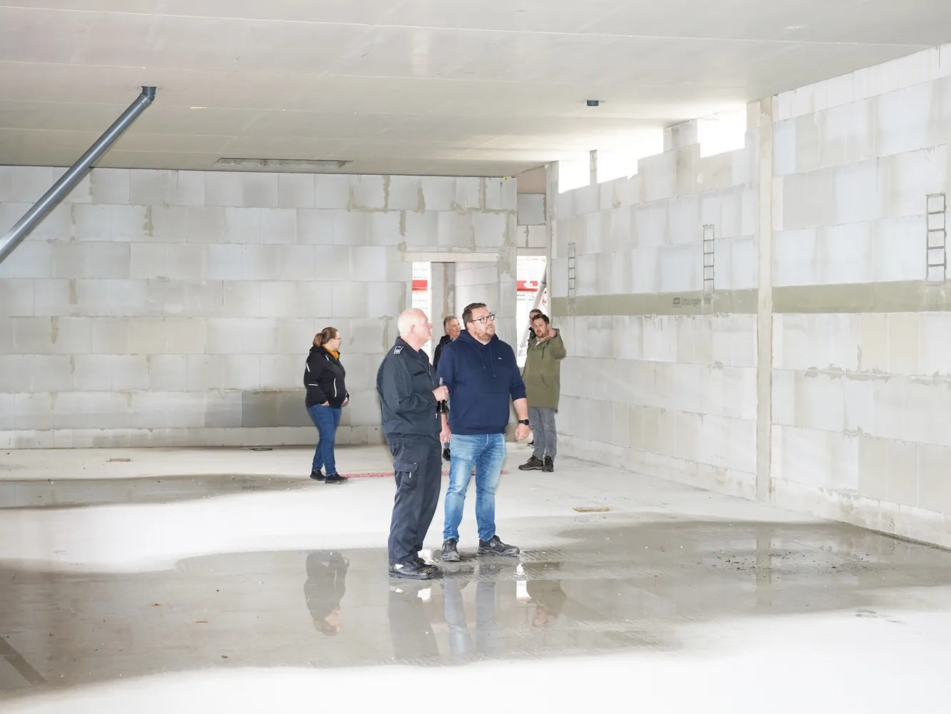 Zuletzt wurde seit dem 13. Oktober das Dach bearbeitet, das nun von oben dicht ist. Fenster, Türen und die Fahrzeughallentore sind bereits beauftragt und Ziel ist eine dichte Gebäudehülle bis zum Dezember dieses Jahres. Dann können die Ausbauarbeiten im Innenbereich stattfinden, beispielsweise die Elektroarbeiten, Herstellen von Abgasabsaug- und Lüftungsanlage sowie die Sanitäranlagen.