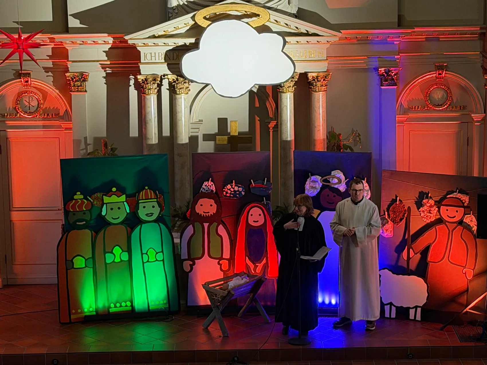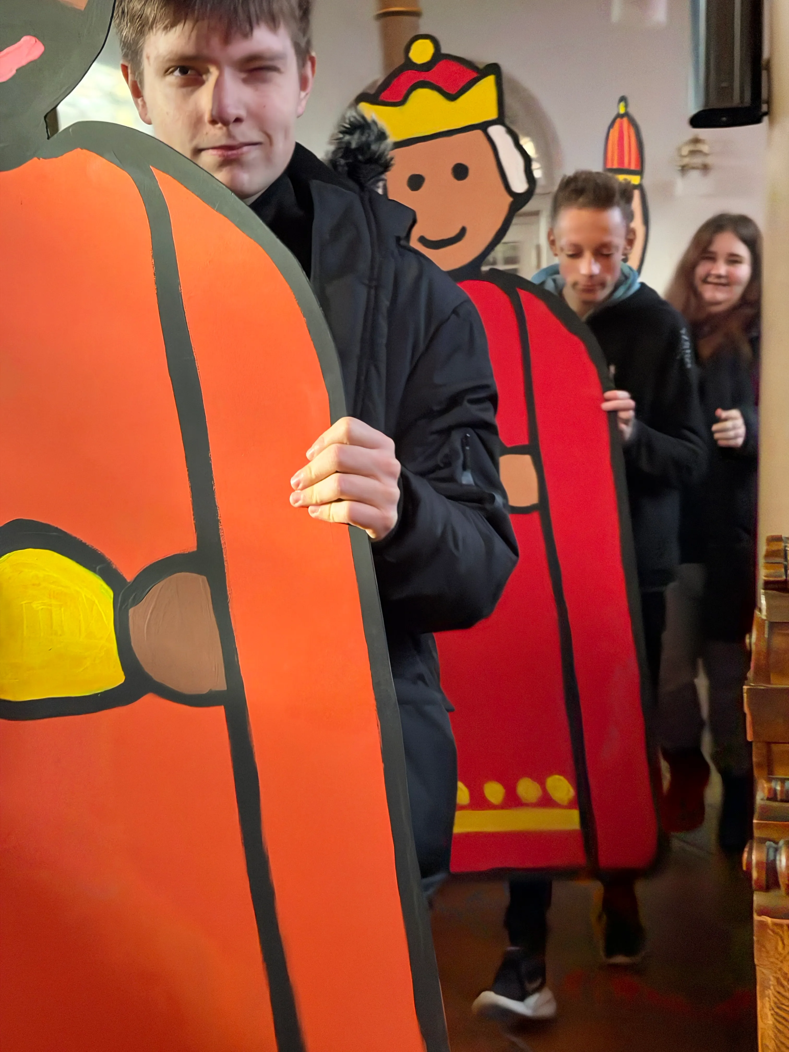 Im Vorfeld hatten sich die verschiedenen Schulstufen mit den Protagonisten der Weihnachtsgeschichte befasst und sich nun auf den Weg zum Gottesdienst gemacht. Zur Kirche brachten die Klassen nicht nur ein Bild mit, sie stellten aus großen Figuren ein riesiges Standbild zusammen, anhand dessen sich die Weihnachtsgeschichte verdeutlichte.