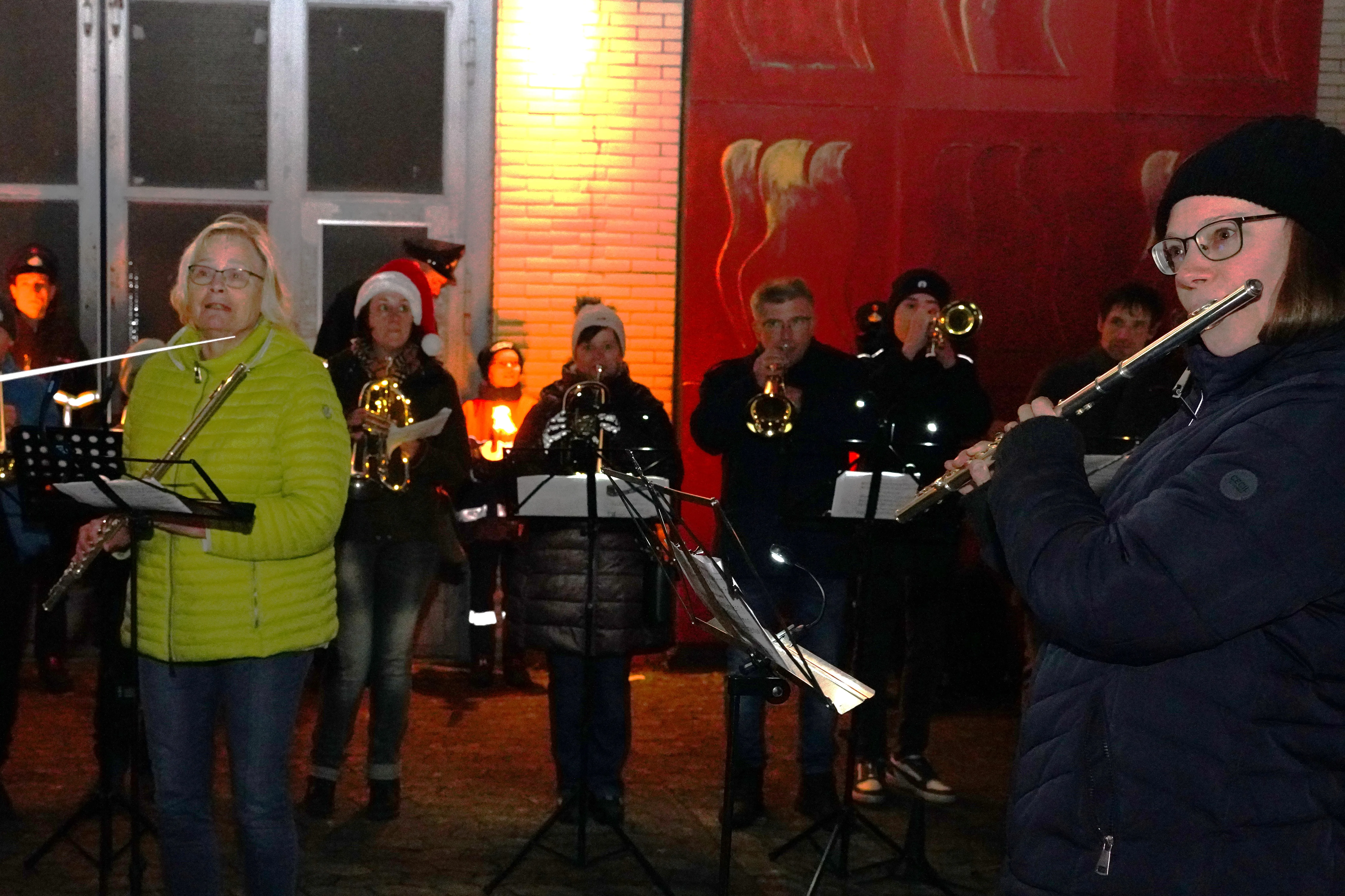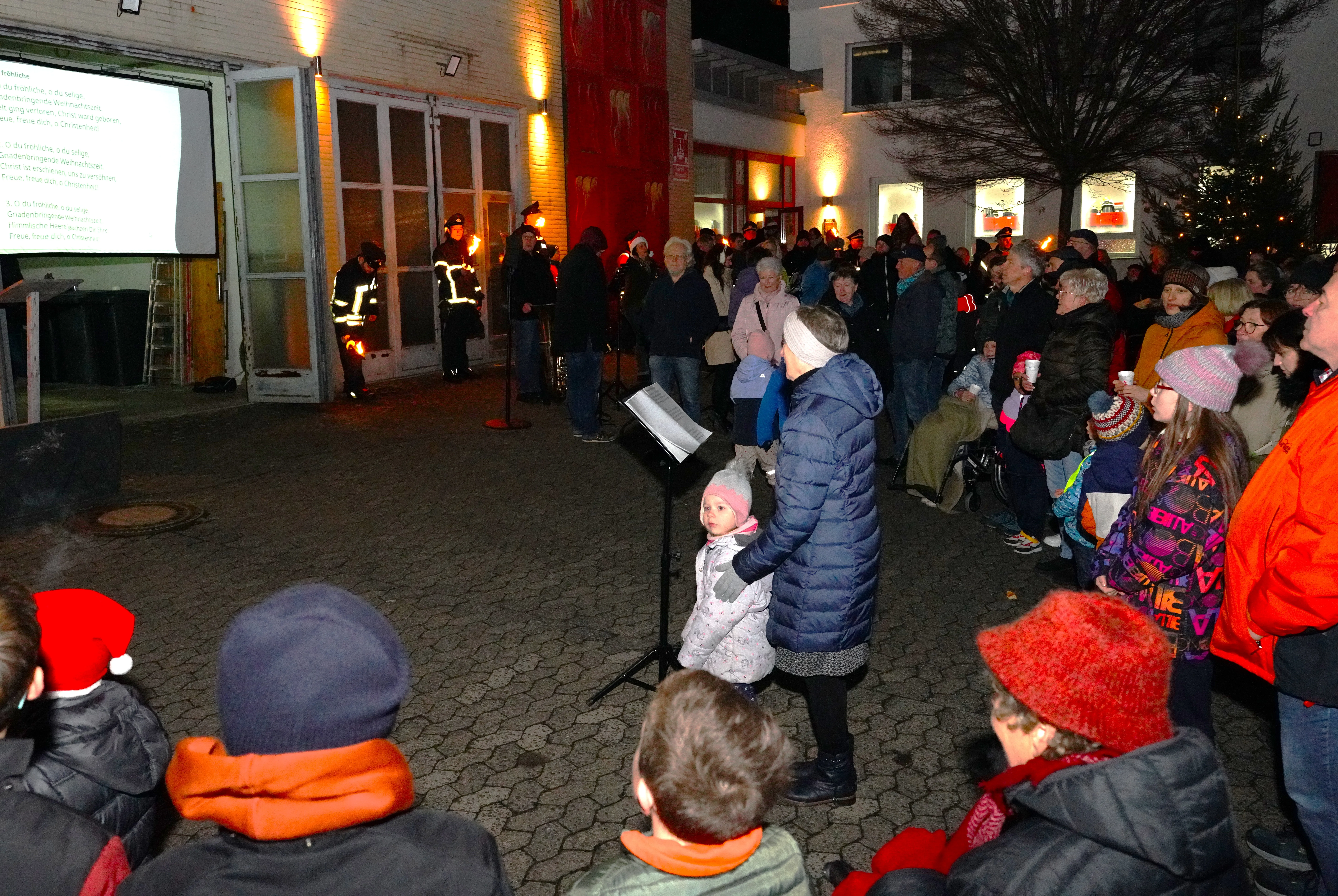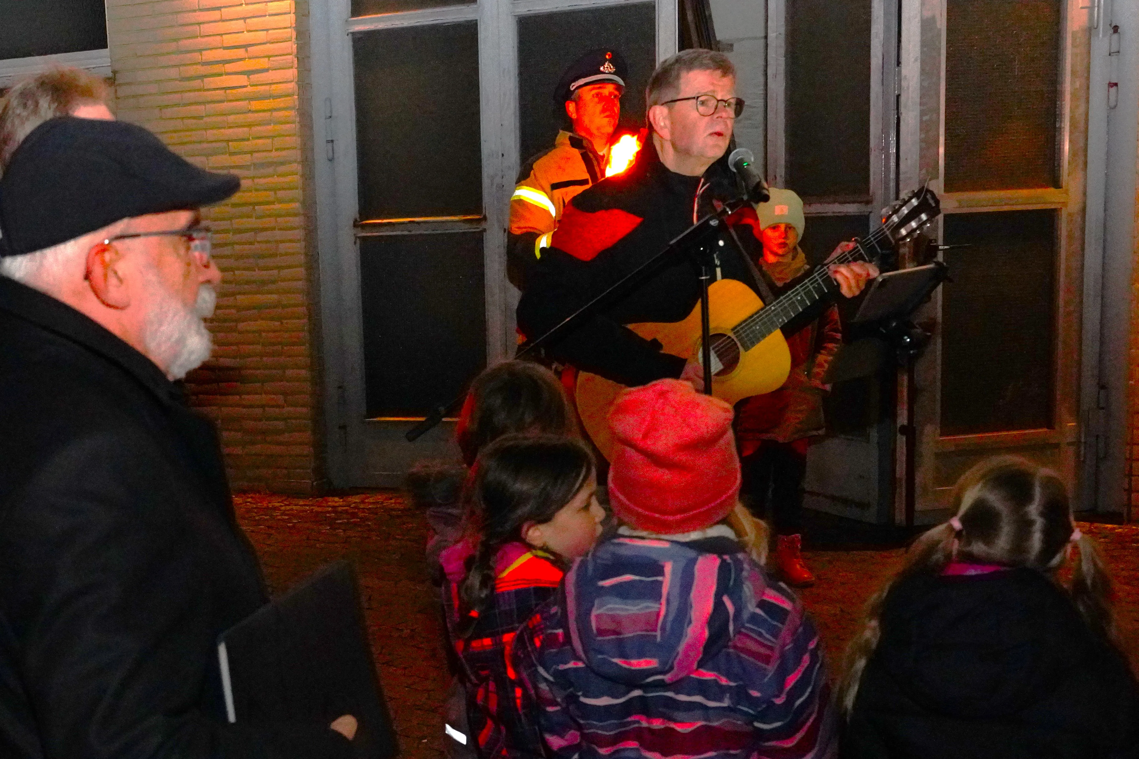 Pfarrerin Christine Rosner eröffnete das Adventssingen, hieß die Anwesenden willkommen und zeigte sich erfreut über die große Zahl der Besucher. Henning Schewe, Sänger des Plettenberger Männerchores Die Four Valleys, stimmte im Anschluss mit seiner Gitarre zum offenen Singen an. Textsicher sangen die Kinder das Lied „In der Weihnachtsbäckerei“ mit; beim nachfolgenden Lied „O du fröhliche“ und weiteren wurde der Text auf die Leinwand projiziert, sodass auch hier stimmungsvoll mitgesungen werden konnte. Weiter musikalisch begleitet wurde der alljährliche Event durch die Four Valleys und den Musikzug der Freiwilligen Feuerwehr. Andächtig und mit Fackellicht untermalt präsentierten sie den Besuchern festliche Versionen ihrer Weihnachtslieder.