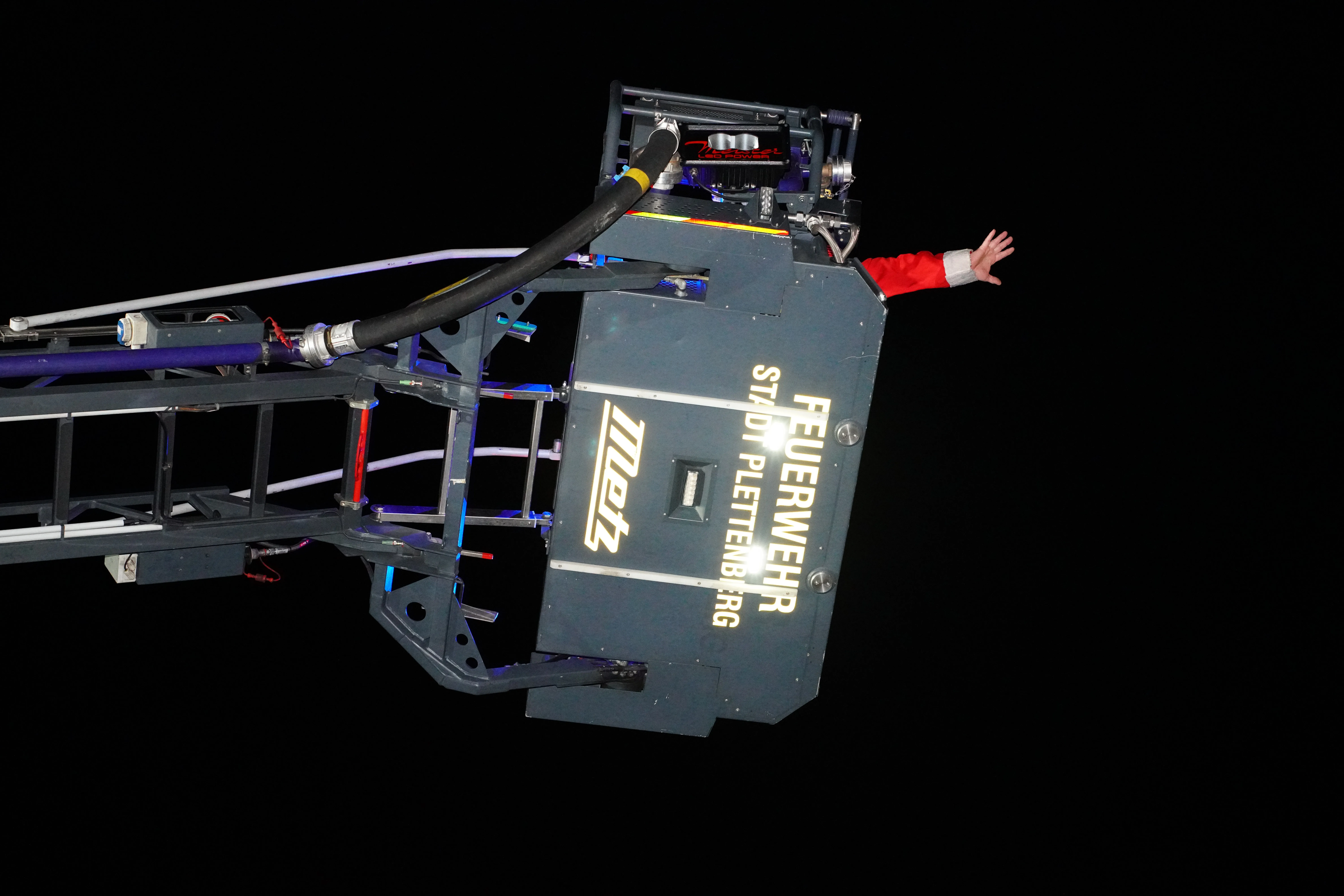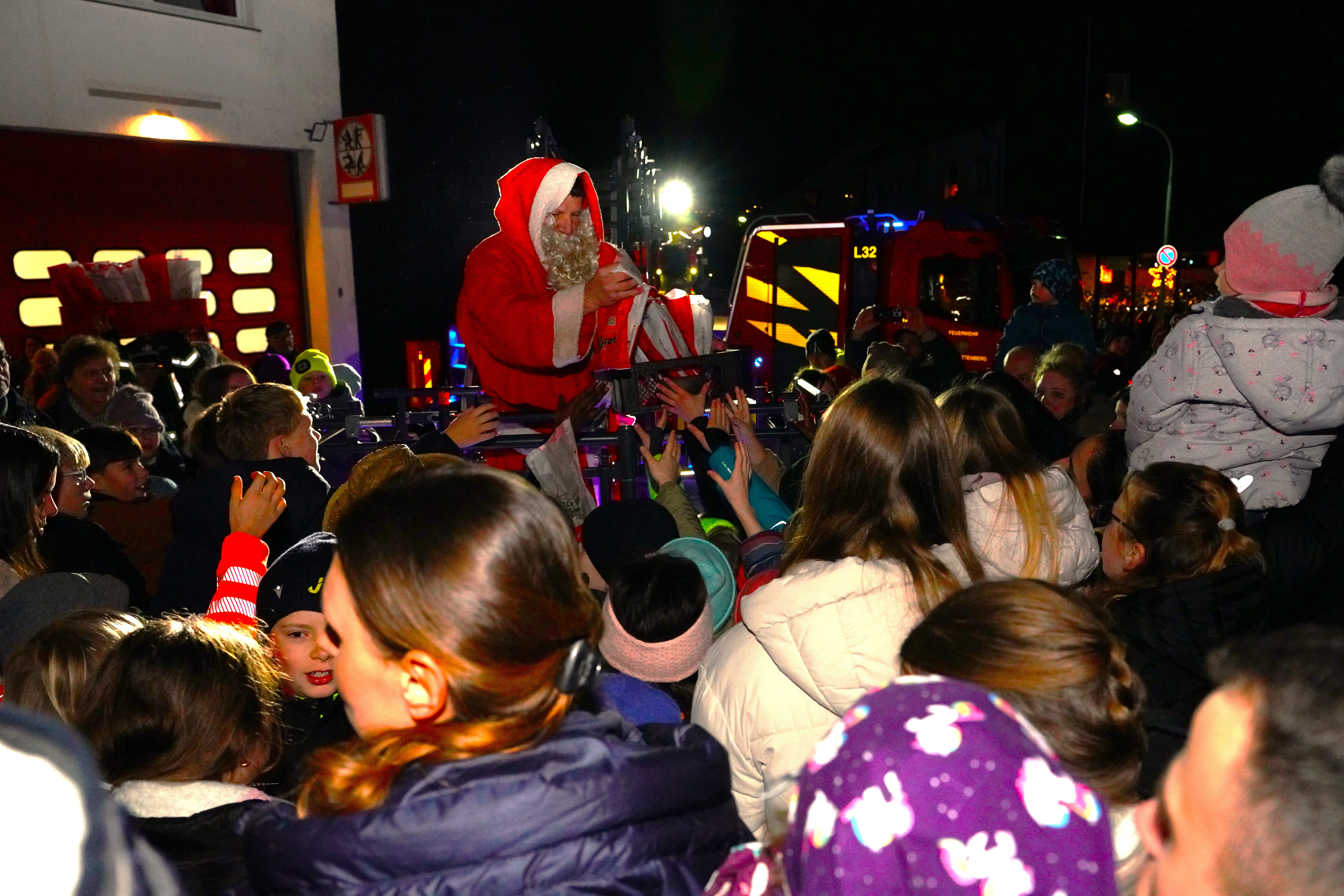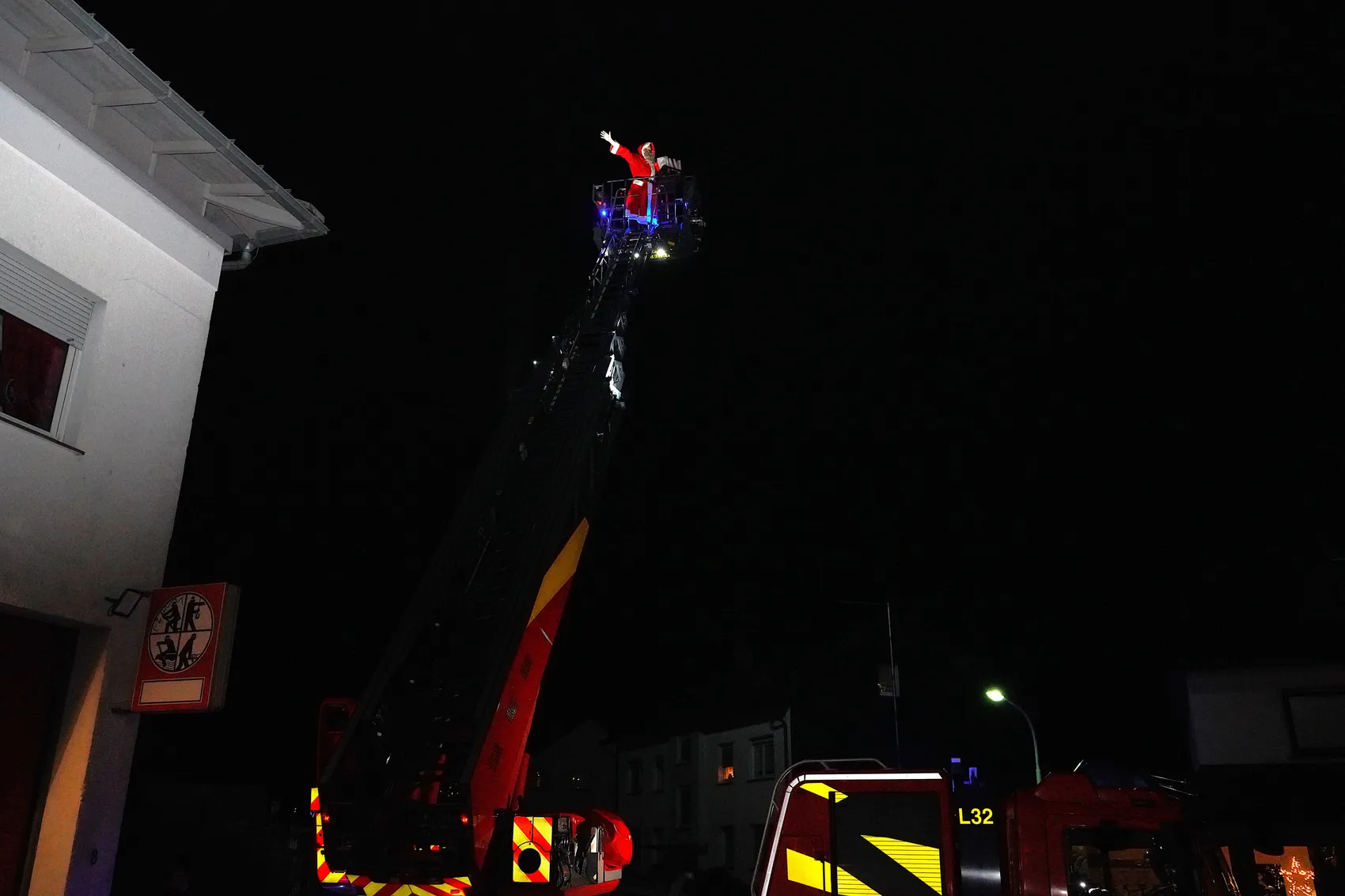 Nachdem die Anwesenden in die weihnachtliche Stimmung eingetaucht waren, stand der Höhepunkt des Abends bevor: Die Drehleiter schaltete die Lichter an und sofort wussten die Kinder, dass der Nikolaus gleich aus dem Himmel herabschweben würde. Über das Dach des Gerätehauses fuhr die Drehleiter herab und die Augen der Kinder leuchteten, als sie den roten Mantel am dunklen Himmel erspähten. Viele Kinder winkten ihm zu und kamen aus dem Staunen nicht mehr heraus. Unten angekommen, verteilte der Mann mit dem roten Mantel und dem weißen Bart an jedes Kind einen Stutenkerl und entschwebte anschließend wieder gen Himmel.