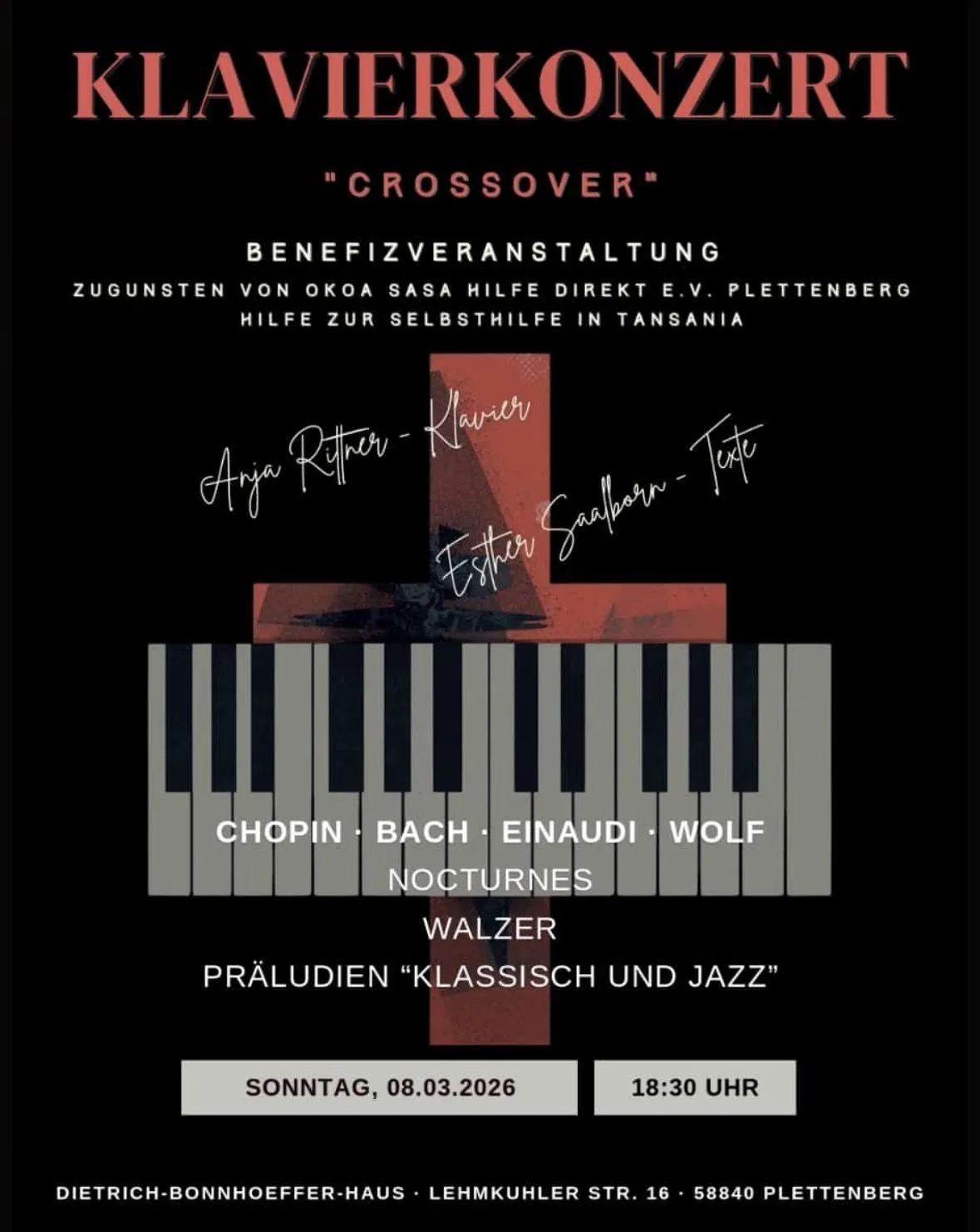 „Crossover“ heißt die Überschrift für das Klavierkonzert mit Anja Rittner am Sonntag, 8. März, um 18.30 Uhr im Dietrich-Bonhoeffer-Haus. Es handelt sich um eine Benefizveranstaltung zu Gunsten des Vereins Okoa Sasa - Hilfe Direkt, der Hilfe zur Selbsthilfe in Tansania leistet.