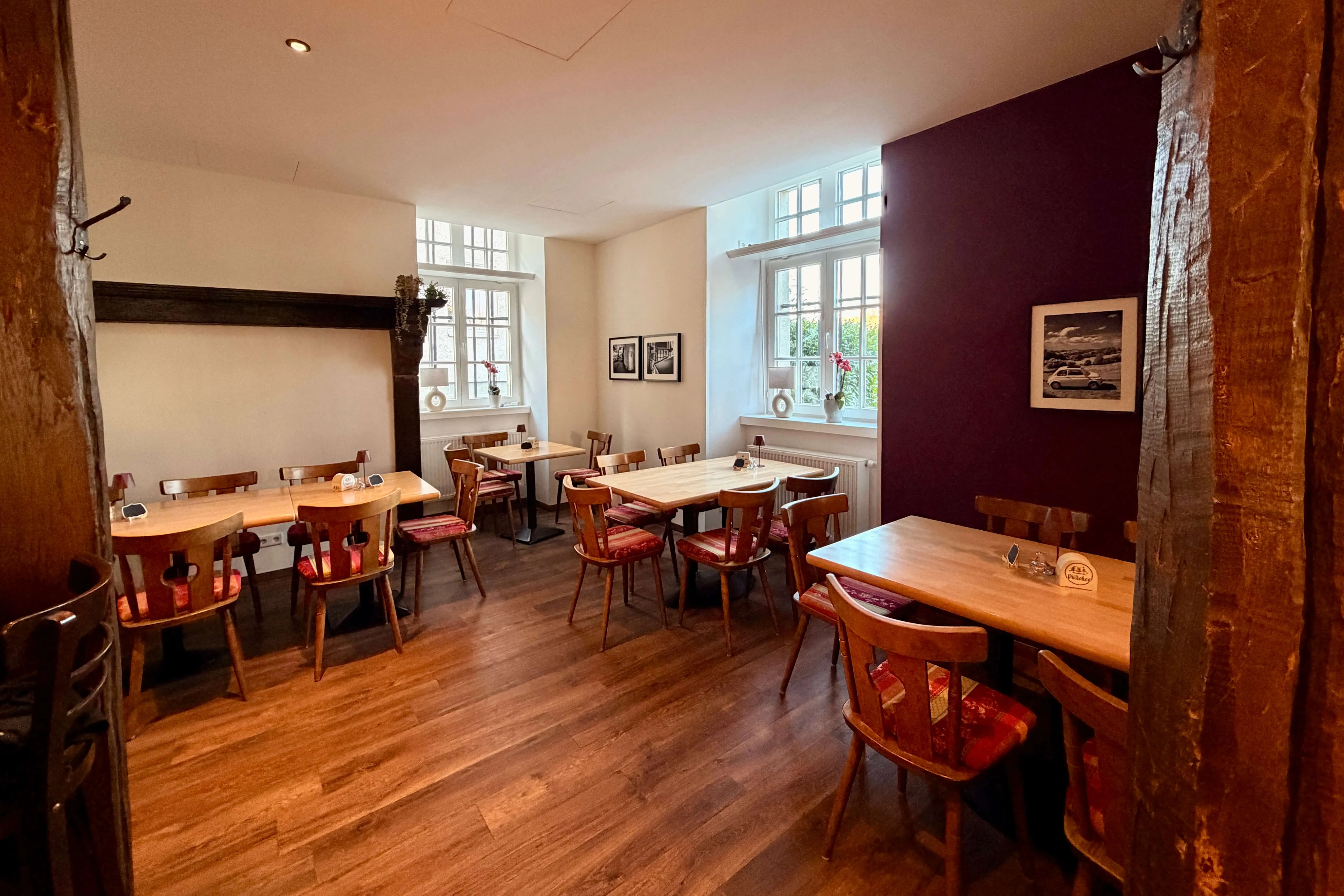 Das 1739 errichtete Gebäude bietet aus Sicht des neuen Pächters das passende Ambiente für ein traditionelles Wirtshaus. Entsprechend behutsam wurde renoviert. Der Thekenbereich mit seinen Sitznischen blieb erhalten — „allein schon für die Gäste, die nur mal auf ein Bier vorbeikommen möchten“, so Kriese — und ebenso der ursprüngliche Charakter mit den alten Balken. Tische und Stühle wurden wieder dem eher „rustikalen Charme“ angepasst, jedoch einige kleine neue Akzente gesetzt, etwa bei der Beleuchtung oder durch Schwarzweiß-Aufnahmen des Breckerfelder Fotografen Christof Wippermann. Das neue Logo des Wirtshauses, das prominent und zugleich dezent im Inneren leuchtet, hat Gustav Kriese selbst entworfen: „Auch dabei war es mir wichtig, dass es mit dem alten Gebäude harmoniert.“