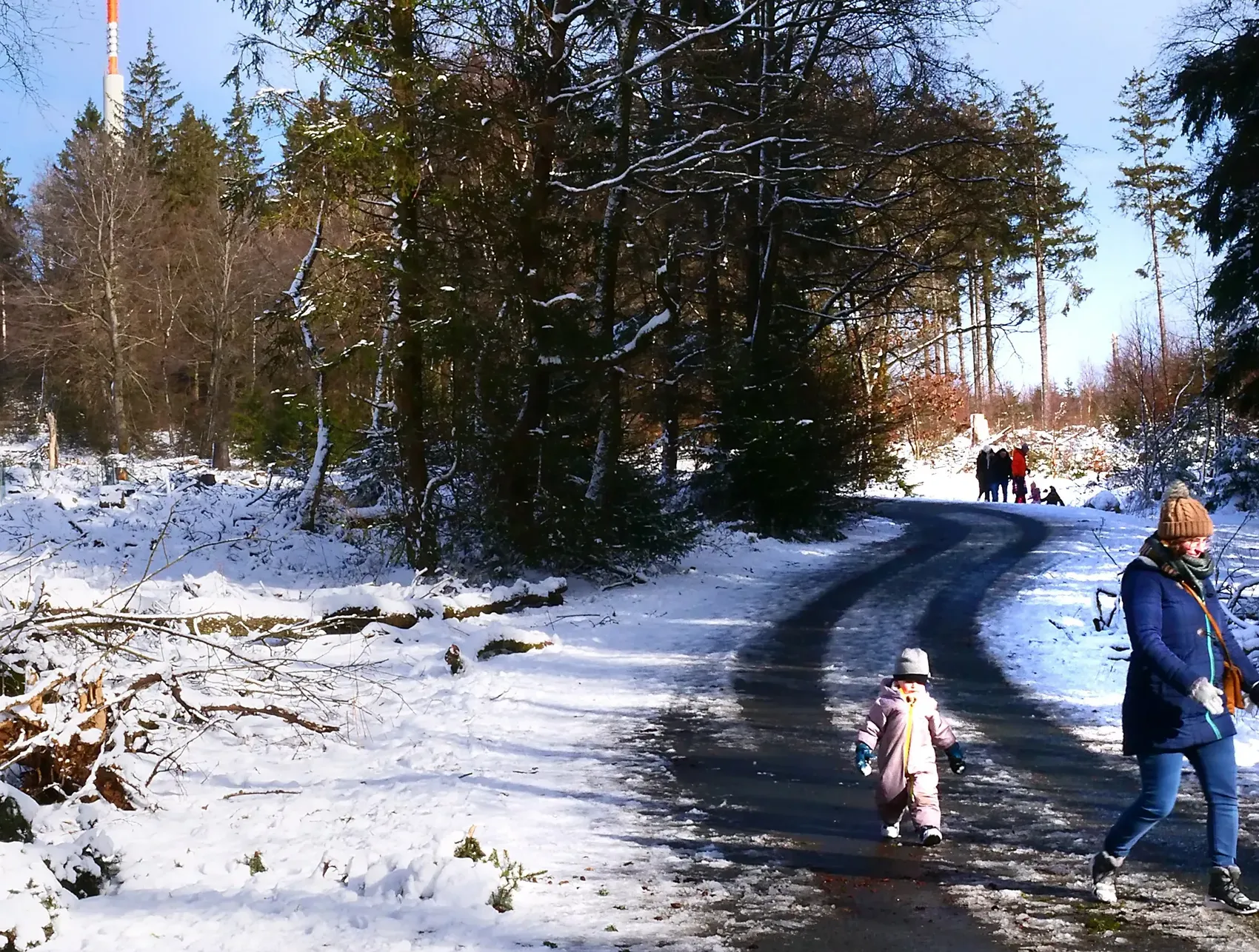 Will man zum Waldberg und/oder zur Nordhelle, dann bieten sich zwei Möglichkeiten an. Vom Wanderparkplatz Roscheid aus sind es zu Fuß und per Rad über den Südhangweg sieben Kilometer zur Nordhelle. Bei guter Schneelage wird die Strecke für Skilangläufer gespurt.