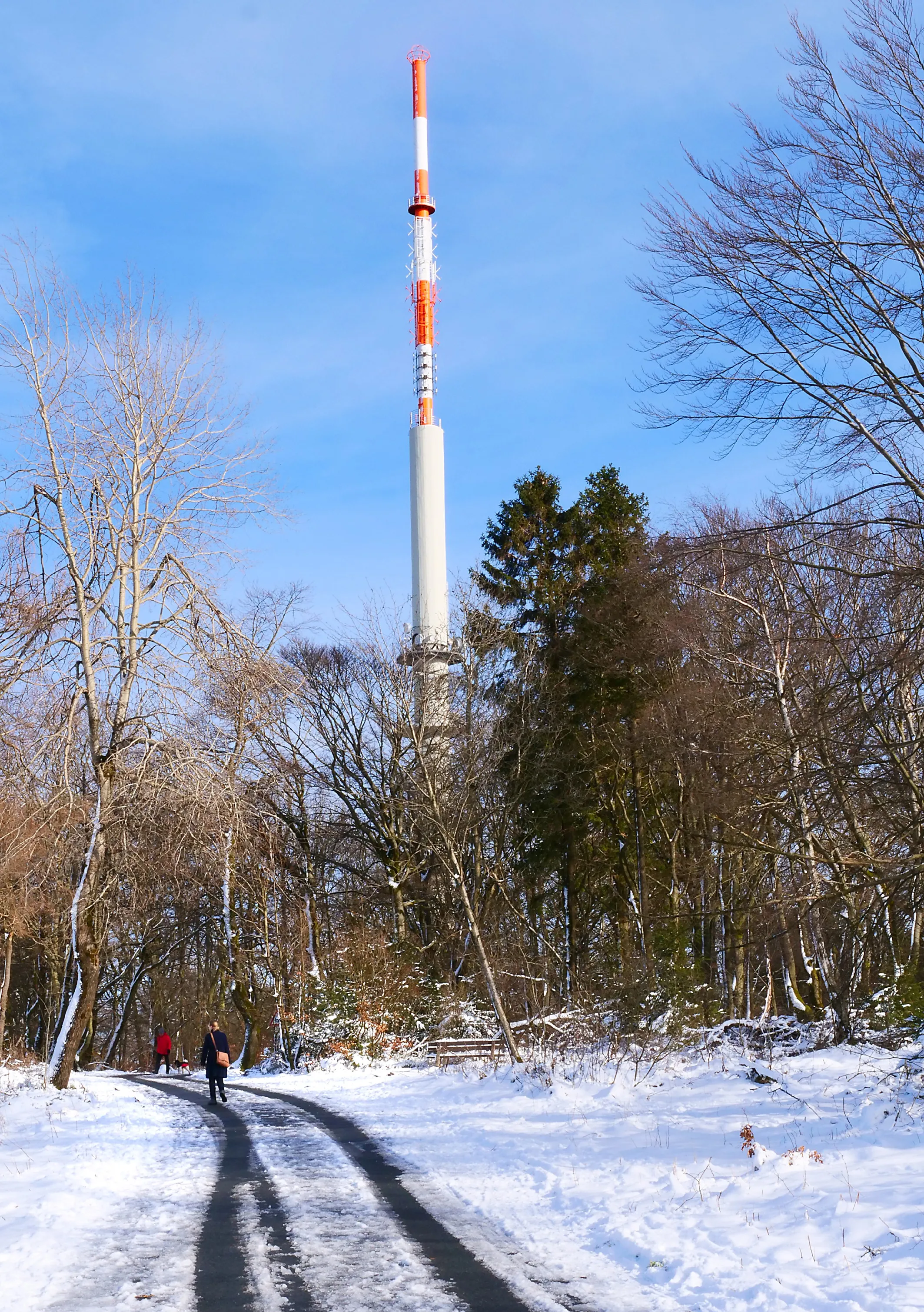 Über eine für den Normalverkehr gesperrte Asphaltstraße mit mäßiger Steigung geht man angenehm aufwärts. 67 Höhenmeter gilt es zu nehmen, um auf die mit 663 Meter über Normalnull höchste Erhebung des Märkischen Kreises, auf die Nordhelle, hinauf zu kommen. Wanderer, Familienausflügler, Biker kommen uns entgegen. Der 150 Meter hohe Stahlbeton-Sendemast des WDR, rot-weiß geringelt, kommt uns hinter jeder Biegung in den Blick. Der Sender überträgt die Hörfunkprogramme des WDR und des Deutschlandfunks sowie 15 öffentlich-rechtliche Fernsehprogramme im DVB-T2-Standard. Ein Vorläufer dieses Mastes entstand 1962, der aktuelle Mast wurde 1984 gebaut.