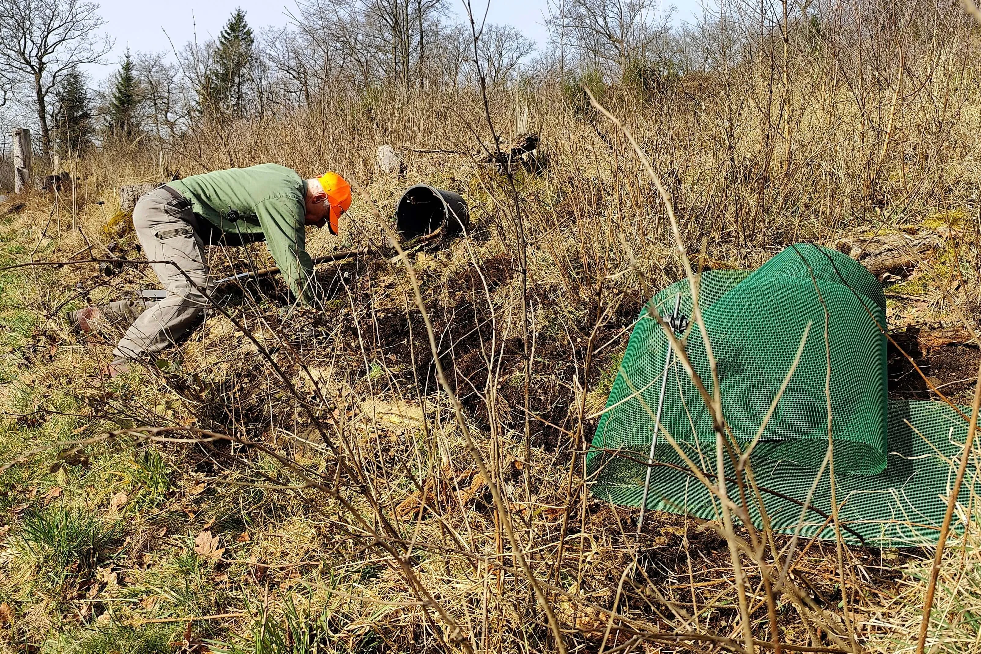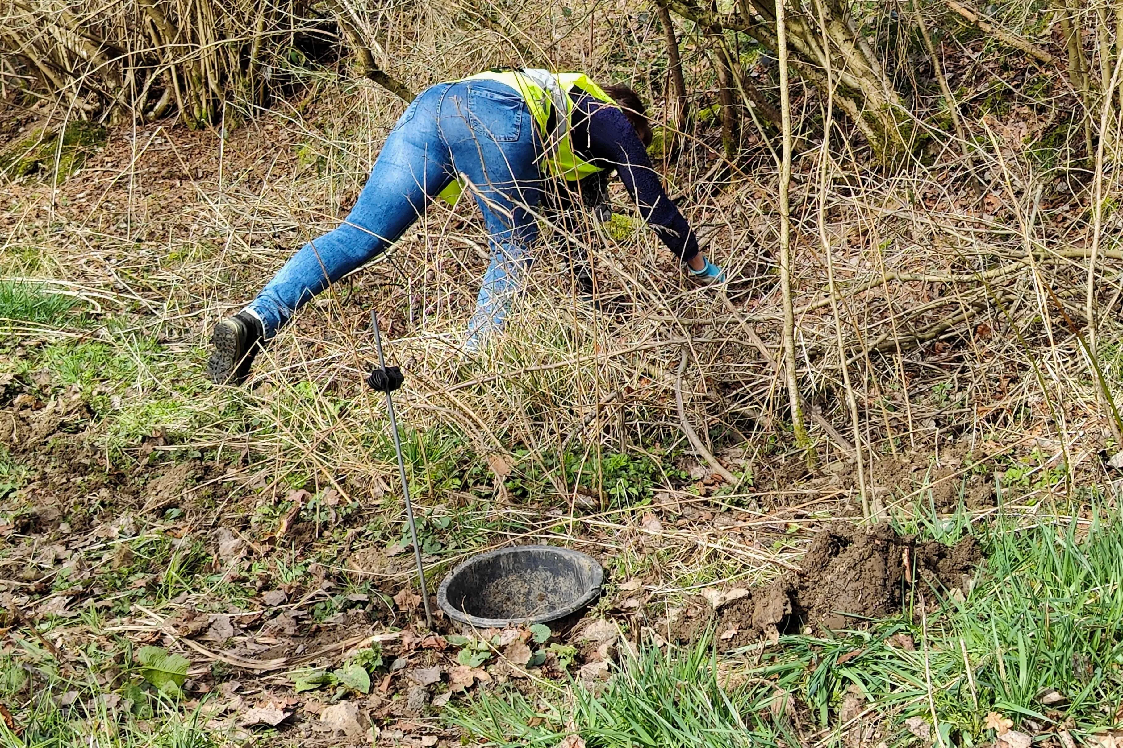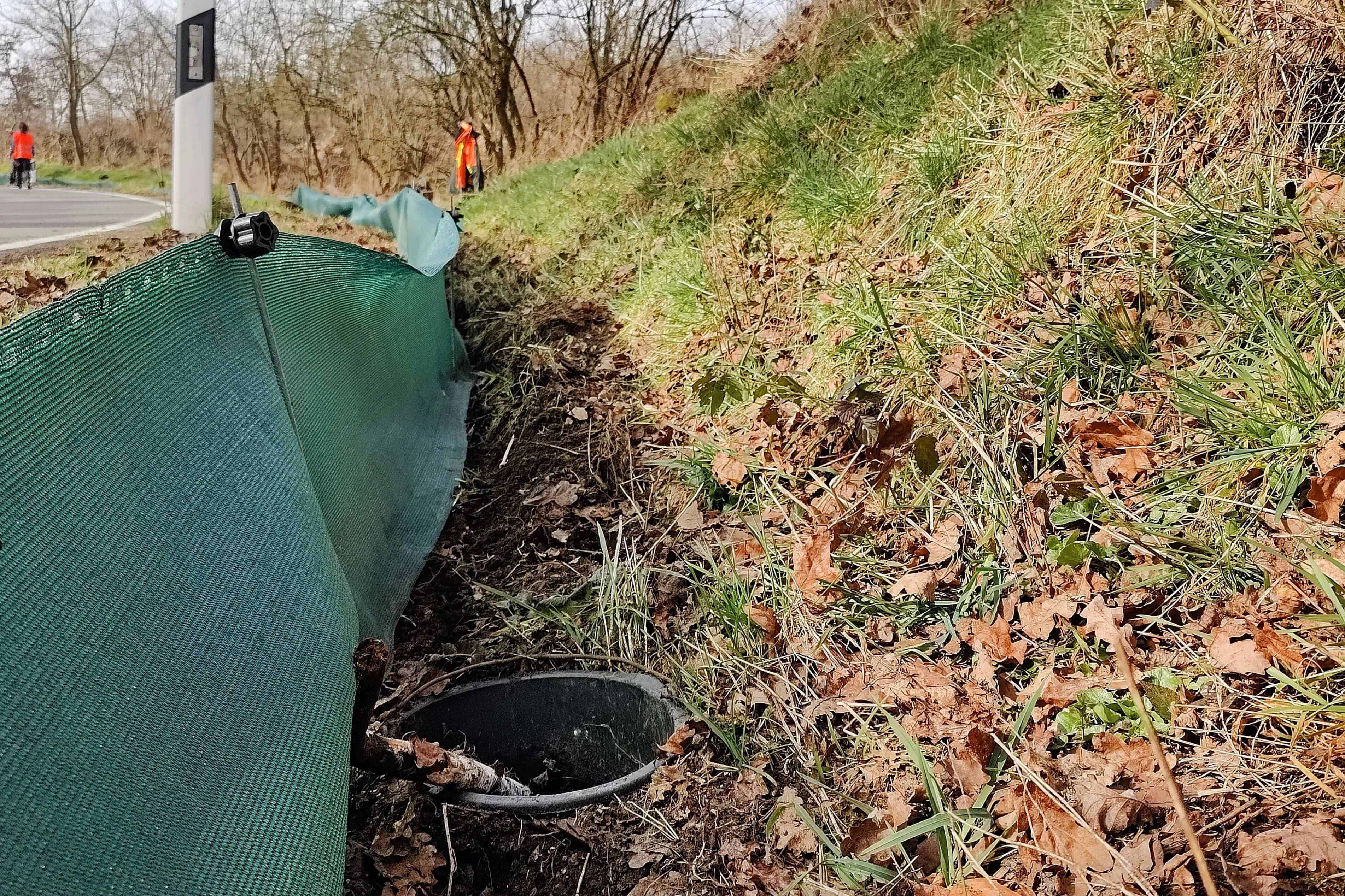 Auf einer rund 300 Meter langen Strecke wurde am vergangenen Samstag ein Krötenschutzzaun errichtet, der weder über- noch unterwandert werden kann. Etwa alle zehn Meter sind Eimer im Boden eingelassen, die mit Laub und kleinen Stöcken ausgelegt sind. In diese Behälter fallen die wandernden Tiere entlang des Zaunes.