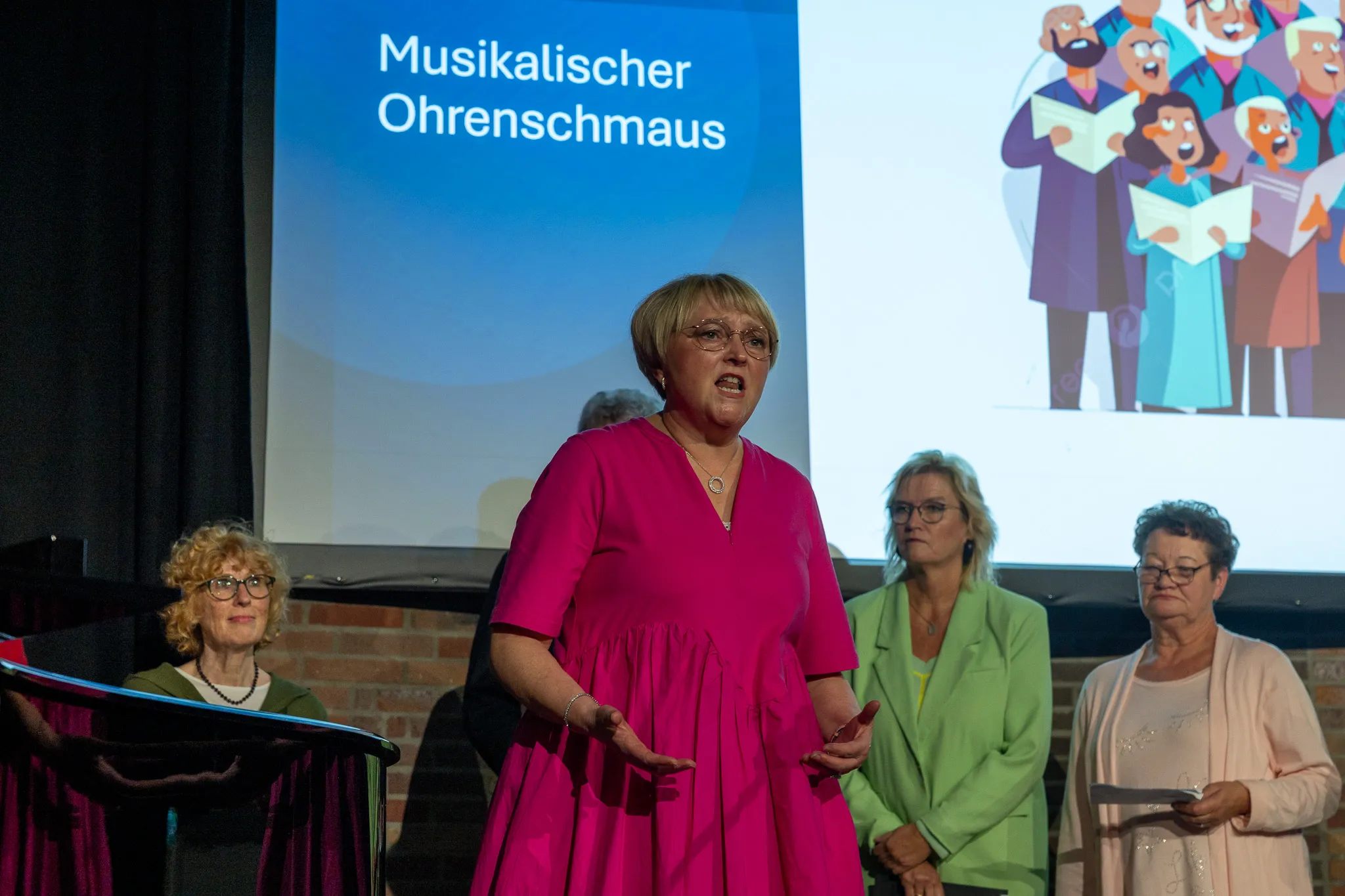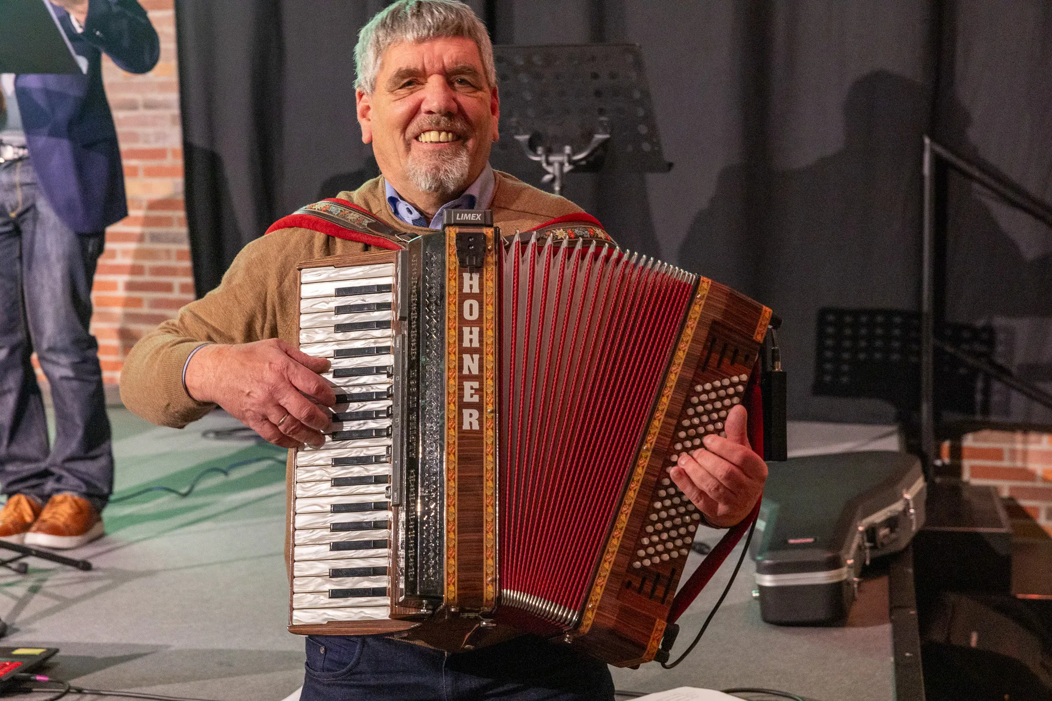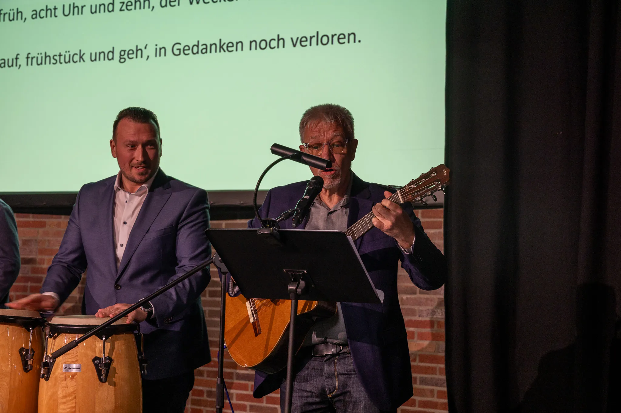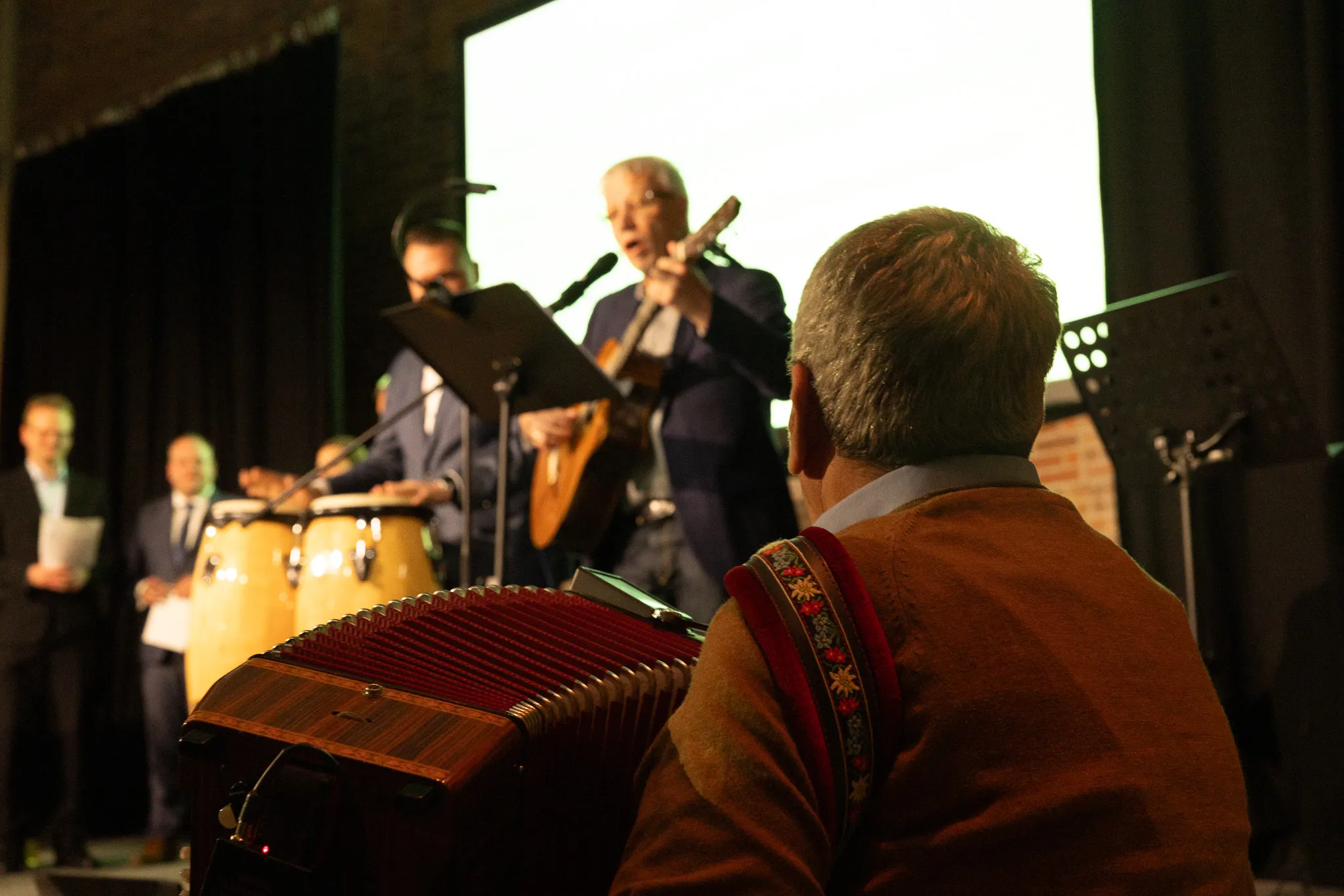 Abschließend gab es noch eine musikalische Überraschung für Jörg Schönenberg: Uwe Lal (Gesang, Gitarre), Bürgermeister Christian Breddermann (Congas) und Jürgen Ebert (ehemaliger Ratsherr der FDP, Akkordeon) sangen eine umgedichtete Version von Reinhard Meys „Über den Wolken“ mit dem Titel “Nach deiner Amtszeit“. Dabei unterstützt wurden sie auf der Bühne von den Fraktionsvorsitzenden, die im Chor mitsangen - und dem restlichen, sichtlich gerührten Gästen im Saal.