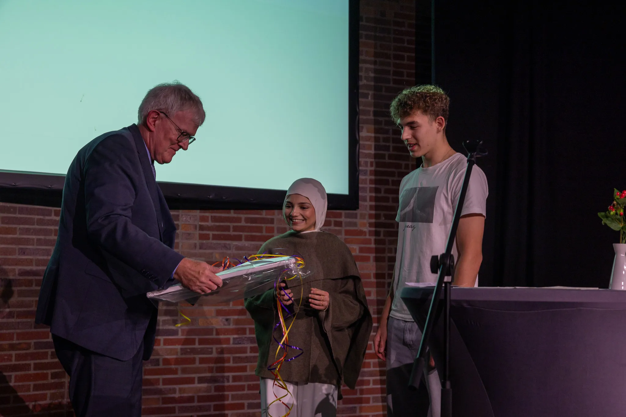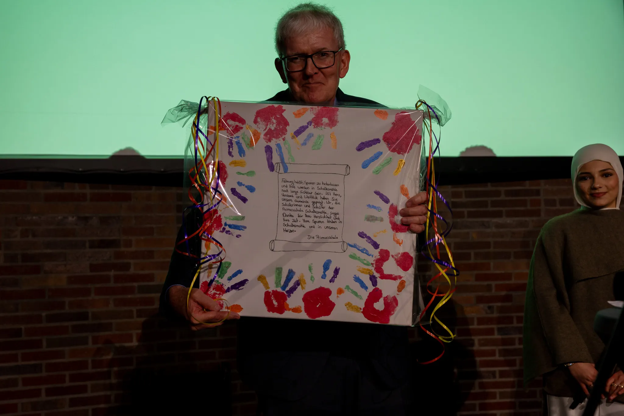 Eine Überraschung für Jörg Schönenberg hatten auch die Primusschüler vorbereitet. Die Schülersprecher überreichten ein Bild mit Handabdrücken, darauf zu lesen war der Spruch: "Führung heißt, Spuren zu hinterlassen." Den Schülern war es ein besonderes Anliegen, sich noch einmal persönlich bei Schönenberg zu bedanken - für sein unermüdliches Engagement für Schule und Schüler, wie sie betonten.