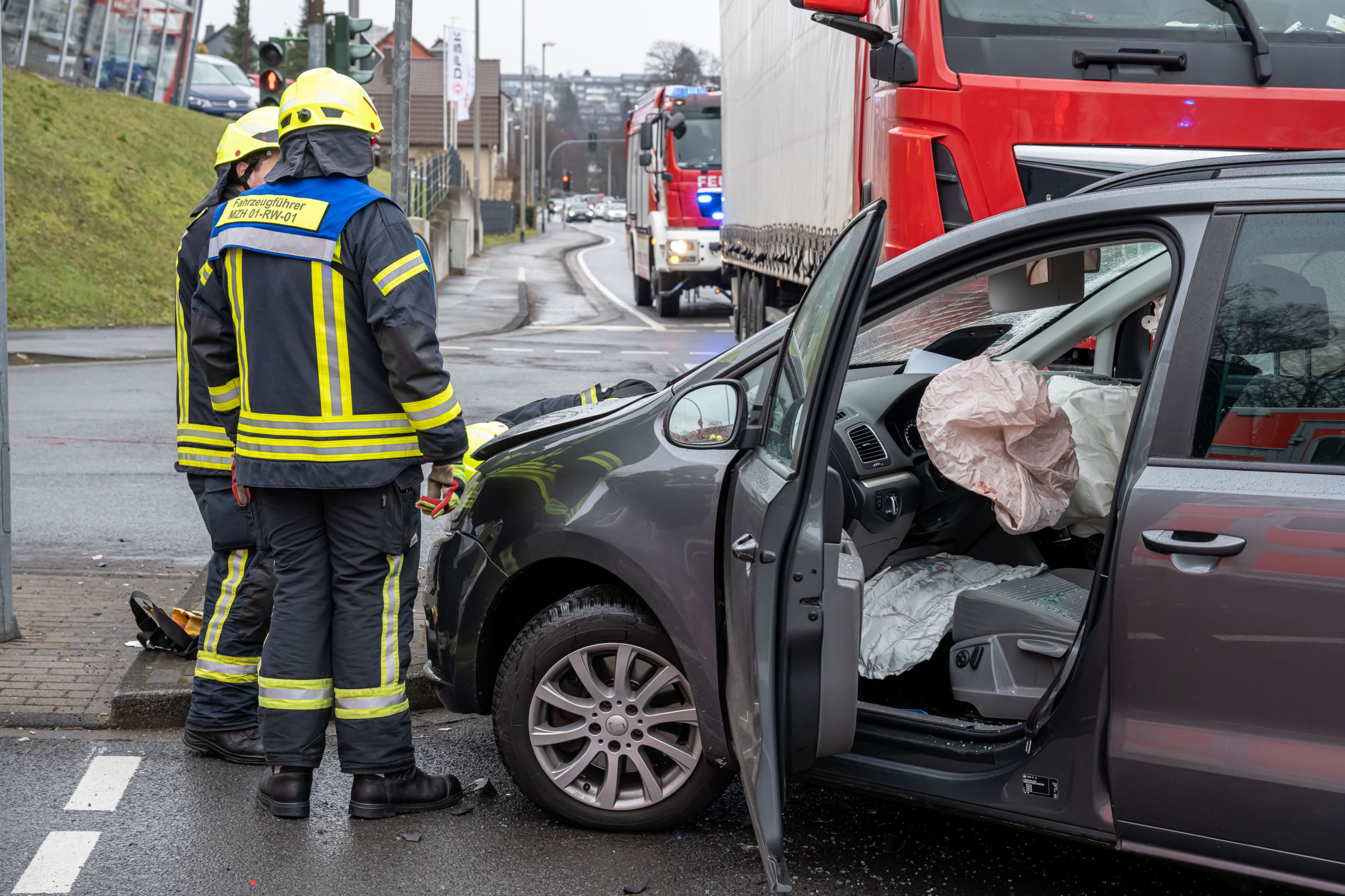 Der LKW-Fahrer befuhr die B54 in Richtung Kierspe. Er konnte den Unfall nicht verhindern und prallte frontal in die Beifahrerseite des Autos. An beiden Fahrzeugen entstand Sachschaden. Am Lkw sind die Schäden vergleichsweise gering – der Pkw wurde jedoch völlig zerstört. Zahlreiche Airbags haben hier gezündet.