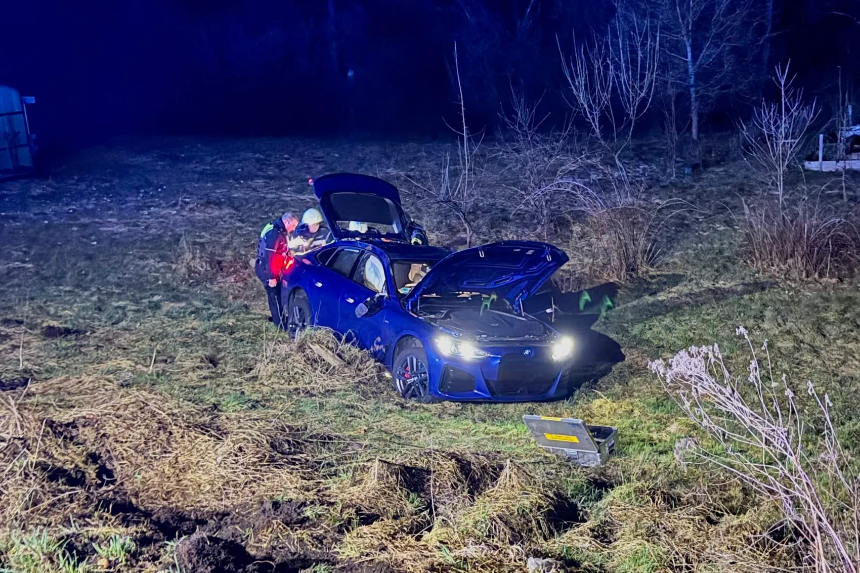 Die Feuerwehr sicherte die Unfallstelle und nahm Sicherungsmaßnahmen an dem Fahrzeug vor. Da es sich um ein Elektroauto handelte, klemmten die Einsatzkräfte die Batterien ab und trennten den Hochvolt-Trennschalter. Auslaufende Betriebsstoffe wurden nach Angaben der Feuerwehr nicht festgestellt.