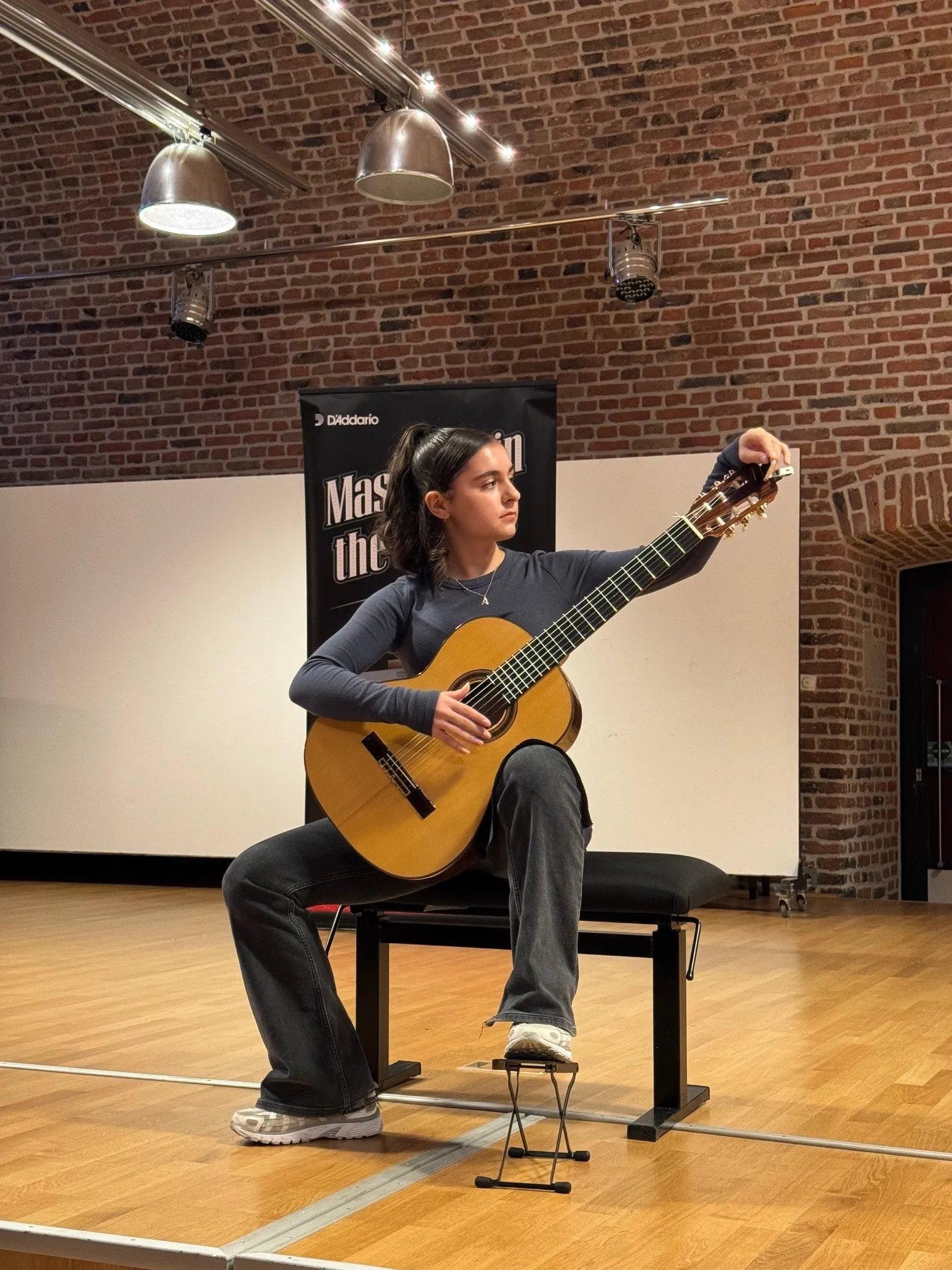 Für den Wettbewerb hatte Ayla Middelhoff ein knapp zwölfminütiges Programm mit Werken aus drei Epochen ausgewählt. Zu hören waren ein klassisches Werk von Mauro Giuliani sowie das berühmte Prélude aus Bachs erster Cello-Suite (BWV 1007) in einer Bearbeitung für Gitarre. Außerdem wählte Ayla als Pflichtstück „Wenn die Drachen tanzen“ aus dem 2025 von Margit Gruber komponierten Zyklus „12 verrückte Träume“. Die Punktabstände waren am Ende hauchdünn, bescheinigten die Jurymitglieder. Daher ging das Treppchen dieses Mal leider an andere. Doch für ihren Lehrer Arne Willems steht fest: „Ayla hat gewonnen. Sie ist über sich hinausgewachsen und hat alles gegeben.“