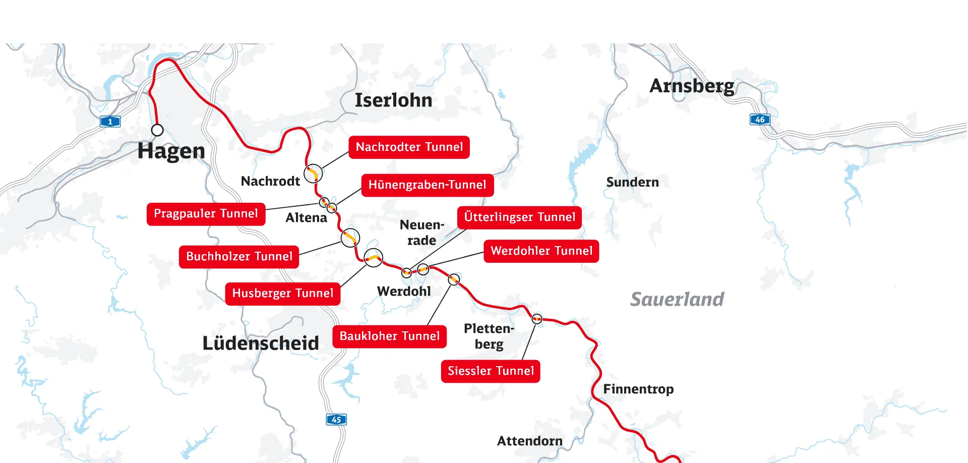 Dass die Brücken ins Zentrum der Betrachtung rücken, versteht sich von selbst. Die schwierigsten Bauwerke aber sind die zehn Tunnel, die aufgeweitet oder ersetzt werden müssen. Allein im Märkischen Kreis sind es neun Tunnel, die in den Blick genommen werden; im Südsauerland kommt der Rahrbacher Tunnel als Nummer zehn hinzu.