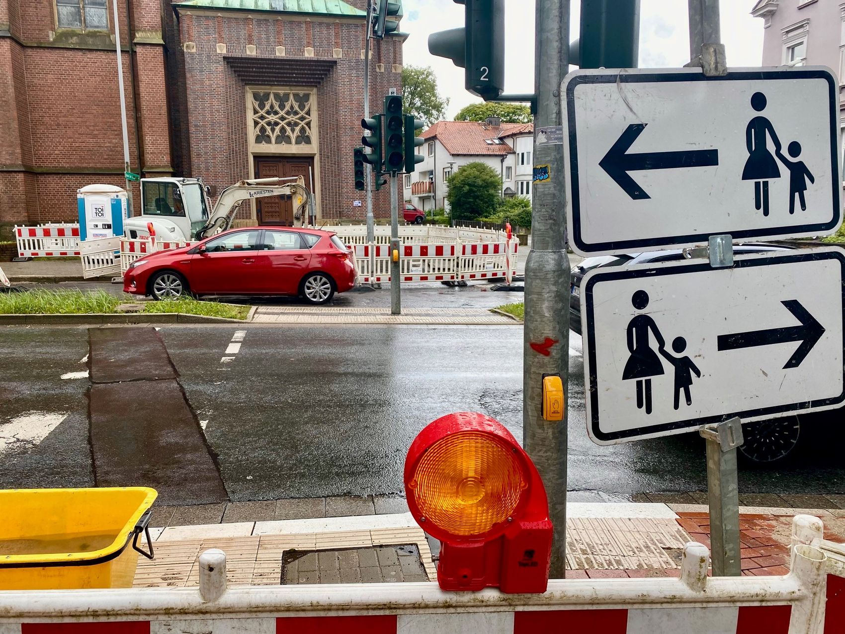 Seit dem 21. Juni ist der Übergang für Fußgänger komplett gesperrt. Passanten müssen den nahegelegenen Übergang in Höhe der Einmündung Freiherr-vom-Stein-Straße nutzen. Die taktilen Bodenbeläge, die blinden und sehbehinderten Menschen die Orientierung erleichtern sollen, sind sowohl auf der Mittelinsel als auch im Bereich des Ampelmasts verbaut worden, der vor der Sparkasse steht.