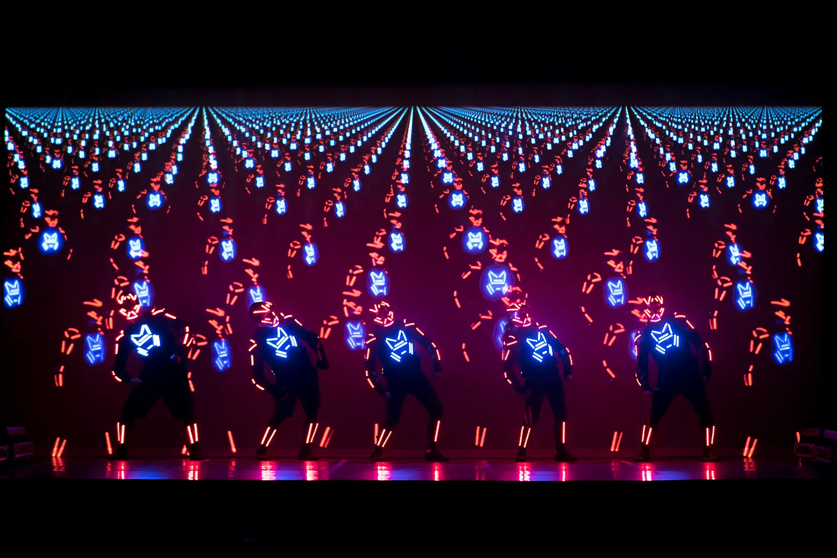 Die Tänzer bewegen sich zwischen futuristischem Roboter-Style, Aerial Dance und Akrobatiknummern, während Projektionen, Laser, LED-Kostüme, Mapping und interaktive Visuals die Szene visuell unterstützen sollen.