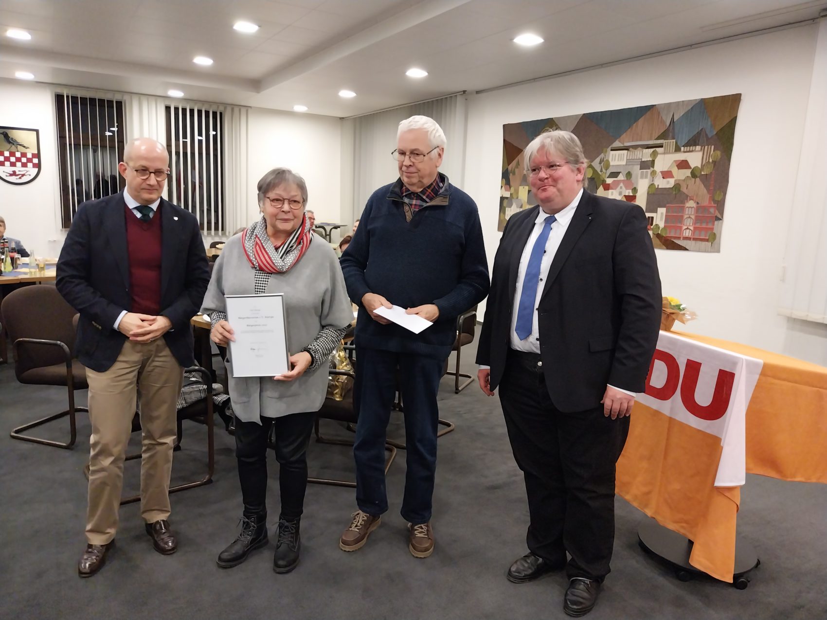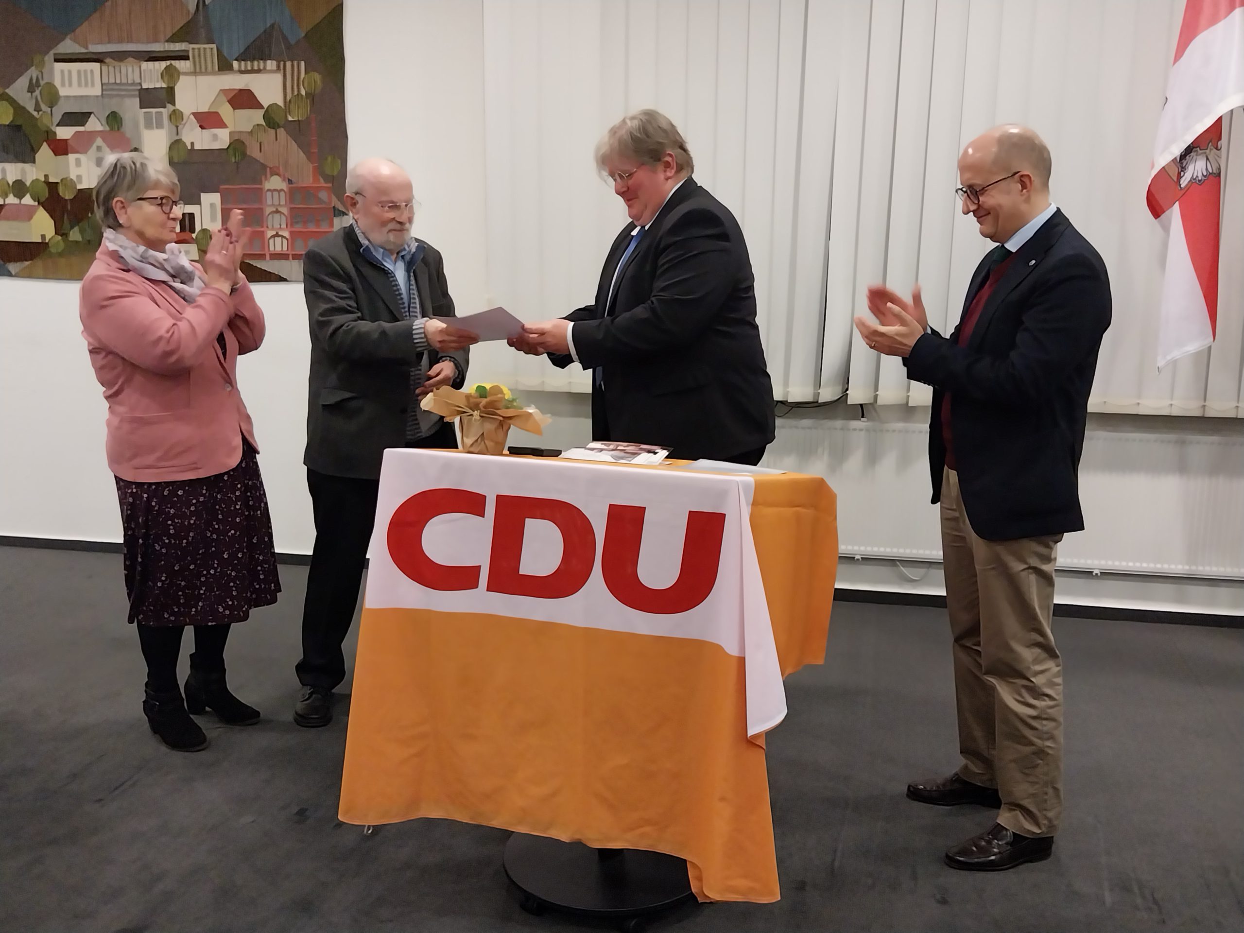 Außerdem wurden im offiziellen Teil der Veranstaltung Marie-Luise Linde und Siegried Treitz für ihre langjährigen Mitgliedschaften in der CDU durch den Fraktionsvorsitzenden Holger Scheel mit einer Urkunde und durch Schwarzkopf mit einer Ehrennadel gewürdigt.
