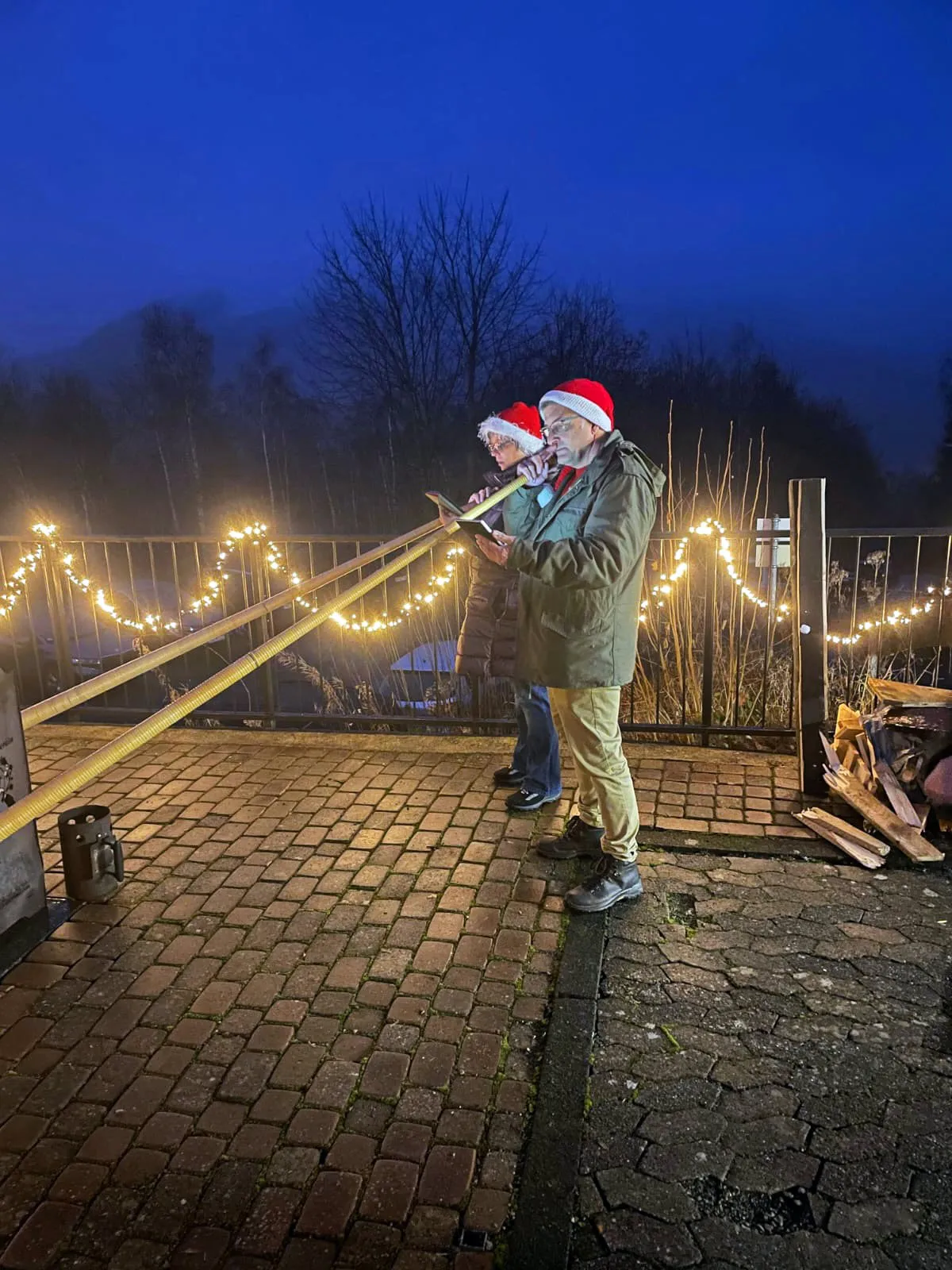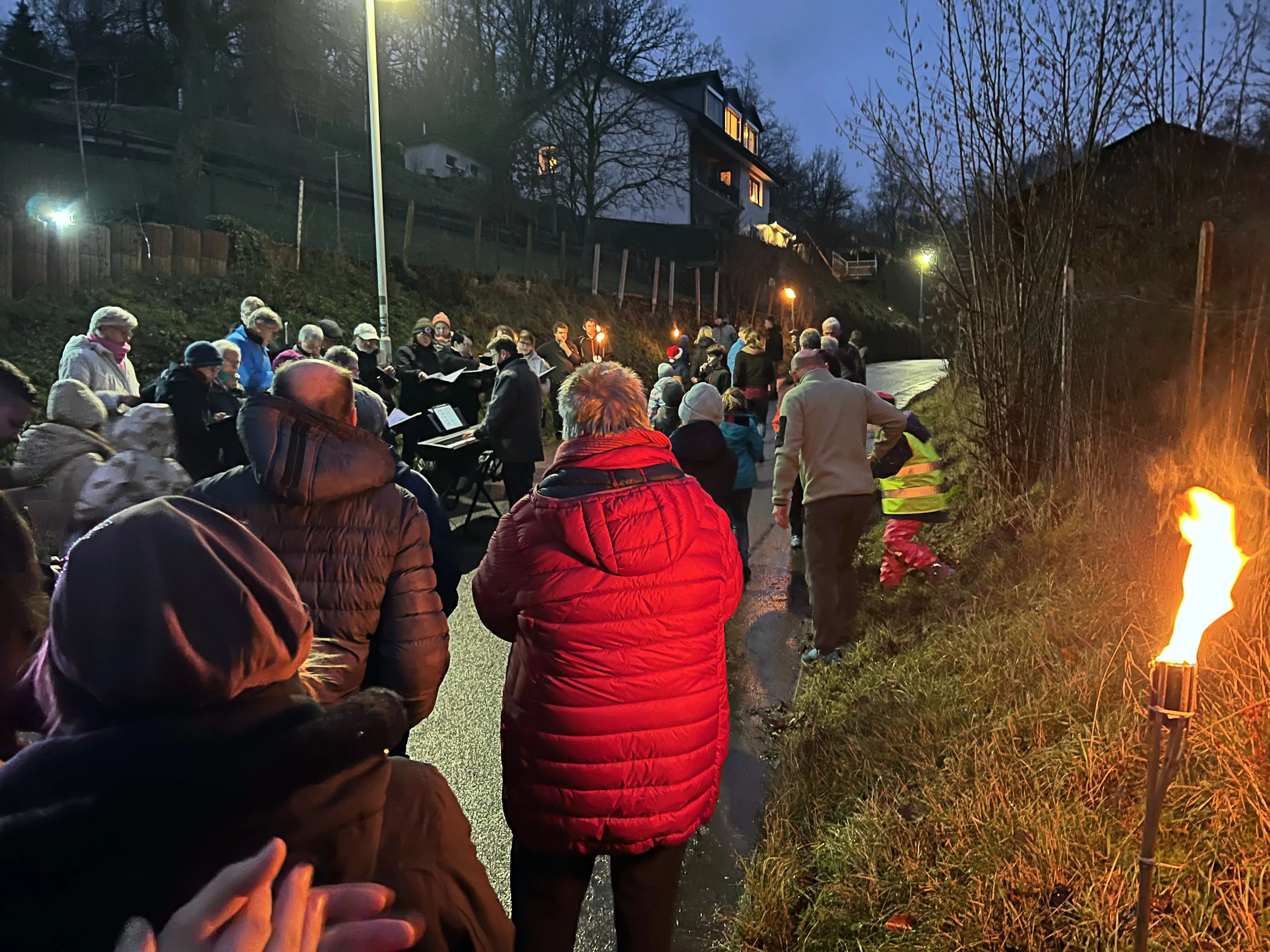 Auf dem weiteren Weg durch den Lichterzauberwald hinauf zum Schützenheim Auf der Wieckmerth hörten die Spaziergänger Alphornklänge, die die romantische Stimmung noch verstärkten. Das Schützenkönigspaar Rica und Thomas May spielte auf den traditionellen Schweizer Blasinstrumenten und sorgte so für einen wunderschönen zusätzlichen Akzent.
