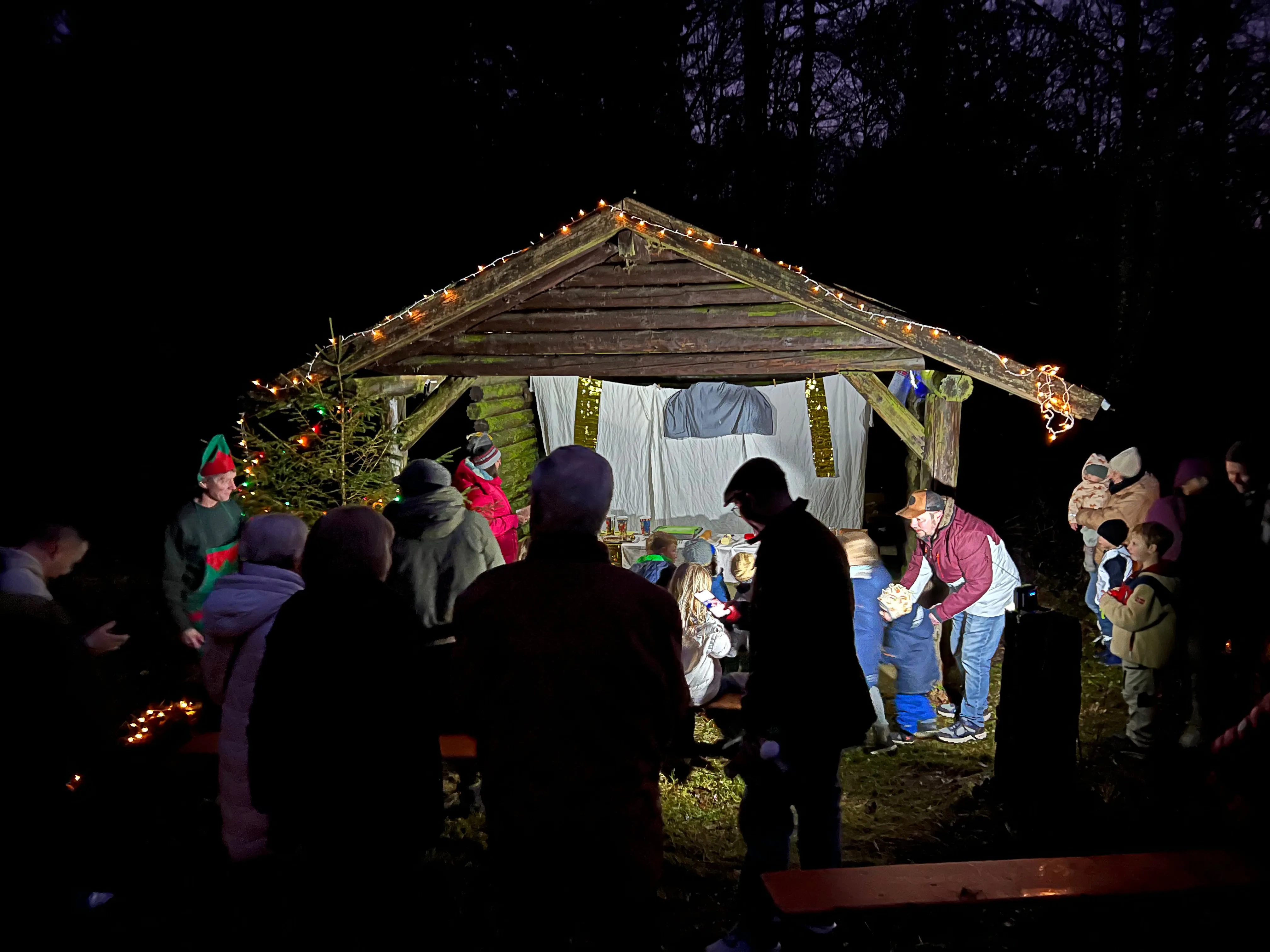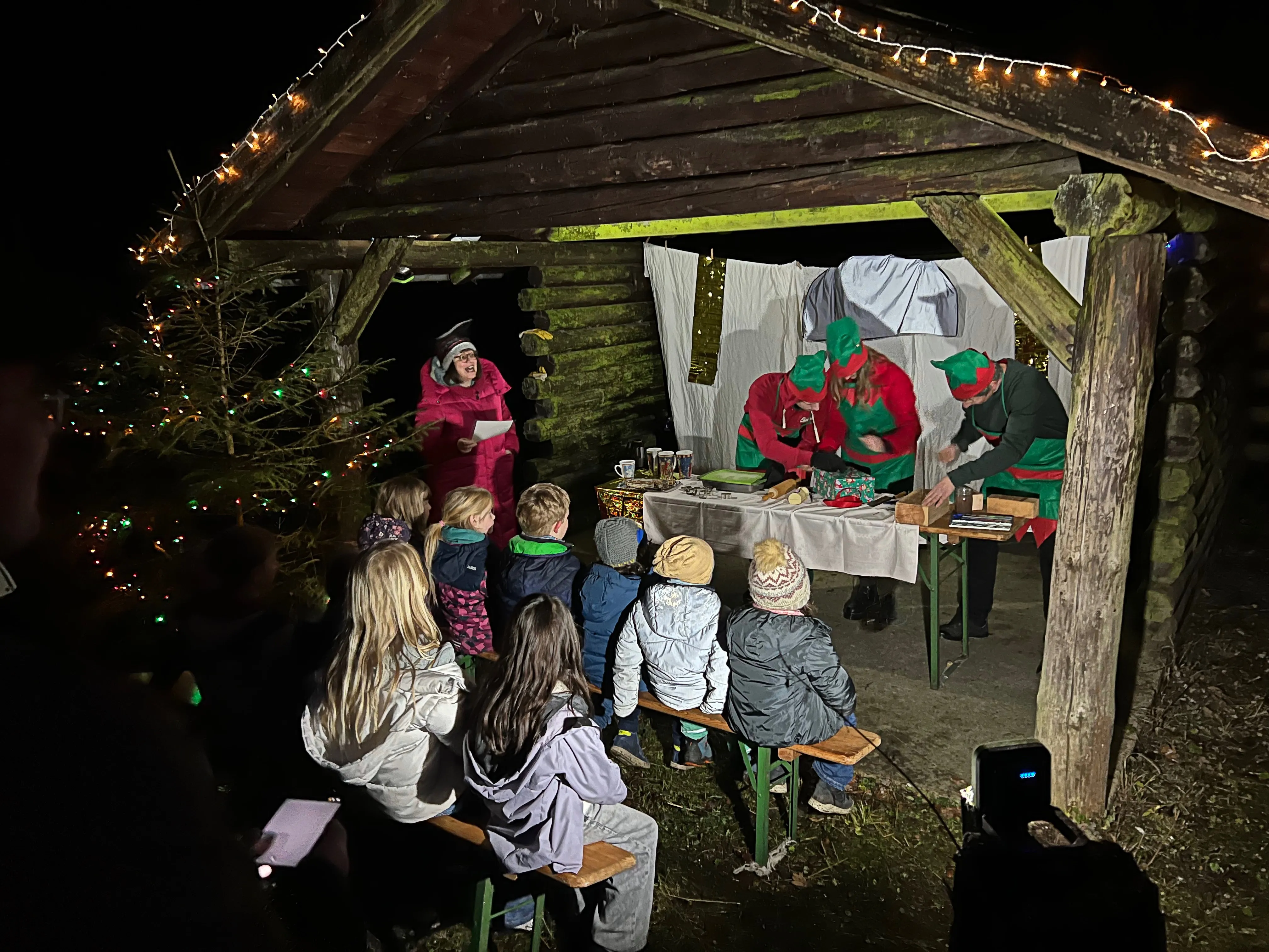 So stimmte der gemischte Chor Con Brio aus Sundern-Hagen die Spaziergänger am Anfang des Weges oberhalb des Hotels Battenfeld mit weihnachtlichen Liedern ein. Etwa auf halber Strecke lud die Laienspielgruppe Leinschede, die sich aus Mitgliedern der Familien Breuckmann und Fuhrich zusammensetzt, zu einer willkommenen Pause ein. Die zahlreichen kleinen und großen Besucher des Lichterzaubers konnten Weihnachtswichteln zuschauen und zuhören, die emsig durch die Hütte am ehemaligen Grillplatz wuselten.