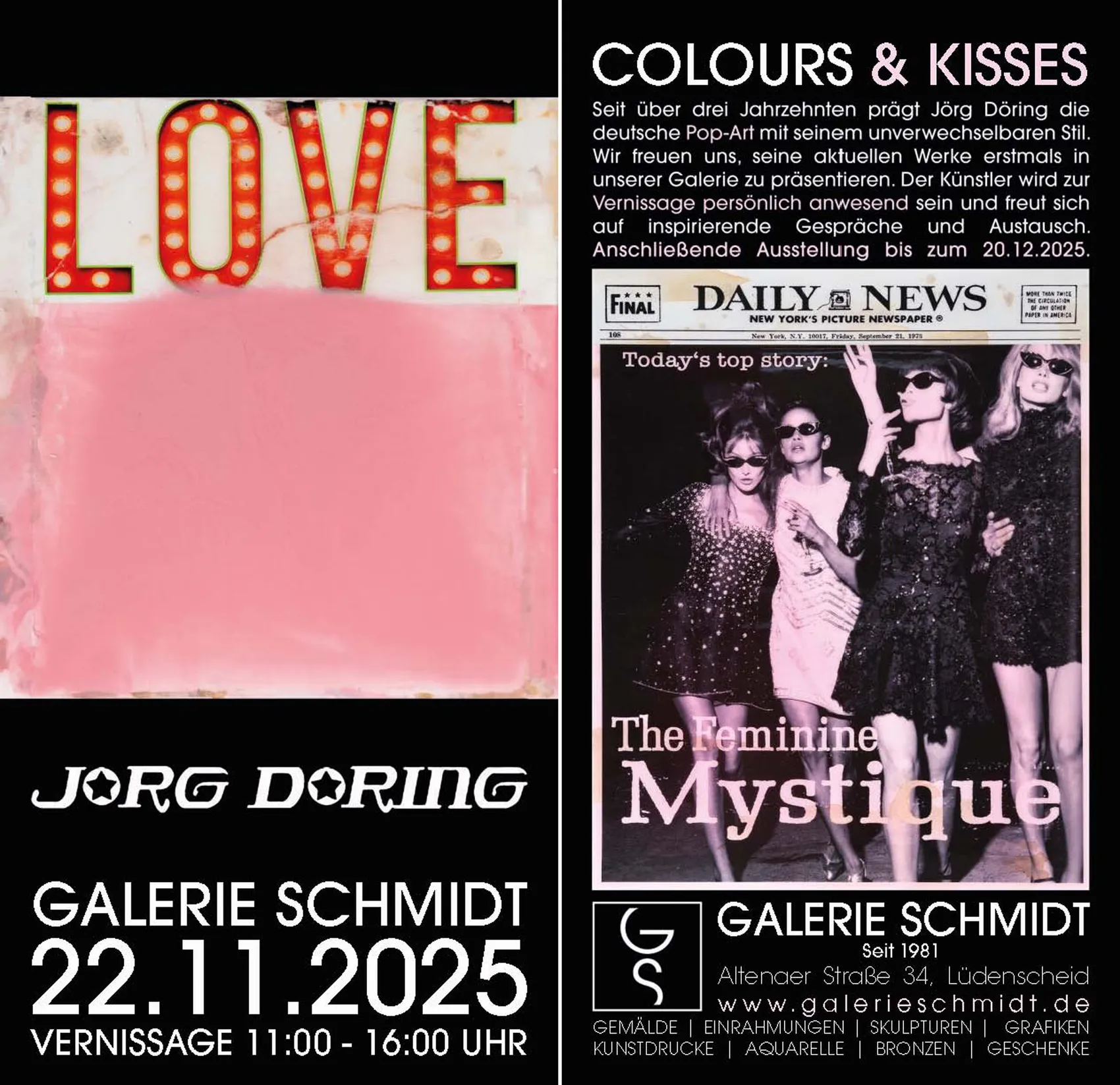 Die Galerie Schmidt präsentiert vom 22. November bis zum 20. Dezember eine neue Ausstellung mit Werken des bekannten Düsseldorfer Pop-Art Künstlers Jörg Döring. Unter dem Titel „Colours & Kisses“ zeigt die Galerie eine Auswahl seiner neuesten Arbeiten, in denen Comic, Film, Popkultur und gesellschaftliche Themen auf unverwechselbare Weise verschmelzen.