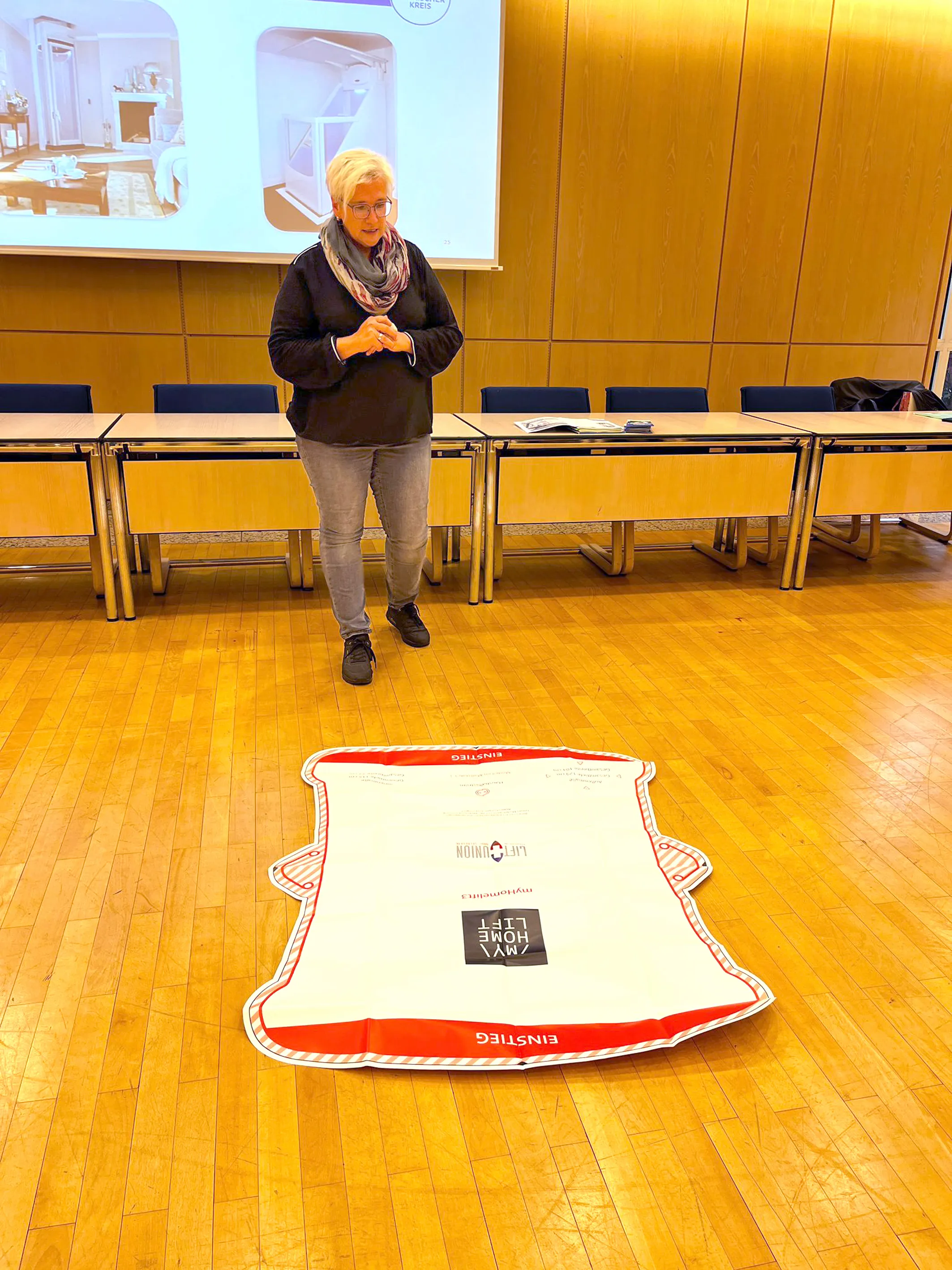 Es ging um das seniorengerechte Wohnen im eigenen Haus bzw. der eigenen Wohnung. Dazu gehört unter anderem ein barrierefreier Zugang zum Gebäude mit Rampen oder Liften. In den Räumen sind praktische Hilfen wie kleine Leitern mit Geländer, um sicher an Fächer bei Schränken zu kommen, ein Segen.