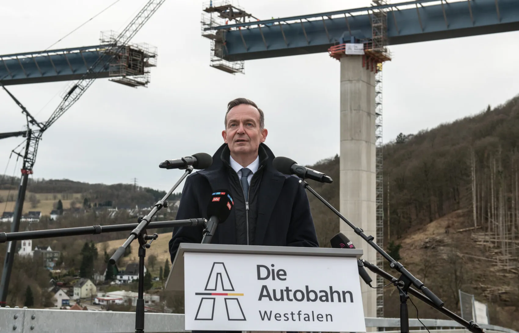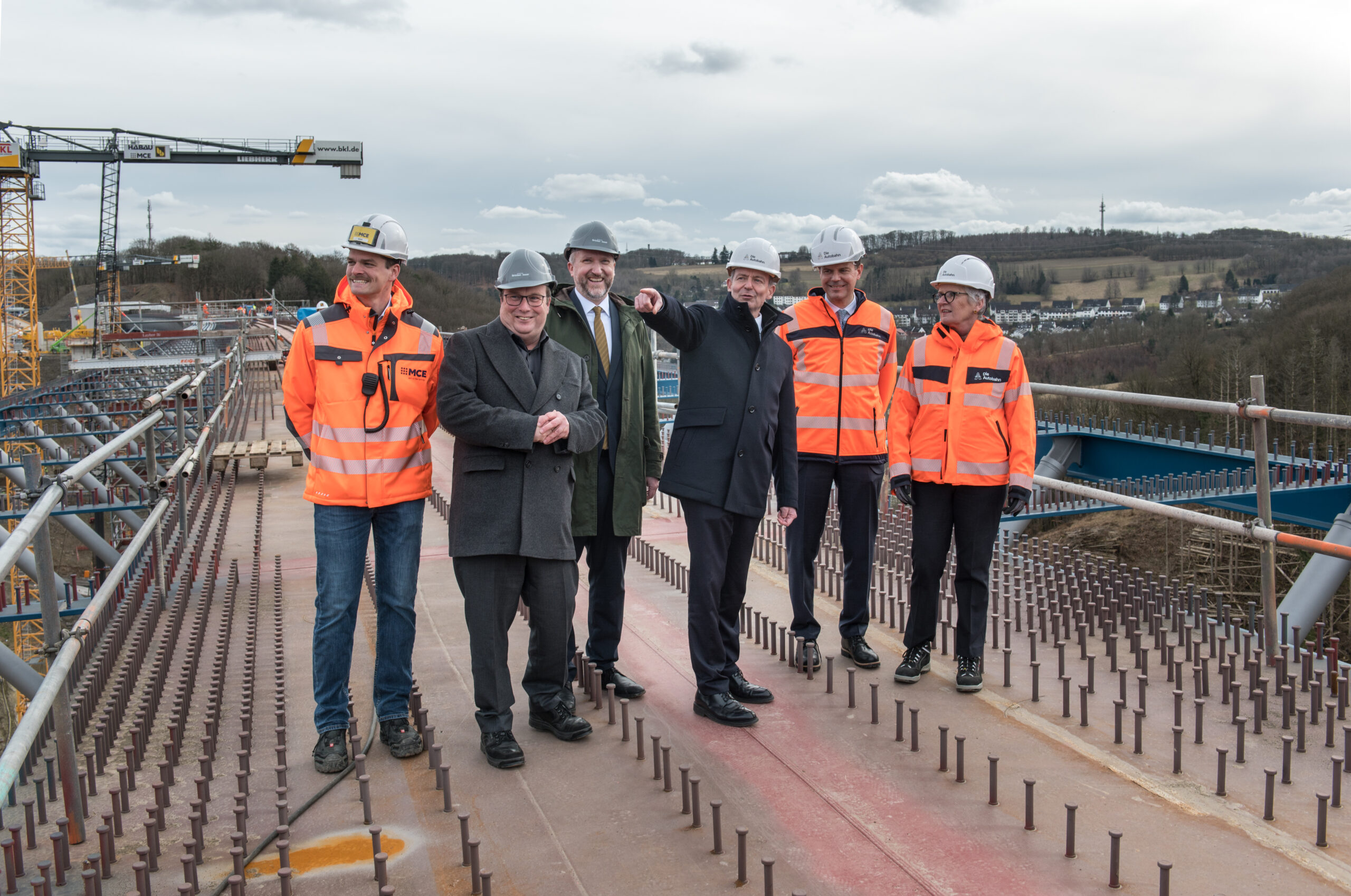 25. Februar: Für die Stahlhochzeit an der A45-Talbrücke Rahmede war es ein wenig zu früh. Der Brückenschluss wird voraussichtlich erst am Mittwochabend, 26. Februar, erfolgen. Grund zum Feiern gab es trotzdem. „Noch vor Sommer 2026 wird Verkehr über diese Brücke rollen“, versprach Dr. Volker Wissing, Bundesminister für Digitales und Verkehr, vor zahlreichen Gästen aus Politik, Wirtschaft und Verbänden.