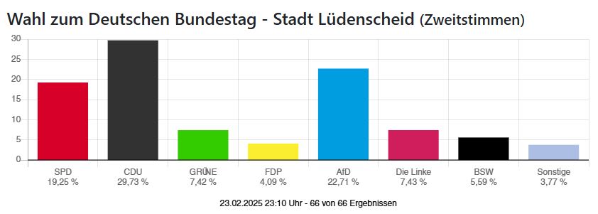 23. Februar: Bei der Bundestagswahl konnte sich die CDU in Lüdenscheid mit 29,73 Prozent der Zweitstimmen als stärkste Kraft behaupten. Die AfD verzeichnete 22,71 Prozent — was einen deutlichen Stimmenzuwachs bedeutet. Drittstärkste Kraft ist die SPD mit 19,25 Prozent. Die Grünen erreichten 7,42 Prozent der Stimmen und lagen damit knapp hinter der Linken, die mit 7,43 Prozent ein nahezu identisches Ergebnis erzielte. Die FDP kam auf 4,09 Prozent, während das erstmals angetretene Bündnis Sahra Wagenknecht (BSW) 5,59 Prozent erzielte.