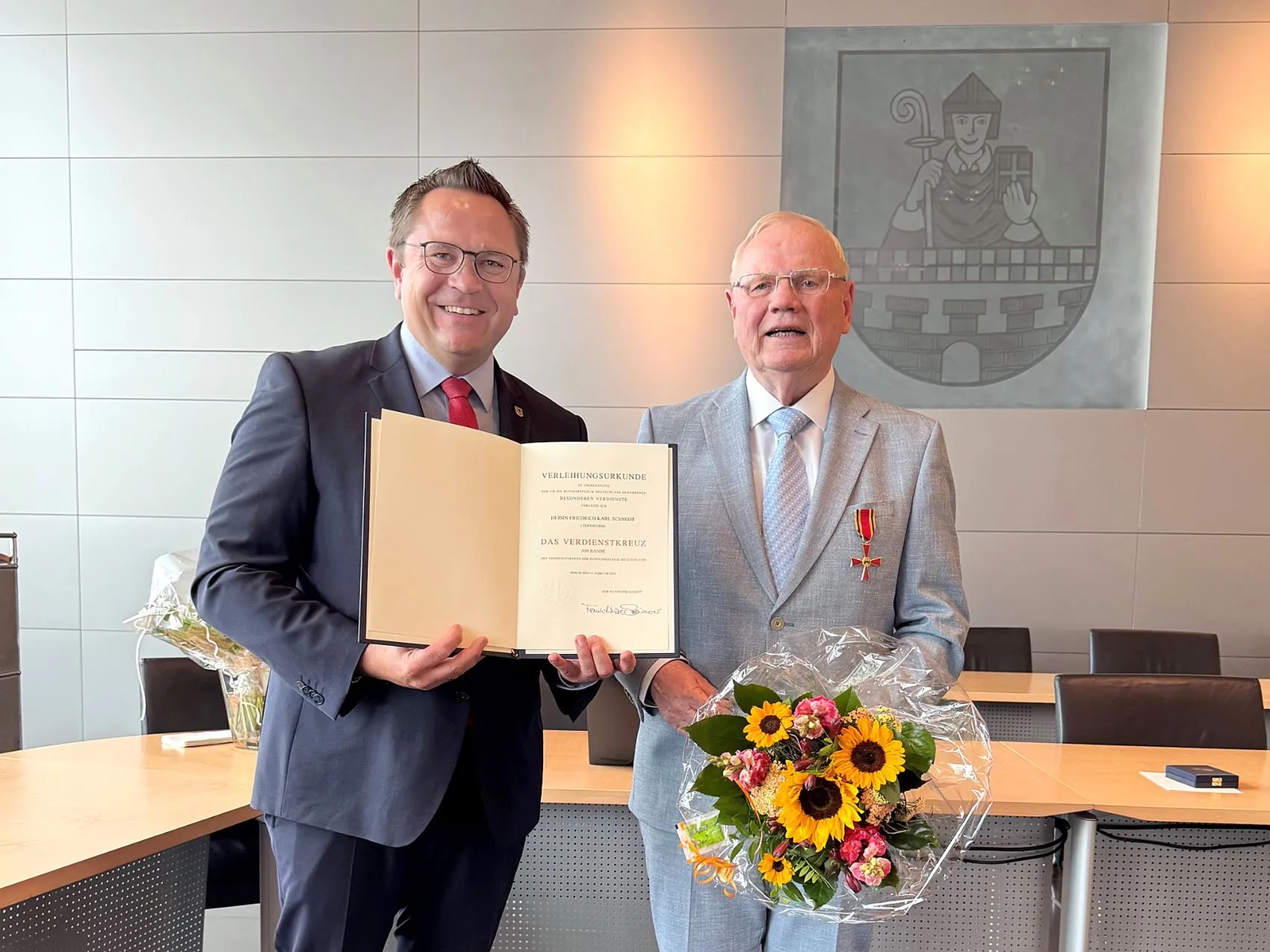 Ehemaliger Bürgermeister Friedrich-Karl Schmidt (CDU) erhält Bundesverdienstkreuz. Bundespräsident Frank-Walter Steinmeier hat dem früheren Lüdenscheider Bürgermeister Friedrich Karl Schmidt (82) aus Lüdenscheid das Verdienstkreuz am Bande des Verdienstordens der Bundesrepublik Deutschland verliehen. Das Staatsoberhaupt würdigte damit jahrzehntelanges Engagement im heimatlichen, sozialen und kirchlichen Bereich. Landrat Marco Voge überreichte Schmidt die Auszeichnung im Ratssaal des Rathauses der Stadt Lüdenscheid.