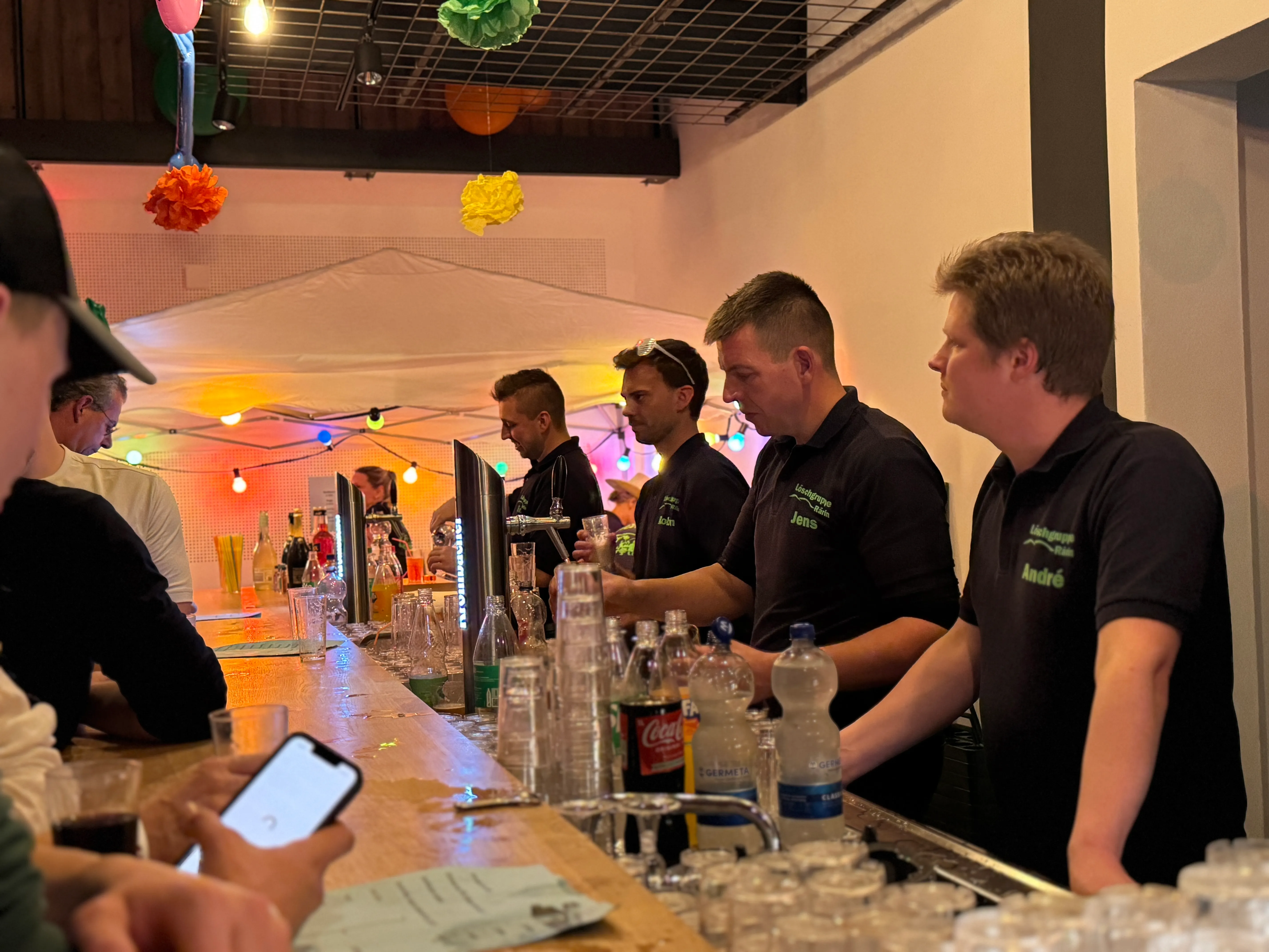 30 Helfer der Löschgruppe Rärin (Mitglieder, Partnerinnen und Ehrenkameraden) hatten auf der Party alle Stationen im Griff und sorgten nach Kräften für ihre Gäste. Zu essen gab’s Frikadellen im Brötchen, Mettwürstchen, Bockwurst und Brezeln. Bei den Getränken wurden Bier, Cola, Fanta, Wasser, Sprite, dazu Schnäpse, Hugo, Aperol Spritz und Wein angeboten. Hinter der Theke und in der Küche lief alles reibungslos; auch hier funktionierte die Feuerwehrkameradschaft tadellos. Das Team arbeitete super zusammen. 30 Helfer der Löschgruppe Rärin (Mitglieder, Partnerinnen und Ehrenkameraden) waren pausenlos im Einsatz.