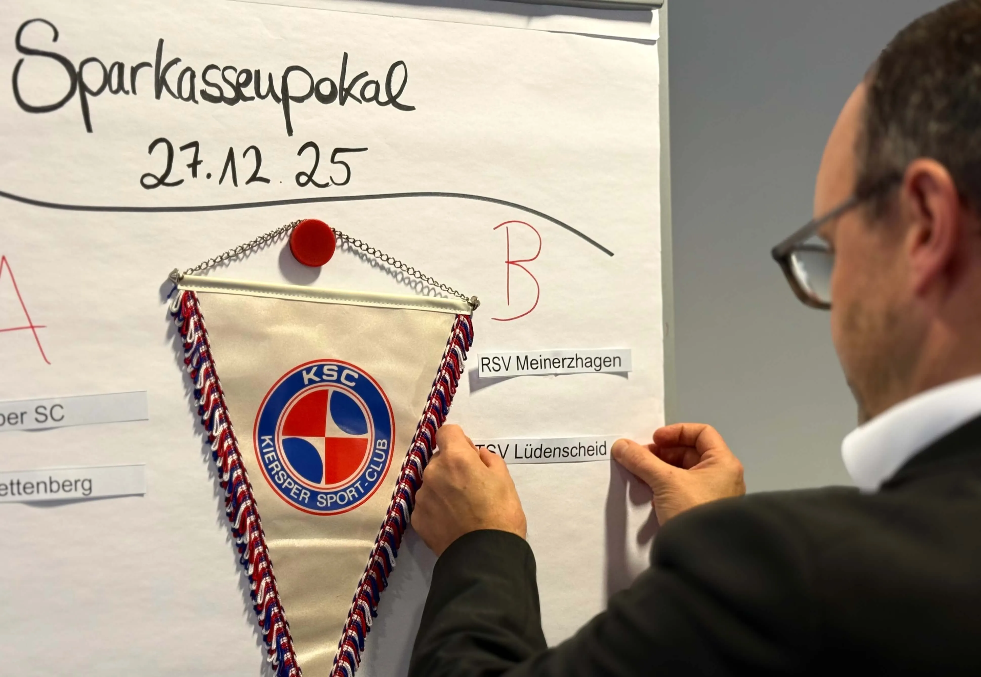 Die Auslosung der Gruppen fand am Dienstag, 2. Dezember, in der Hauptstelle der Sparkasse in Kierspe statt. Als „Glücksfee" zog Sina Berges vom Marketingteam der Sparkasse die beiden Fünfergruppen. Angeführt werden sie vom Kiersper SC als Ausrichter sowie vom RSV Meinerzhagen, der als höchstspielende Mannschaft (Westfalenliga) die Gruppe B anführt.