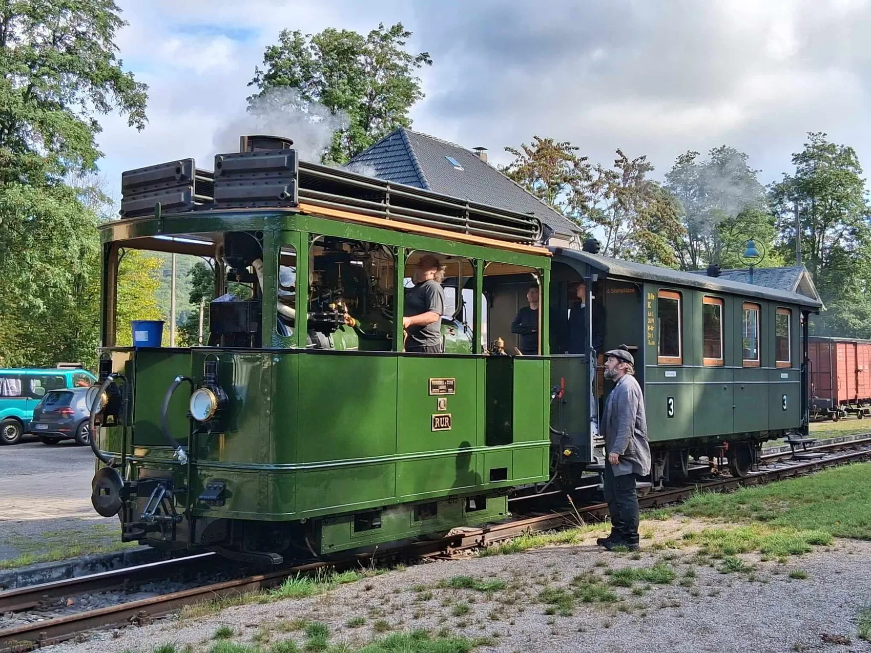 Erwartet wird die Dampflok RUR von 1899, die kürzlich nach 50jähriger Abstellung und gründlichster Aufarbeitung ihre Wiedergeburt erlebte. Die Kasten- oder auch Trambahnlok entstammt einer Bauart, die es in ähnlicher Weise auch bei der Plettenberger Straßenbahn gab.