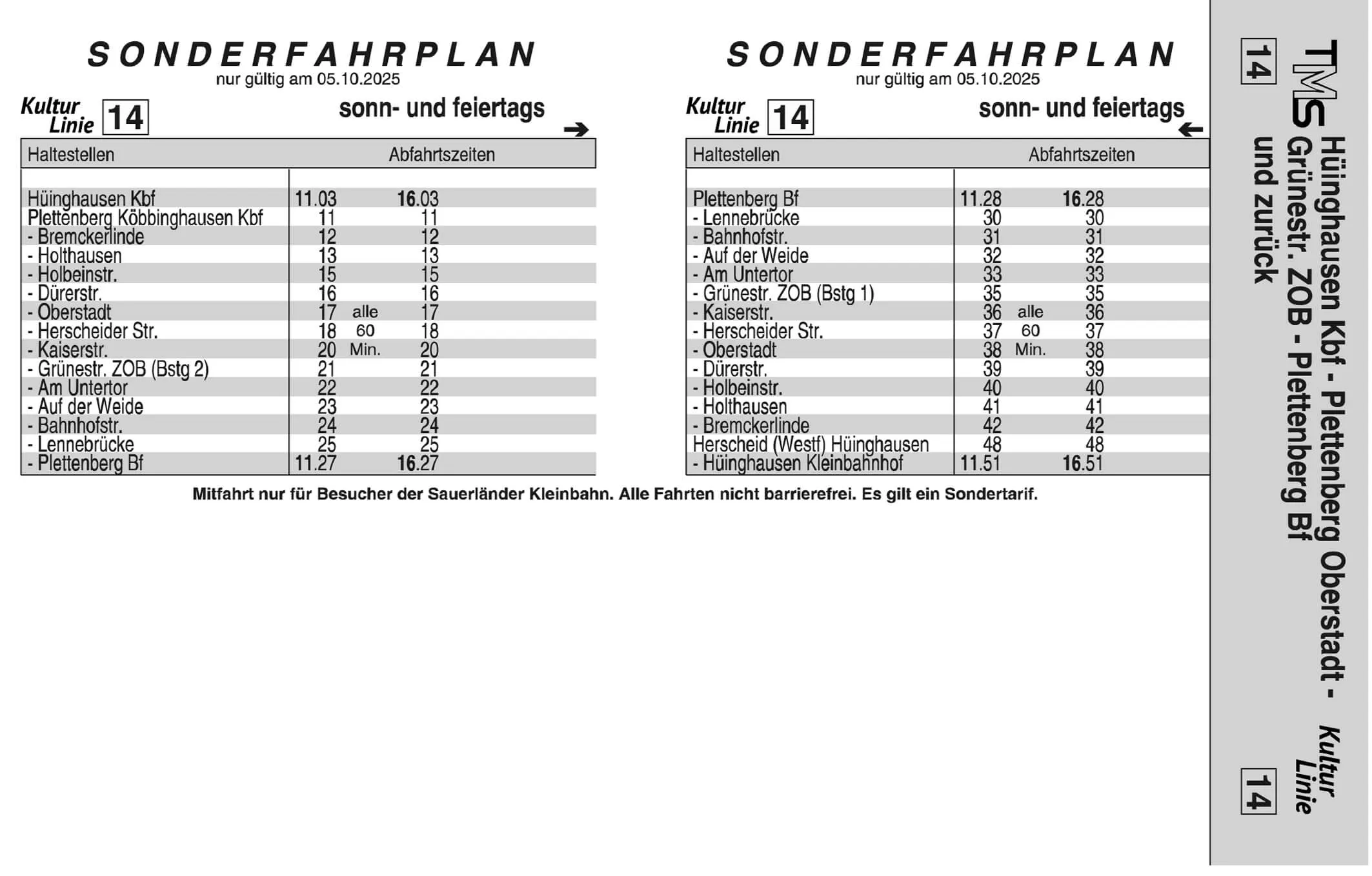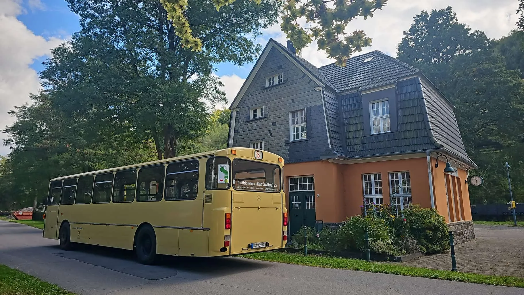 Zwischen Plettenberg-Eiringhausen Bahnhof, dem Innenstadtgebiet Plettenberg und dem Museumsbahnhof Hüinghausen pendelt der Traditionsbus Mark Sauerland stündlich.