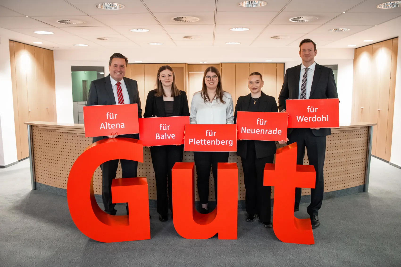 Drei Auszubildende der Vereinigten Sparkasse im Märkischen Kreis haben ihre Abschlussprüfung mit Erfolg bestanden. Jade Fischer, Sophia Taubert und Alina Köster sind jetzt ausgebildete Bankkauffrauen und setzen ihre Karriere bei der Sparkasse fort.