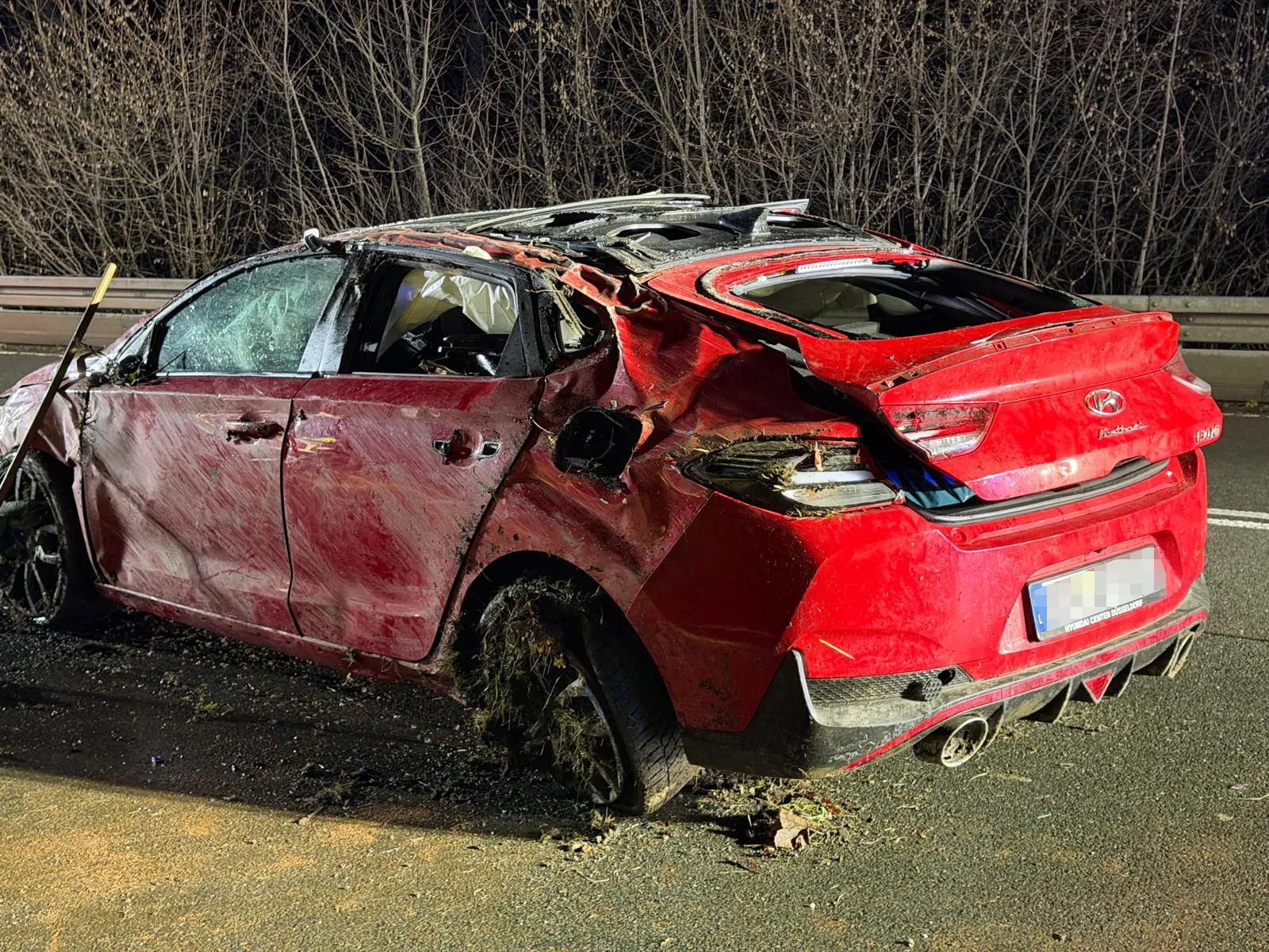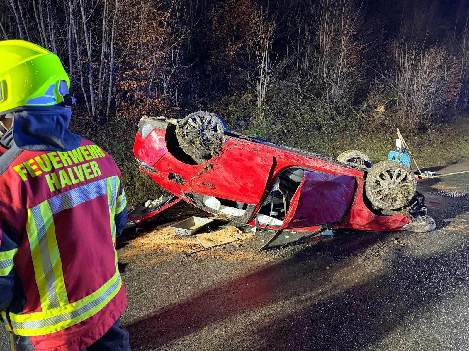 Um 22.56 Uhr wurde die Feuerwehr Halver zu einem Verkehrsunfall auf die B229 zwischen Halver und Schwenke alarmiert. Ein roter Hyundai verunfallte ohne Fremdbeteiligung, wie die Feuerwehr mitteilt. Die drei Insassen des im Ennepe-Ruhr-Kreis zugelassenen Pkw konnten sich vor Eintreffen der Feuerwehr aus dem stark beschädigten und auf dem Dach liegenden Fahrzeug retten. Sie wurden bis zum Eintreffen des Rettungsdienstes durch die Feuerwehr Halver erstversorgt.