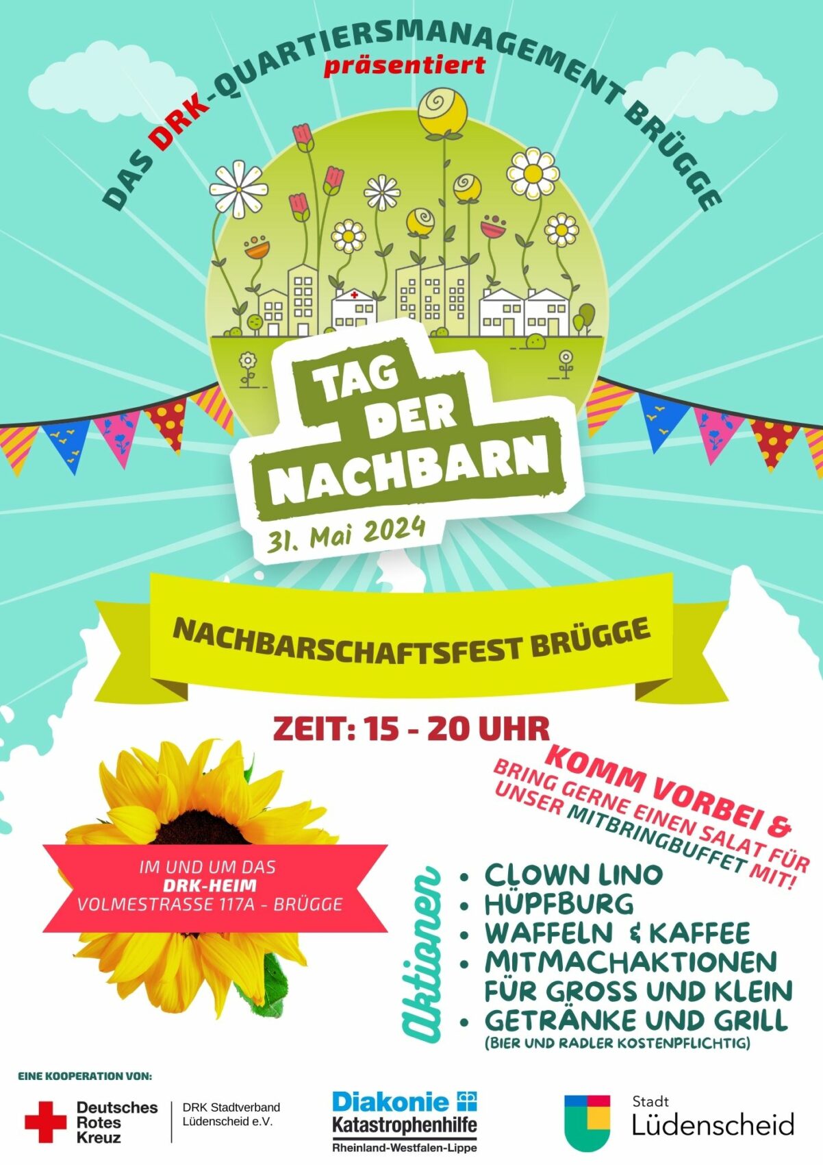Lüdenscheid/Brügge. Alle Brügger sind zum DRK-Heim an der Volmestraße 117a eingeladen. Los geht’s am Freitag, 31. Mai, um 15 Uhr: Die Organisatoren versprechen ein Programm für Groß und Klein. Dazu hofft das Team um Barbara Schmidt auf trockenes Wetter, denn es soll im Hof eine Hüpfburg geben; außerdem hat sich Clown „Lino“ angekündigt und wird mit Luftballons „ein wenig Schabernack treiben“. Der Kinder- und Jugendtreff aus Brügge unterstützt das Organisationsteam ebenfalls und bietet eine Bastelaktion an.