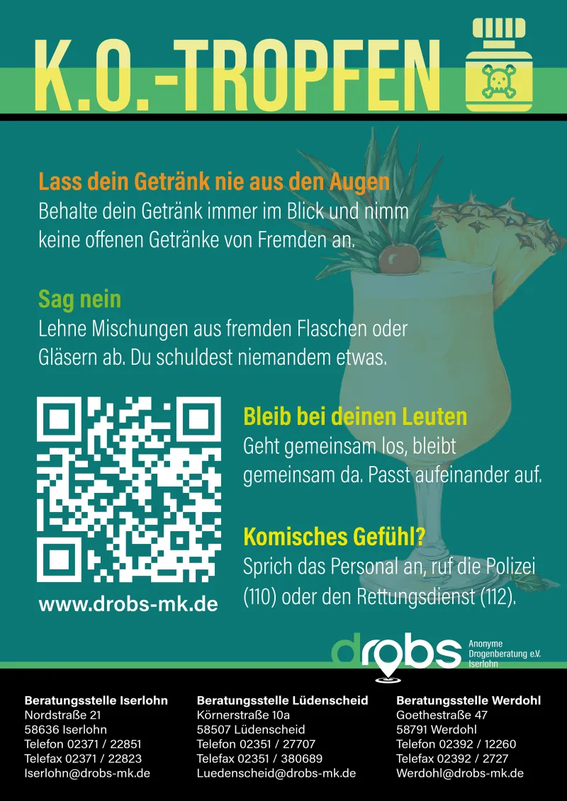 Die Anonyme Drogenberatung (Drobs) mit Sitz an der Körnerstraße weist mit einer neuen Plakataktion auf die Gefahren durch K.-o.-Tropfen hin. In einer Mitteilung der Beratungsstelle heißt es: „Auf vielen Veranstaltungen und Partys sind sie im Umlauf, medial hören wir immer wieder von Vorkommnissen, die im Zusammenhang mit den unsichtbaren, leicht salzig schmeckenden Tropfen stehen.“