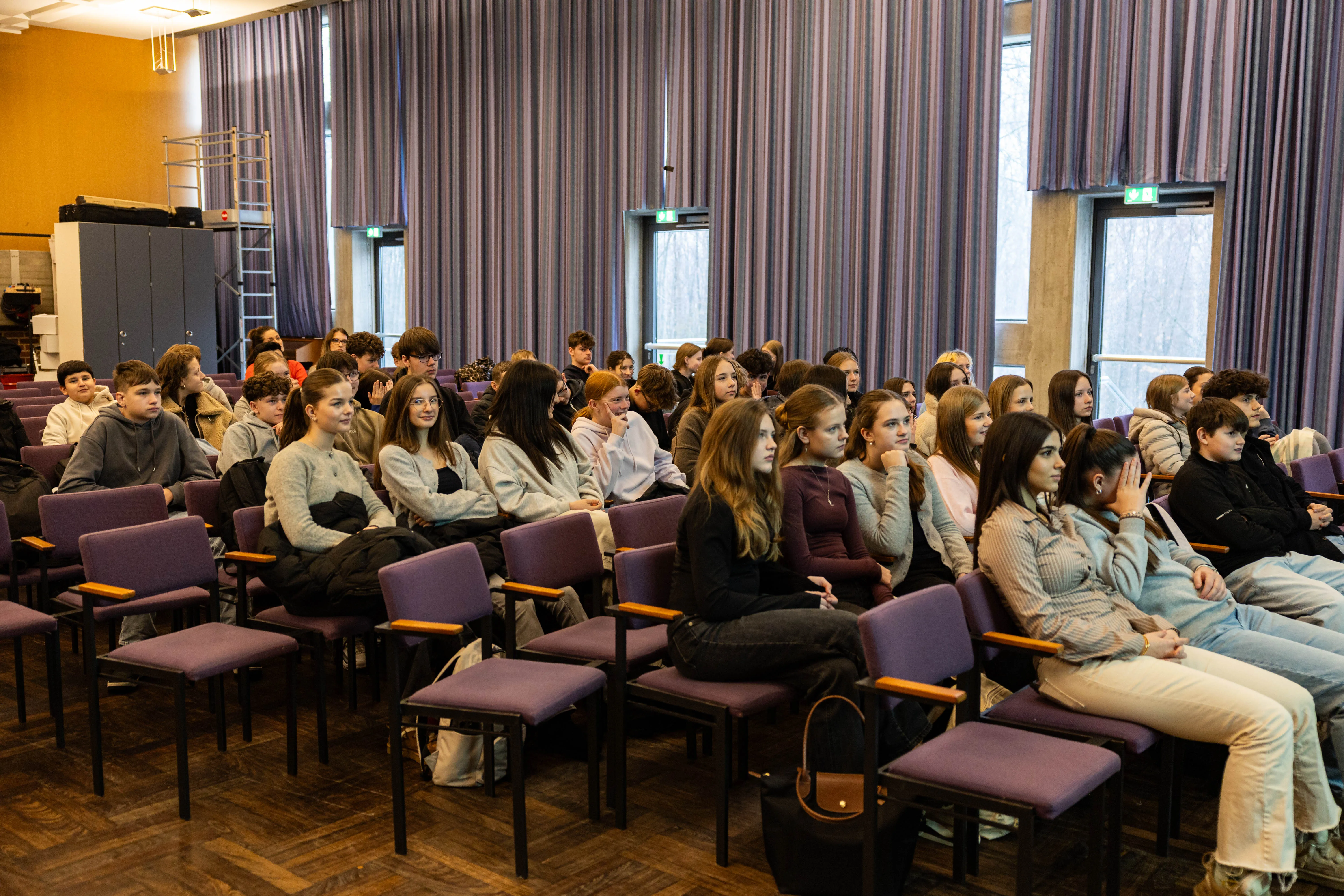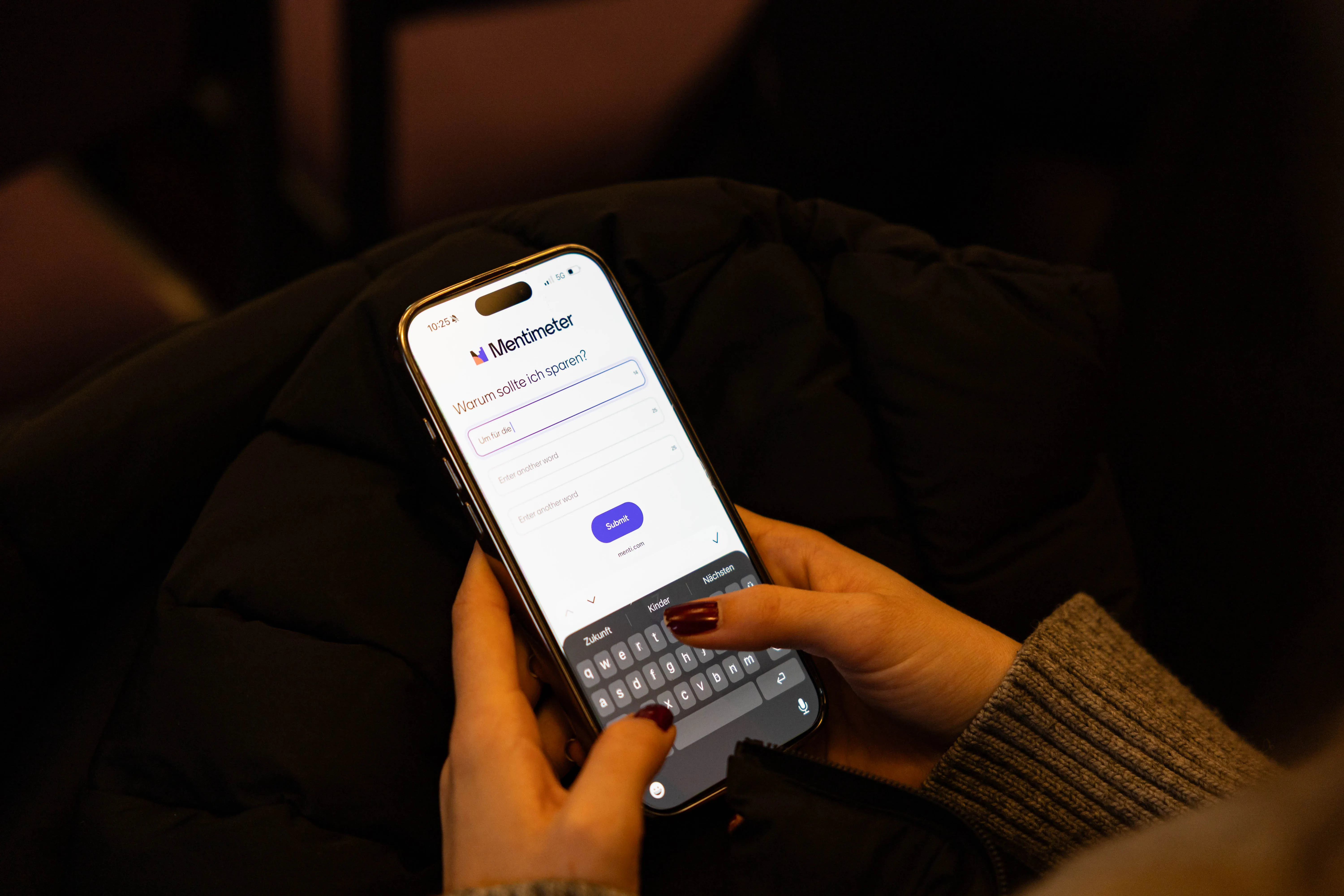 "So alt bin ich noch nicht, ich bin die Emily für euch", sagt Vitale lächelnd als sie die Schüler begrüßt. Sie beginnt ihren Vortrag mit der Frage, wer von den rund sechzig 14 bis 16-jährigen Schülern bereits ein eigenes (Giro-)Konto habe. Während bei dieser Frage noch viele Hände in die Höhe schnellen, werden es bei den folgenden Fragen, zum Beispiel nach speziellen Sparplänen, immer weniger. Nach einer anfänglichen Vorstellung und Abfrage zum Grundwissen der Schüler geht es um die Ziele, die jeder für sich mit dem Sparen verbindet. Um die Veranstaltung aufzulockern nutzt Vitale digitale Umfragen, bei denen die Antworten der Schüler per Beamer direkt auf die Leinwand in der Aula des Gymnasiums geworfen werden; im Anschluss tauschen sich die Schüler über die Antworten aus.