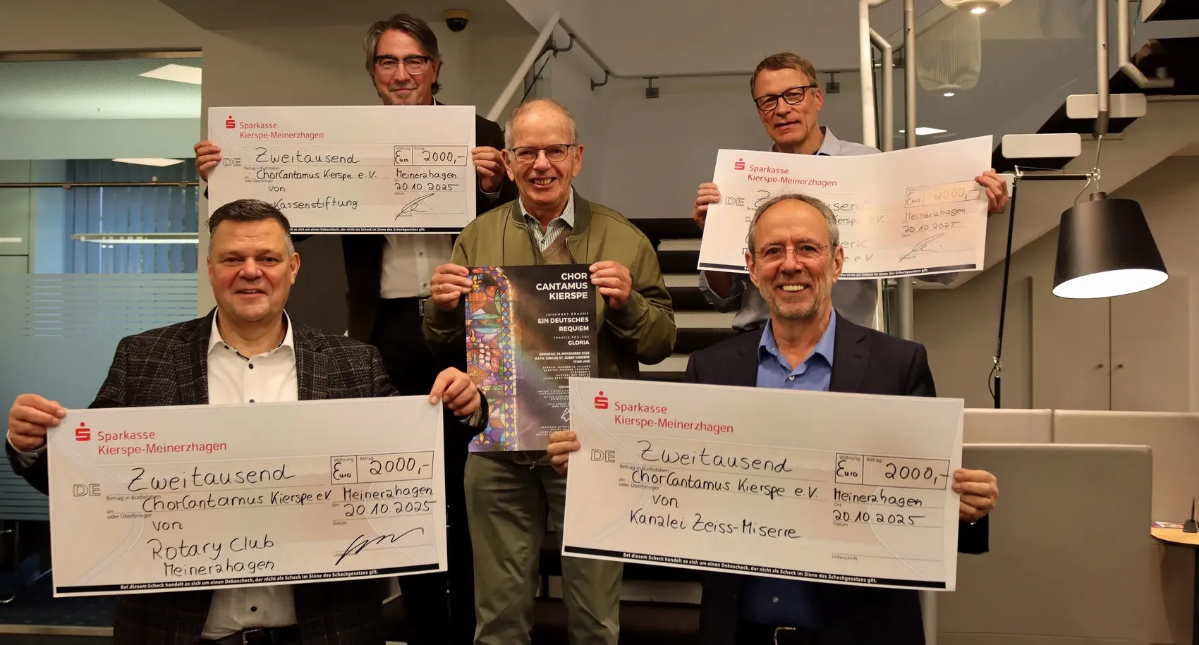 „Das könnten wir nicht ohne die Unterstützung machen“, wies Bisterfeld beim Pressetermin in der Sparkasse Meinerzhagen auf die Bedeutung der Sponsoren hin. Ein Konzert mit einem großen Orchester und Solisten schlägt mit 20.000 Euro zu Buche. Jeweils 2000 Euro steuern die Sparkasse, der Rotary-Club Meinerzhagen, das Lions-Hilfswerk Meinerzhagen und die Kanzlei Zeiss-Miserre bei. Unterstützung bei Organisation und Technik leisten auch die Stadt Meinerzhagen (Podeste) und die Stadt Kierspe (Stühle). Damit können 350 Besucher in der St. Josef Kirche untergebracht werden.