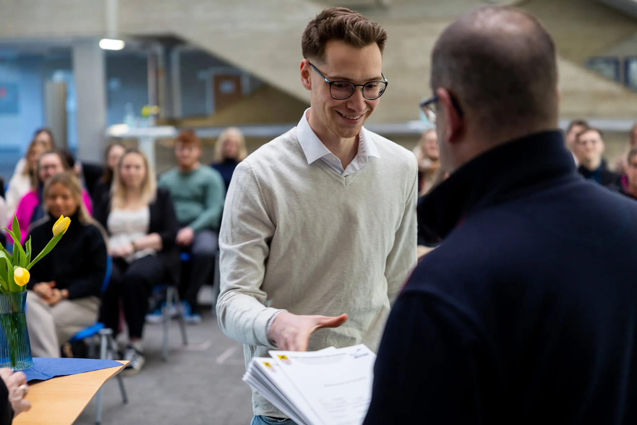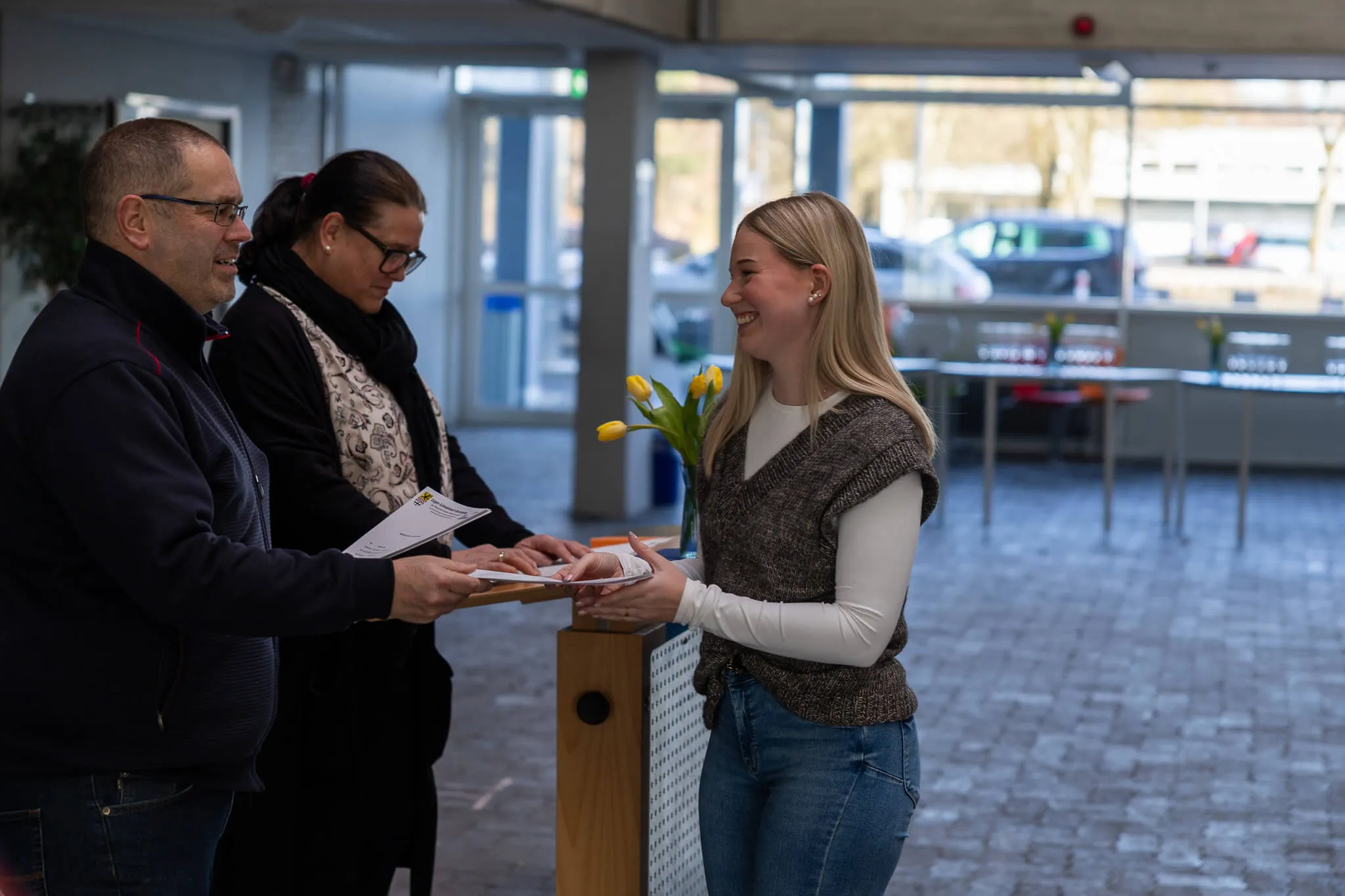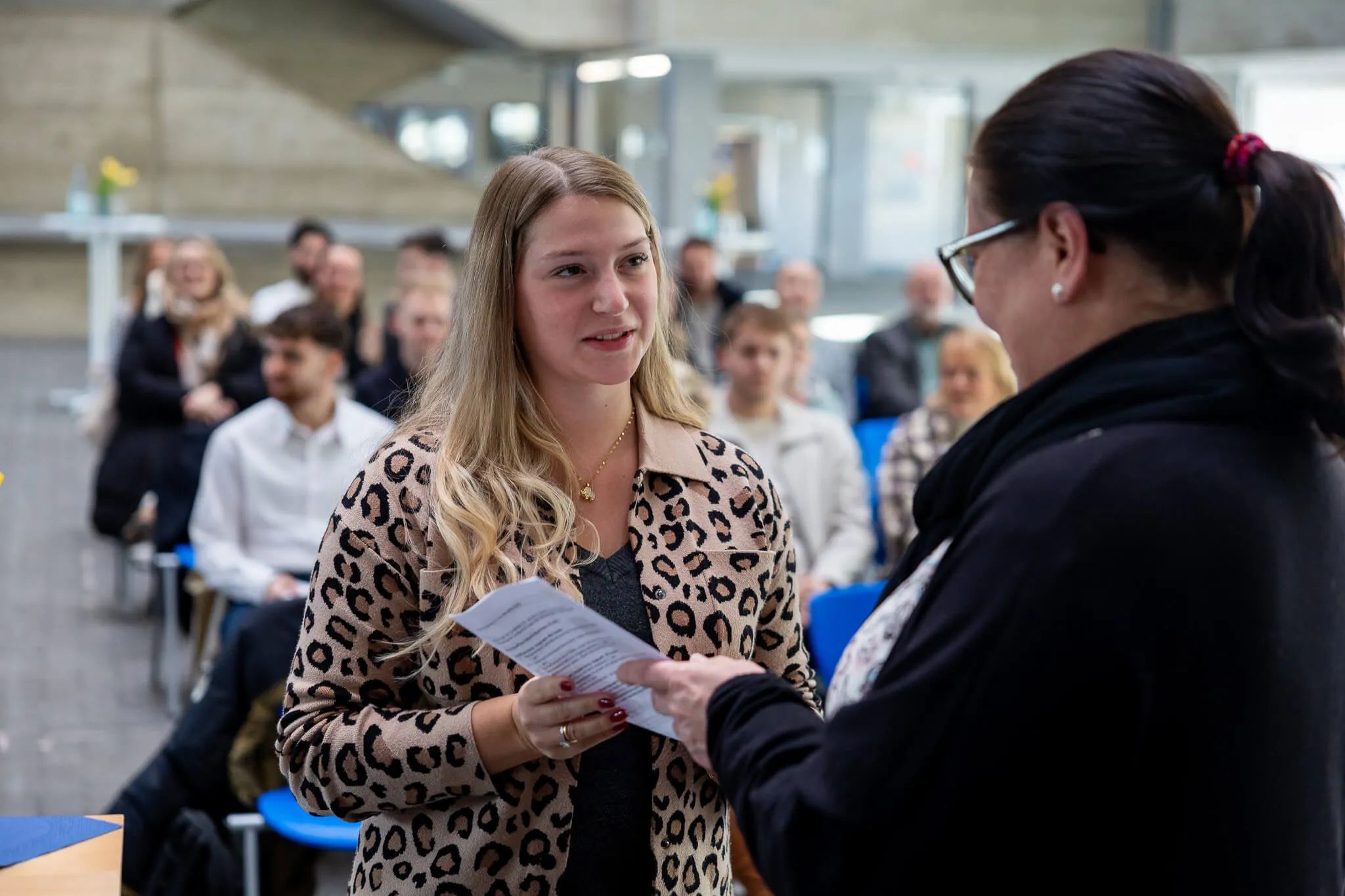 Die Englischlehrerin Laura Häussler überreichte sechs angehenden Industriekaufleuten die Europass-Mobilitätsnachweise für ihre Teilnahme am Erasmus-Programm in Dublin. Das Programm bestand aus einem einwöchigen Sprachkurs sowie einem zweiwöchigen Praktikum in einem irischen Betrieb. In ihrer Ansprache würdigte sie die Offenheit und Flexibilität der Teilnehmenden und blickte gemeinsam mit ihnen auf die Erfahrungen während des Auslandsaufenthalts zurück.