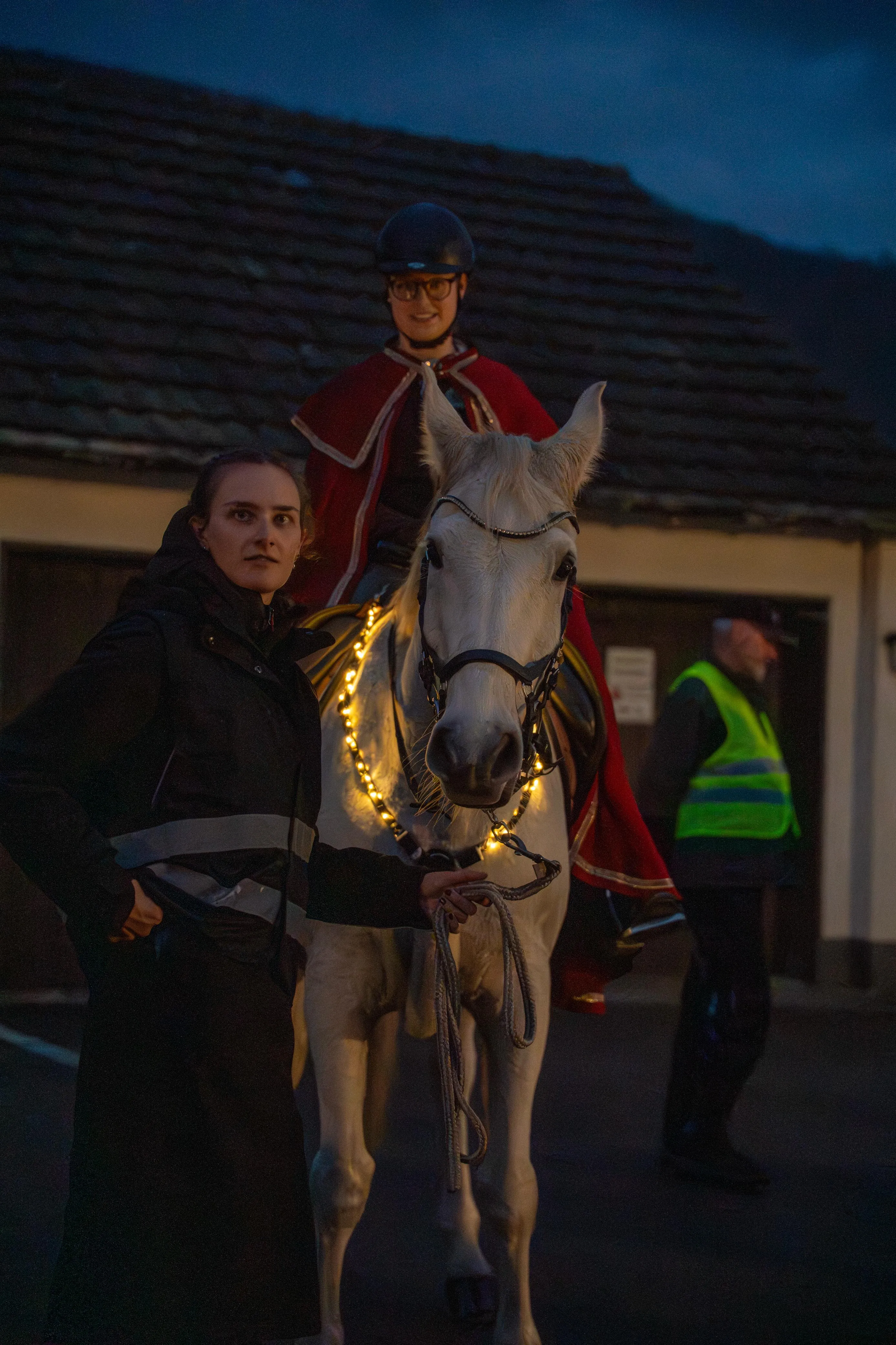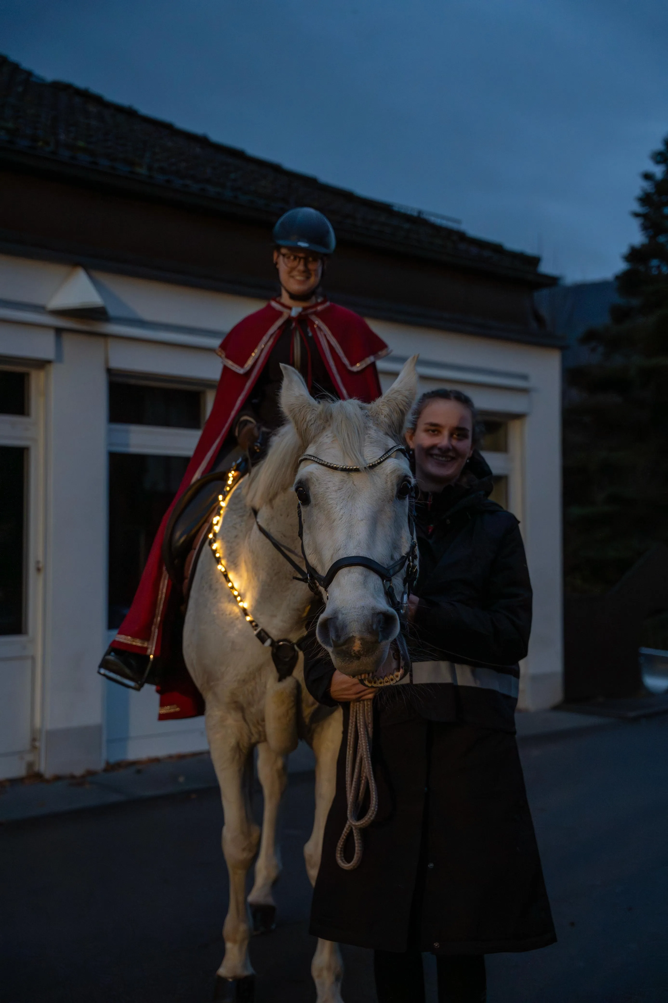 Vorneweg: Schimmel Merlin. Majestätisch, ruhig, scheinbar vertraut mit seiner Aufgabe, trug er den St. Martin durch die Straßen bis zur ehemaligen St.-Josef-Kirche. Viele Kinder schauten staunend zu dem Martin - der vielleicht eher eine Martina war - hinauf. Manche flüsterten ehrfürchtig: „Da ist er.“