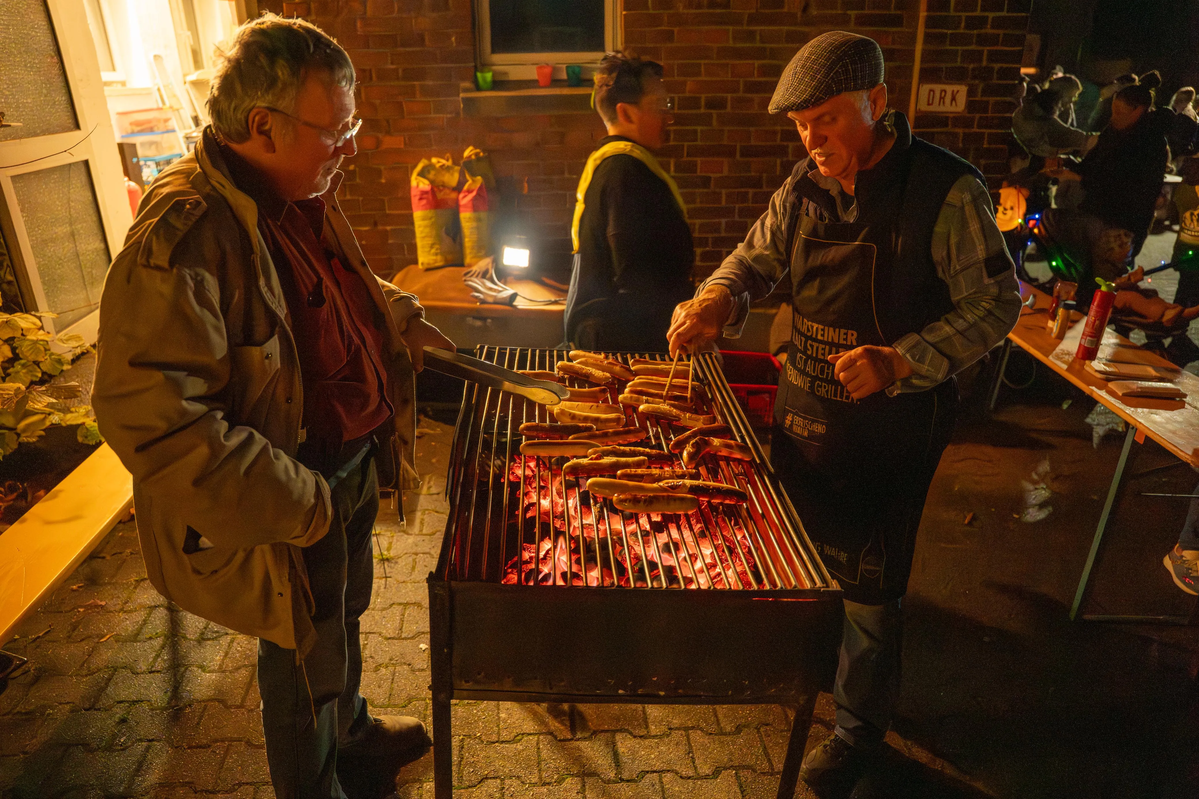 Vor der Kirche begann der gemütlichste Teil des Abends: Bratwurst, Punsch und Brezeln – diesmal zum größten Teil komplett kostenlos. Die Menschen standen zusammen, Kinder wuselten zwischen Beinen hindurch, während der Rauch der Grillstationen in die kalte Luft stieg. Es wurde geplaudert, gelacht, erinnert – und manchmal einfach nur geschaut, wie die Laternen noch ein letztes Mal aufleuchteten.