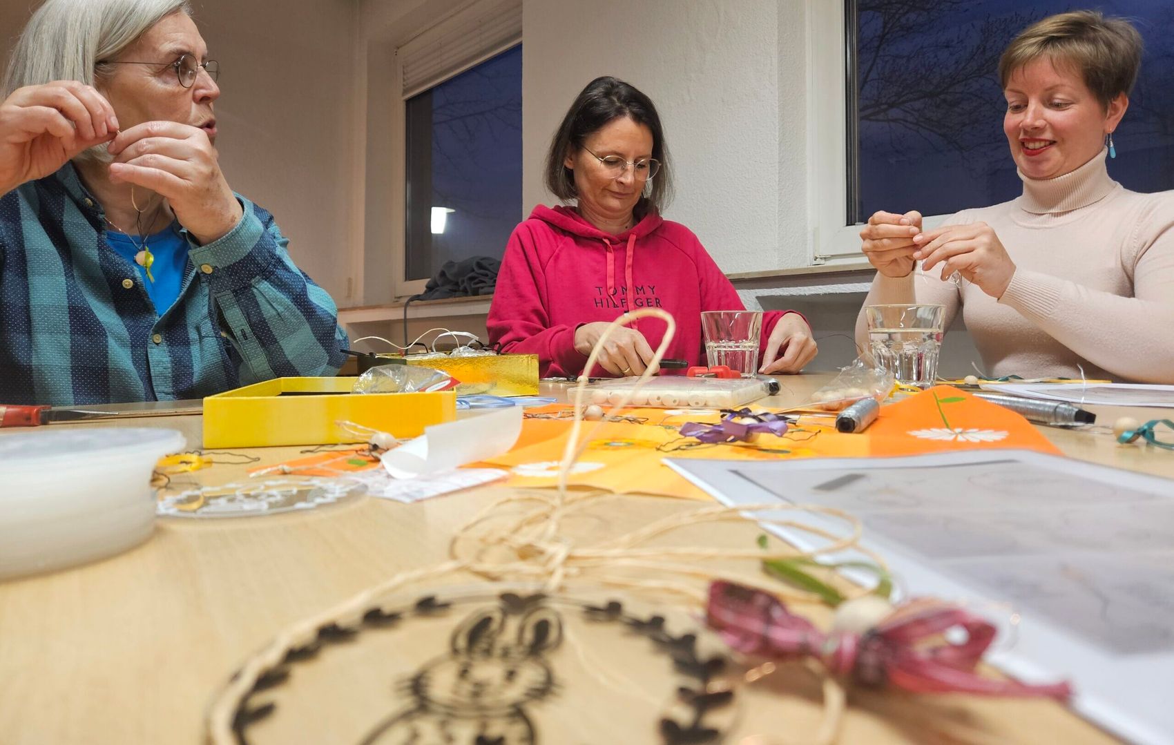 Die Frauen möchten immer abwechselnd etwas anbieten. Zum Auftakt sorgten Martina Fries und Kirsten Steinecke für ein Angebot. „Ich habe kleine Anhänger aus Acrylglas mitgebracht. Diese können mit verschiedenen Oster-Plotts verschönert werden“, zeigt Martina Fries. Doch erst einmal probieren die Frauen die kleinen Draht-Häschen. Schnell entstehen Gespräche. Es geht um alles Mögliche: Kinder, Enkelkinder, das Wetter, den Garten – so bunt wie die Gruppe sind auch die Gesprächsthemen. Und genau das war auch das Ziel der Initiatorinnen: Ein Angebot zu schaffen, in dem Gemeinschaft entsteht und gelebt wird.