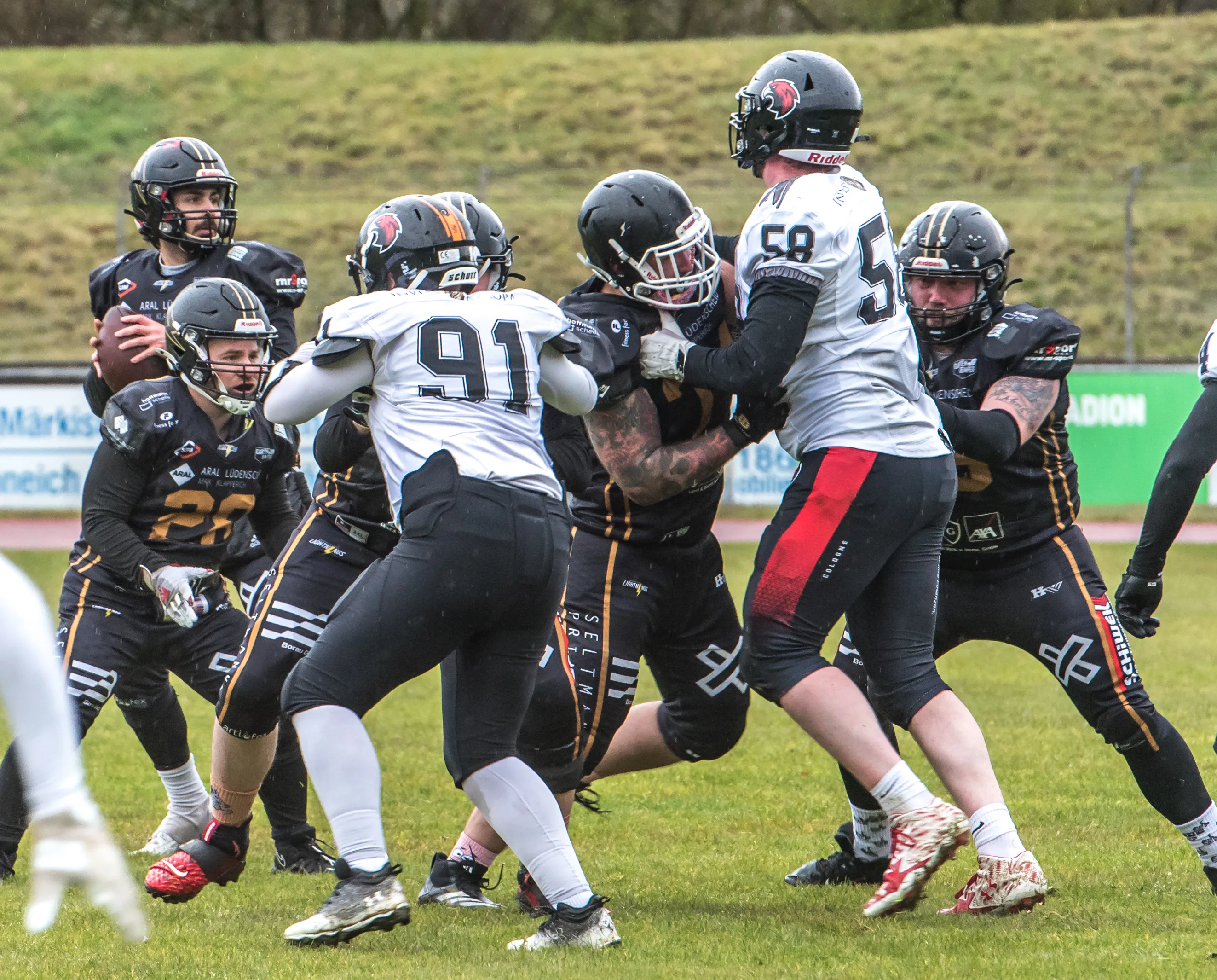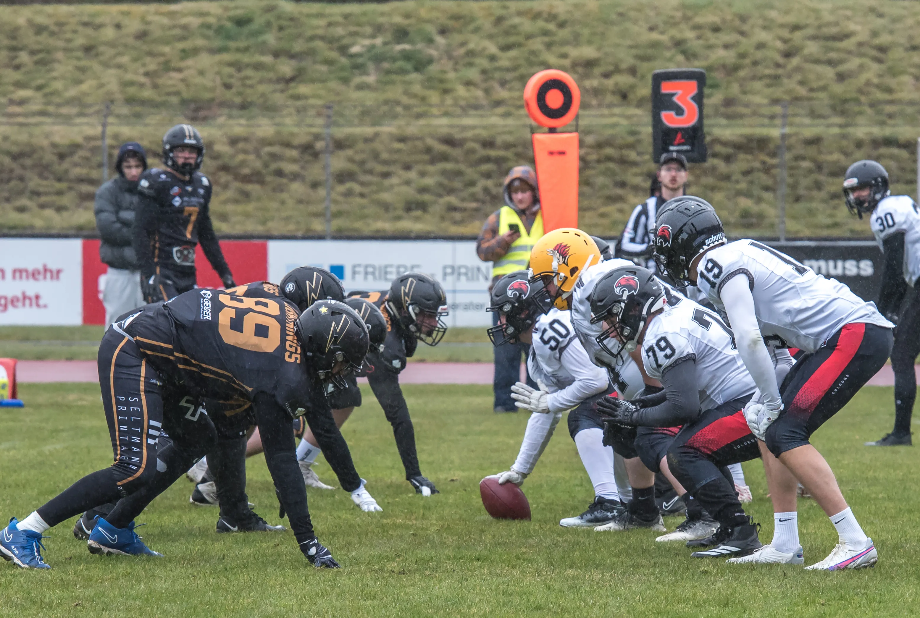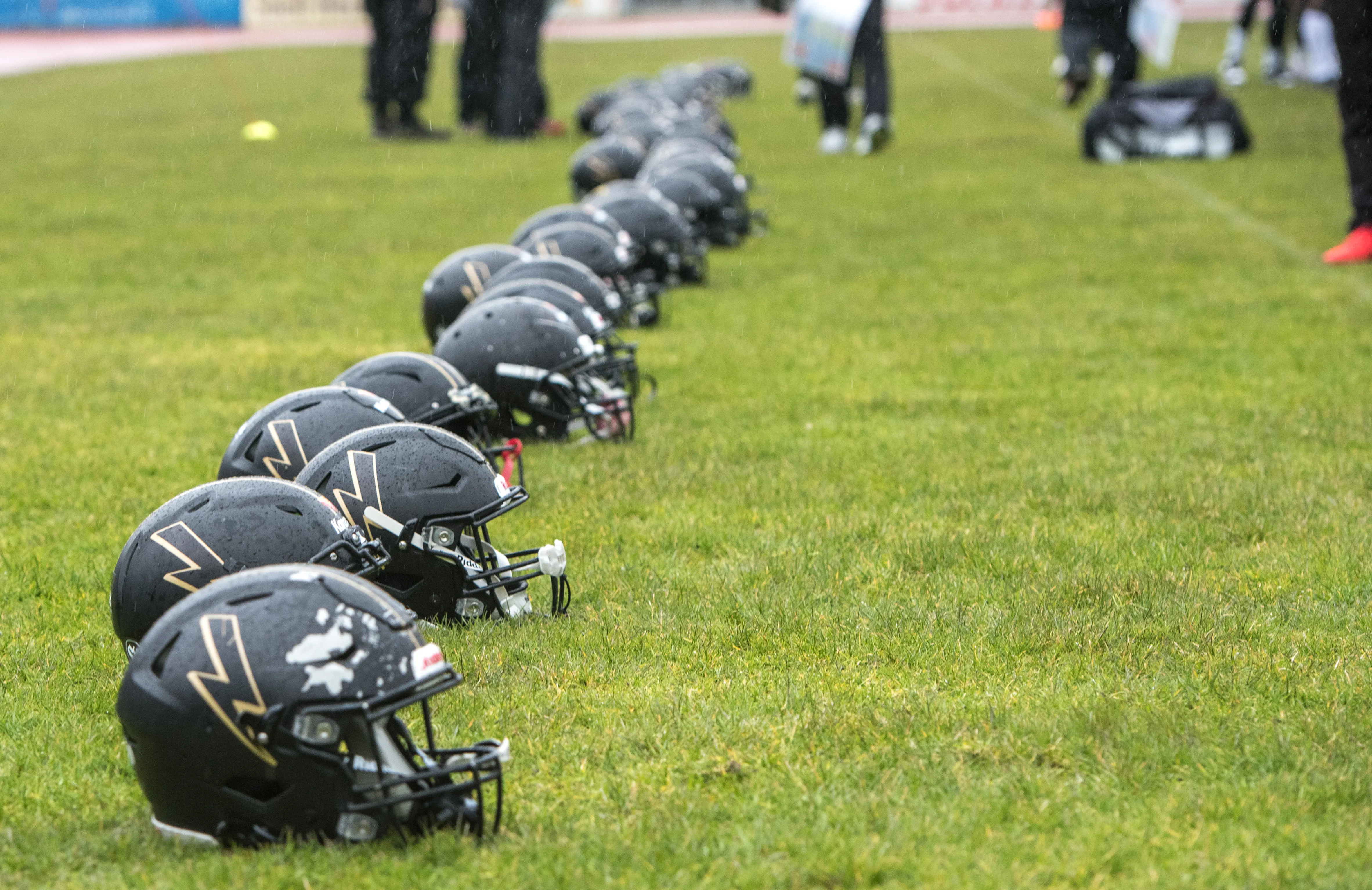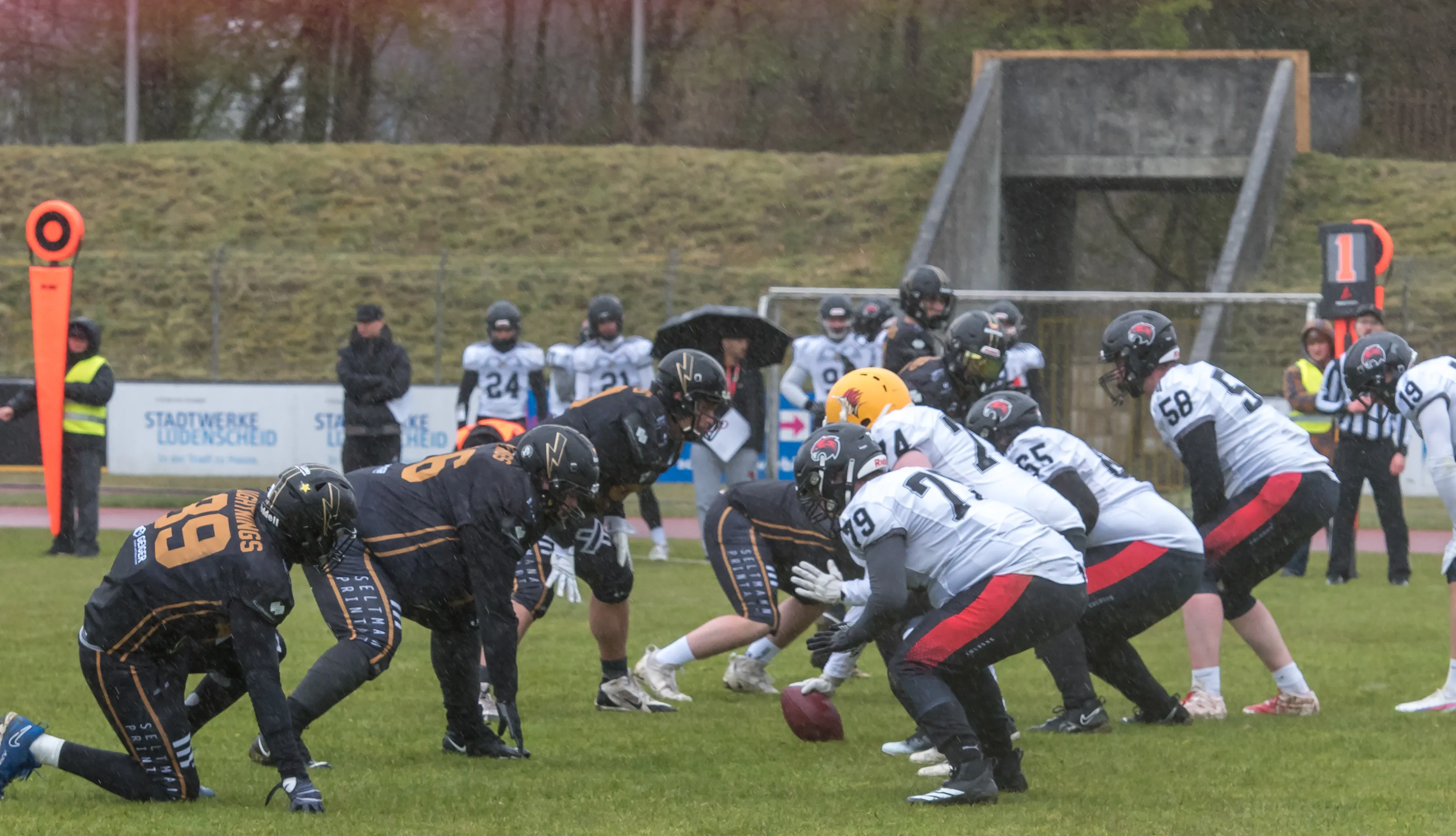 Alles andere als gute Bedingungen herrschten am Samstagnachmittag, 28. März, bei der Saisoneröffnung der Lüdenscheid Lightnings. Bei Regen und Graupel hatten nur rund 250 Zuschauer den Weg ins Lüdenscheider Nattenberg-Stadion gefunden. Auf dem Feld hatten die American Footballer des LTV 61 im ersten Vorbereitungsspiel des Jahres mit Nässe, Kälte und rutschigen Bällen zu kämpfen. Am Ende stand dennoch ein 36:0 (15:0)-Erfolg gegen die Cologne Falcons zu Buche.