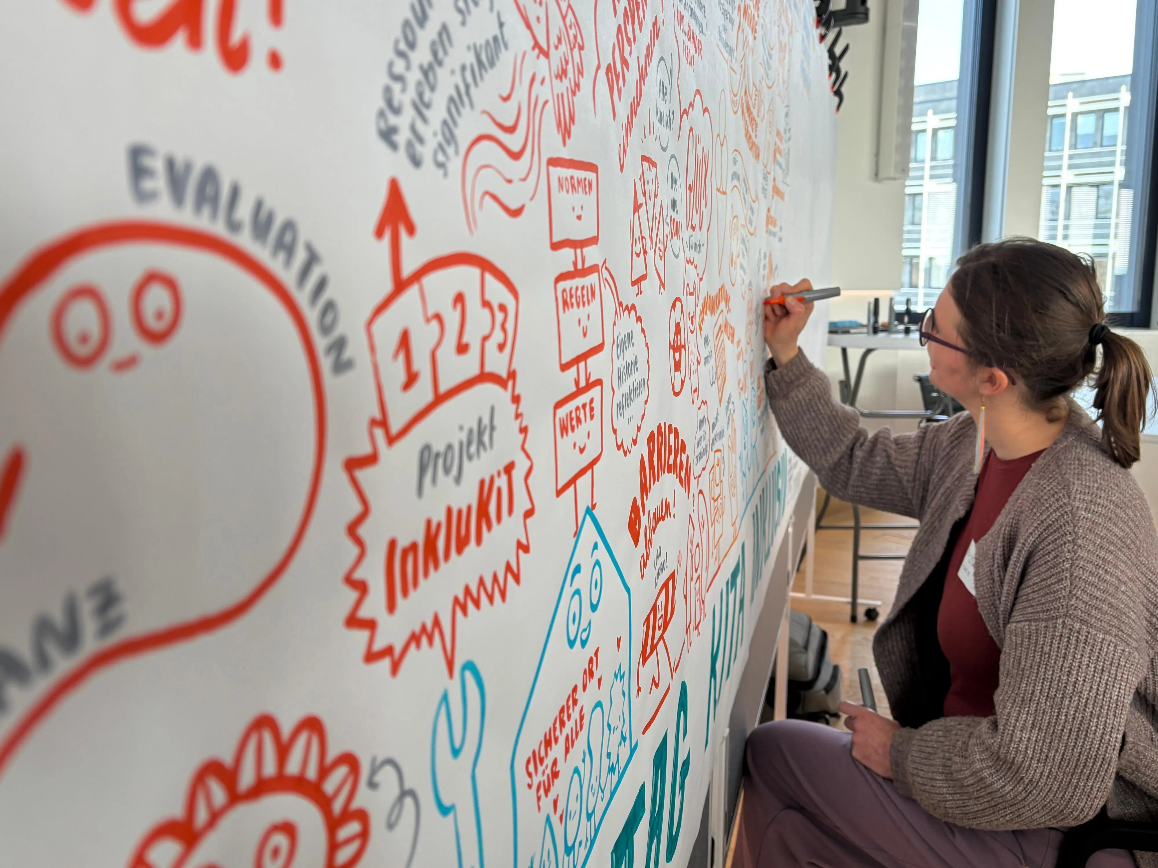 Ein Graphic-Recording dokumentierte außerdem die zentralen Inhalte des Tages visuell und verband die unterschiedlichen Perspektiven miteinander. Mit den farbenfrohen Zeichnungen lud das Bord die Teilnehmer auch in den Pausen dazu ein, sich noch einmal über die Fachvorträge auszutauschen. Im Abschlussplenum wurden Eindrücke zusammengeführt und in den weiteren Entwicklungsprozess der Kitalandschaft im Zuständigkeitsbereich des Kreisjugendamtes eingeordnet.